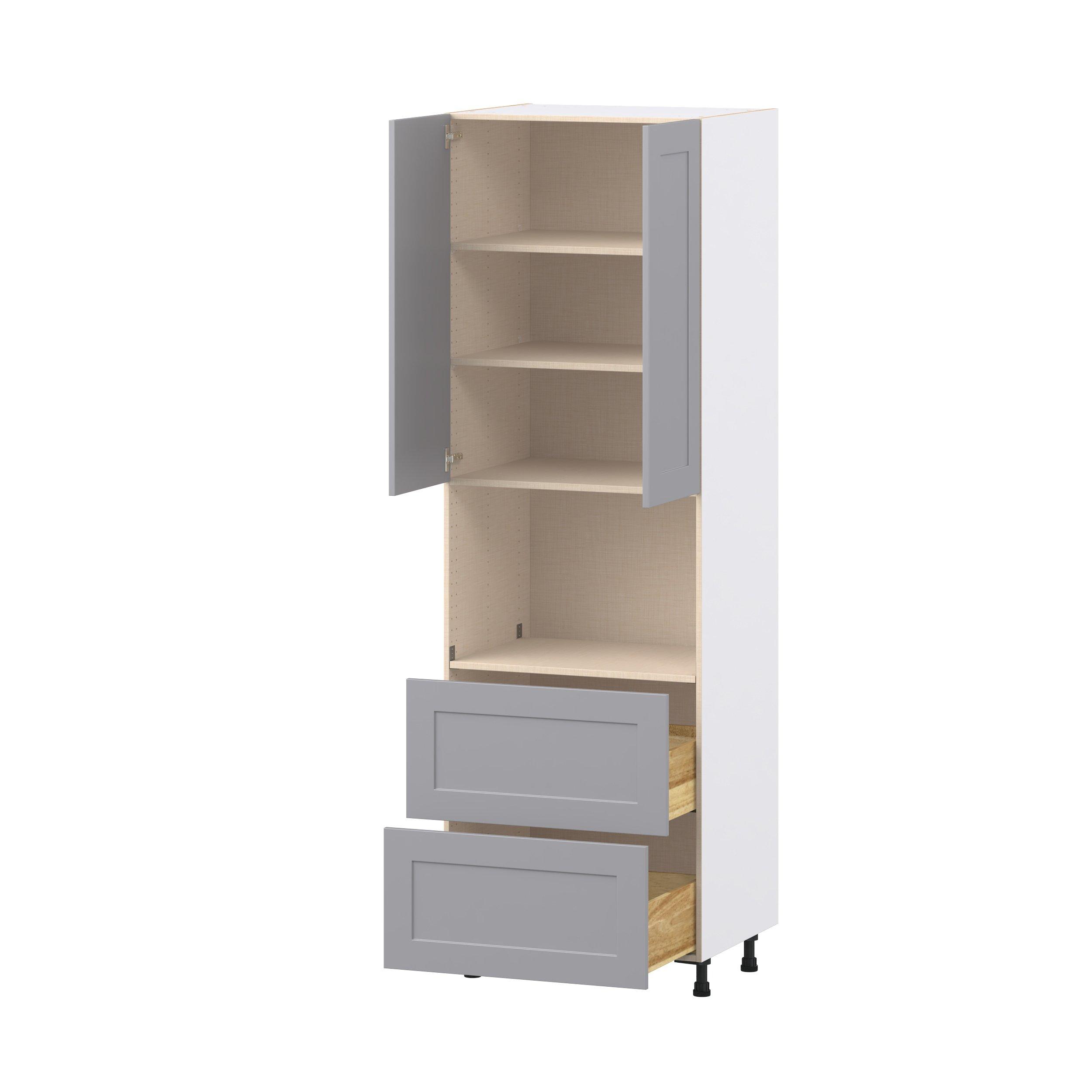 Transform your space with the elegance of Candler wide-rail shaker styles. Both the warm white and slate gray options create a rich transitional backdrop to complement any decor. Crafted from one-piece MDF Studio Design Collection Candler 30 in. Painted Slate Gray Door and Drawer Microwave Pantry Cabinet is designed to resist hairline cracks while the easy-to-clean finish stands up to stains and moisture. Featuring 5-piece doors and dovetail drawer joints, these cabinets offer durability and elegance. This collection combines style with everyday storage solutions.