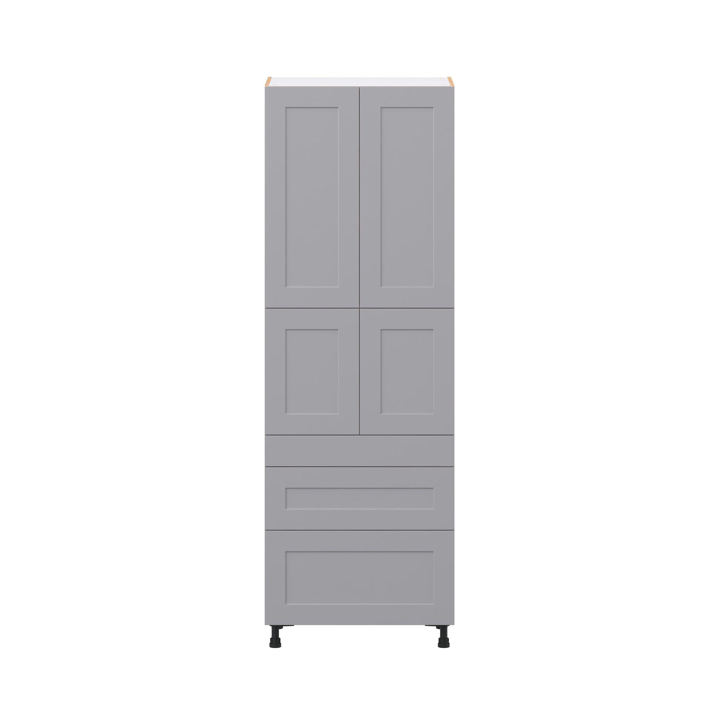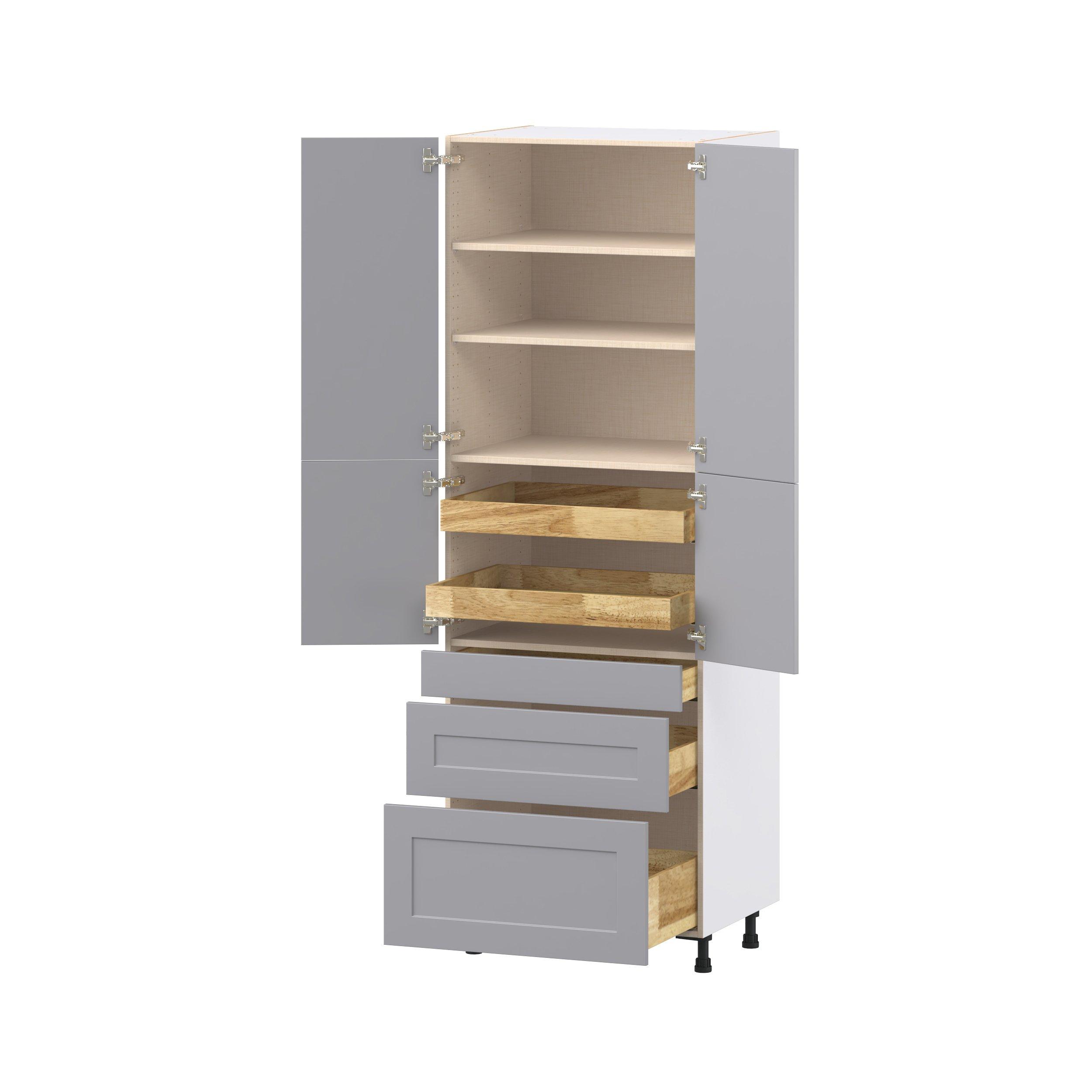 Transform your space with the elegance of Candler wide-rail shaker styles. Both the warm white and slate gray options create a rich transitional backdrop to complement any decor. Crafted from one-piece MDF Studio Design Collection Candler 30 in. Painted Slate Gray Door and Drawer Pantry Cabinet with Inner Pull-Out is designed to resist hairline cracks while the easy-to-clean finish stands up to stains and moisture. Featuring 5-piece doors and dovetail drawer joints, these cabinets offer durability and elegance. This collection combines style with everyday storage solutions.