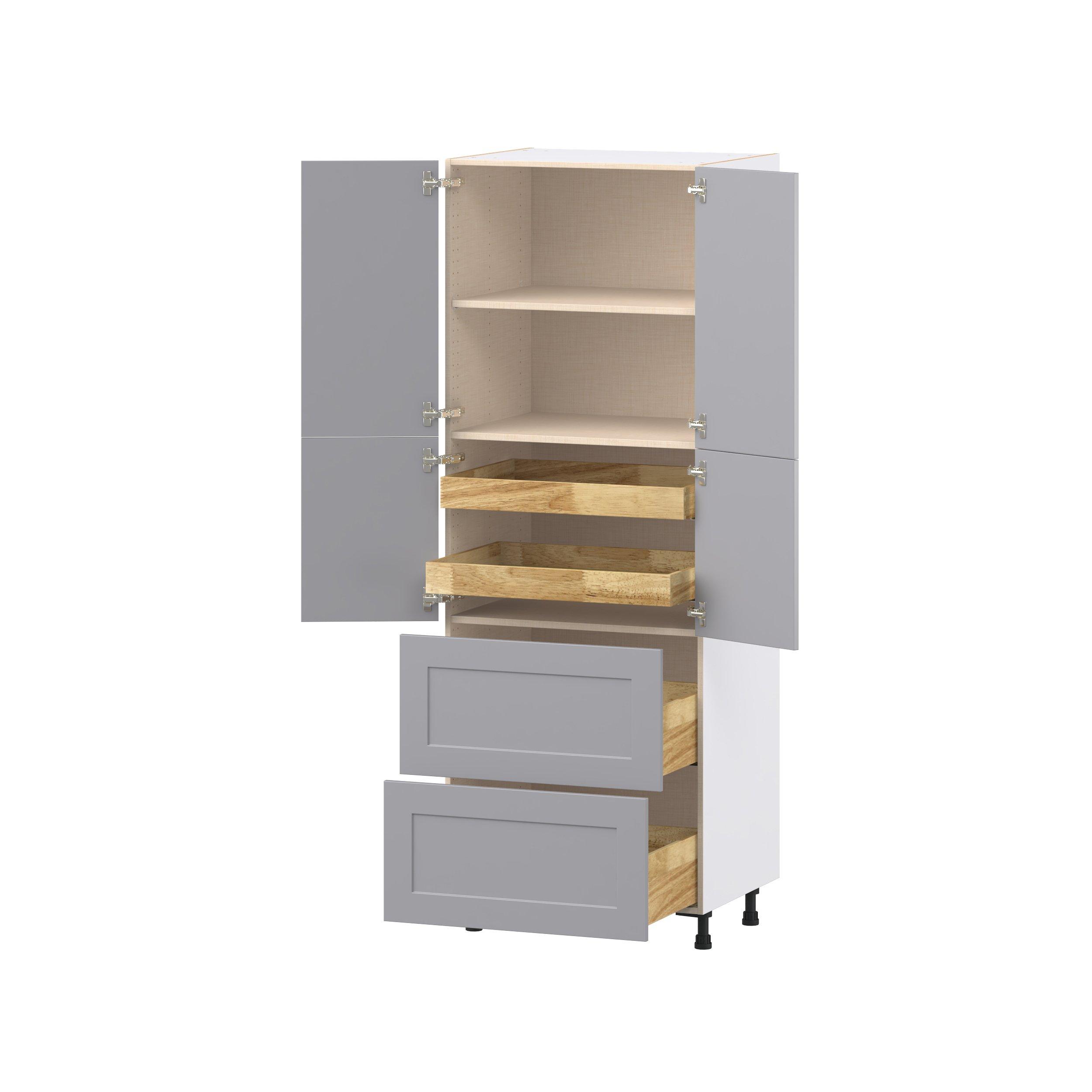 Transform your space with the elegance of Candler wide-rail shaker styles. Both the warm white and slate gray options create a rich transitional backdrop to complement any decor. Crafted from one-piece MDF Studio Design Collection Candler 30 in. Painted Slate Gray Door and Drawer Pantry Cabinet with Inner Pull-Out is designed to resist hairline cracks while the easy-to-clean finish stands up to stains and moisture. Featuring 5-piece doors and dovetail drawer joints, these cabinets offer durability and elegance. This collection combines style with everyday storage solutions.
