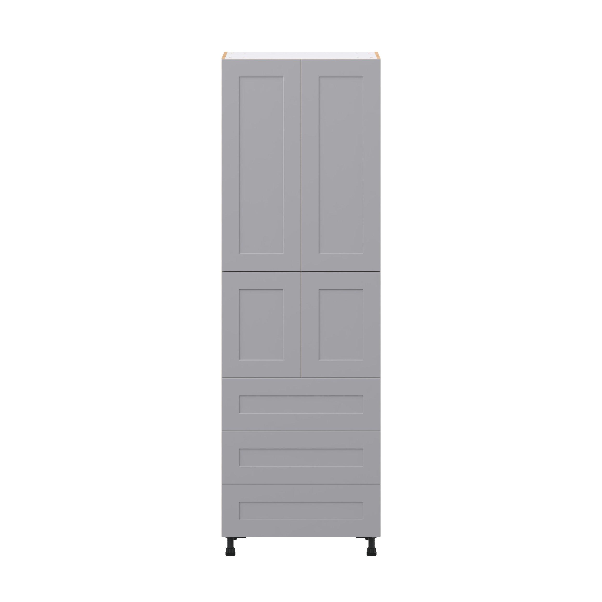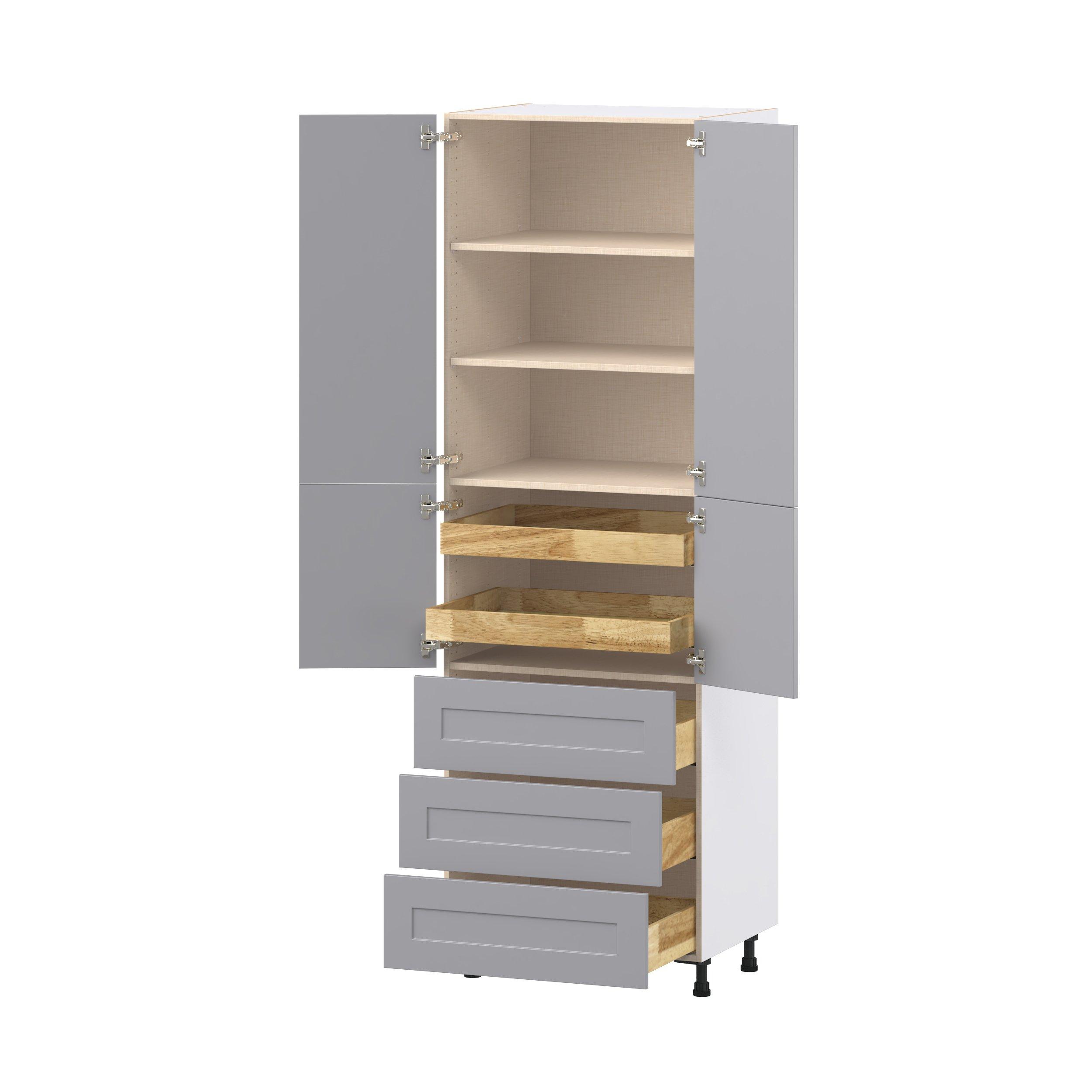 Transform your space with the elegance of Candler wide-rail shaker styles. Both the warm white and slate gray options create a rich transitional backdrop to complement any decor. Crafted from one-piece MDF Studio Design Collection Candler 30 in. Painted Slate Gray Door and Drawer Pantry Cabinet with Inner Pull-Out is designed to resist hairline cracks while the easy-to-clean finish stands up to stains and moisture. Featuring 5-piece doors and dovetail drawer joints, these cabinets offer durability and elegance. This collection combines style with everyday storage solutions.