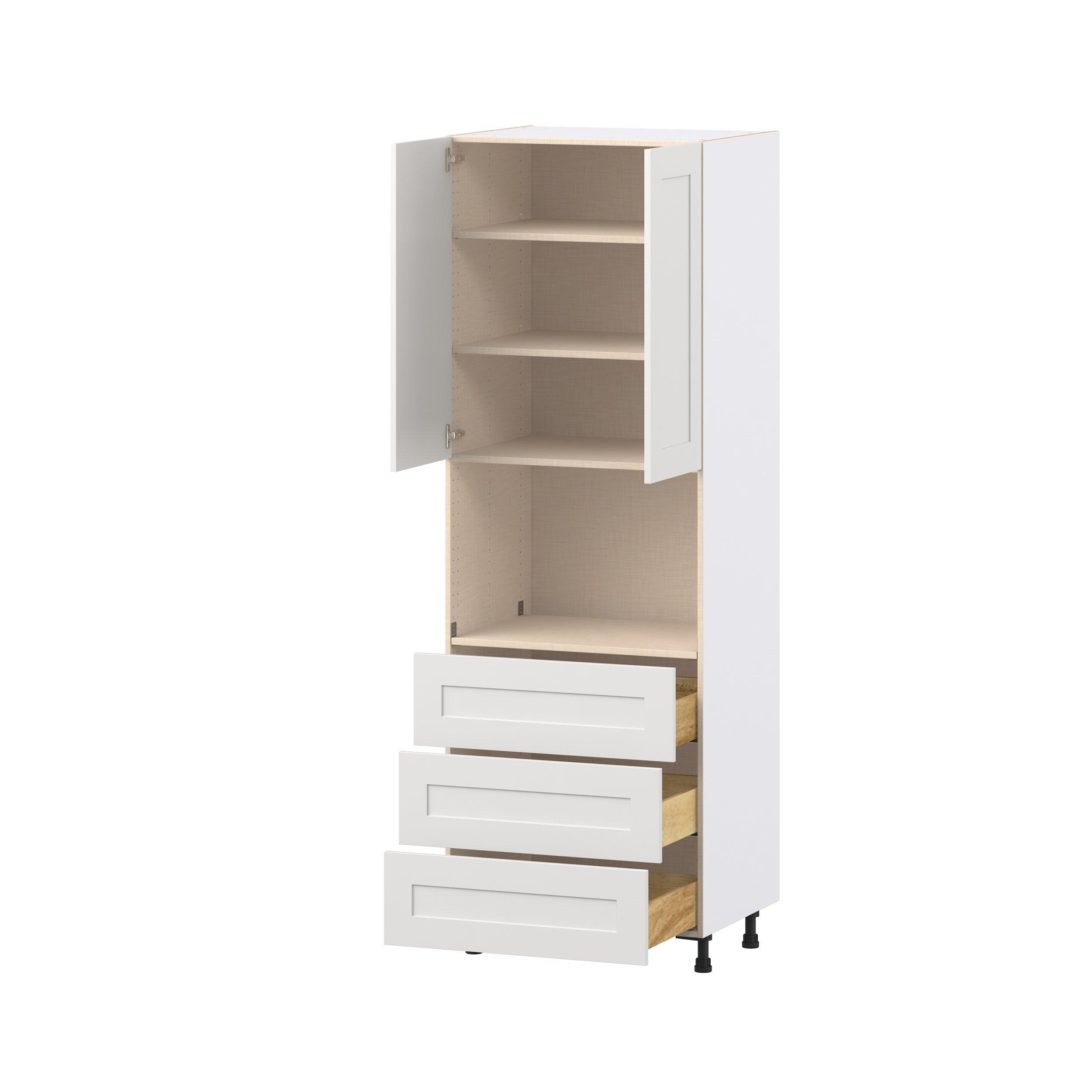 Transform your space with the elegance of Candler wide-rail shaker styles. Both the warm white and slate gray options create a rich transitional backdrop to complement any decor. Crafted from one-piece MDF Studio Design Collection Candler 30 in. Painted Warm White Door and Drawer Microwave Pantry Cabinet is designed to resist hairline cracks while the easy-to-clean finish stands up to stains and moisture. Featuring 5-piece doors and dovetail drawer joints, these cabinets offer durability and elegance. This collection combines style with everyday storage solutions.