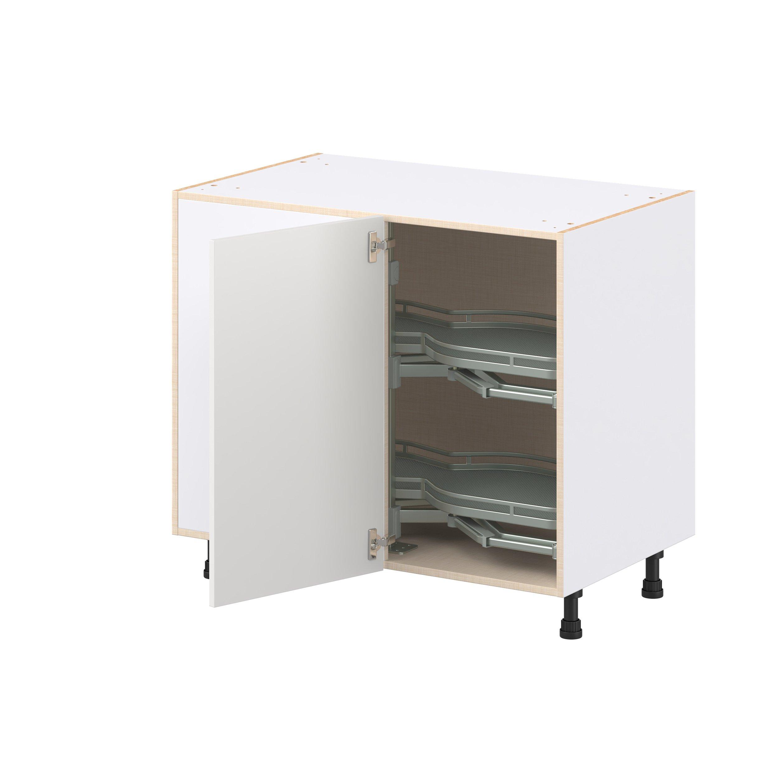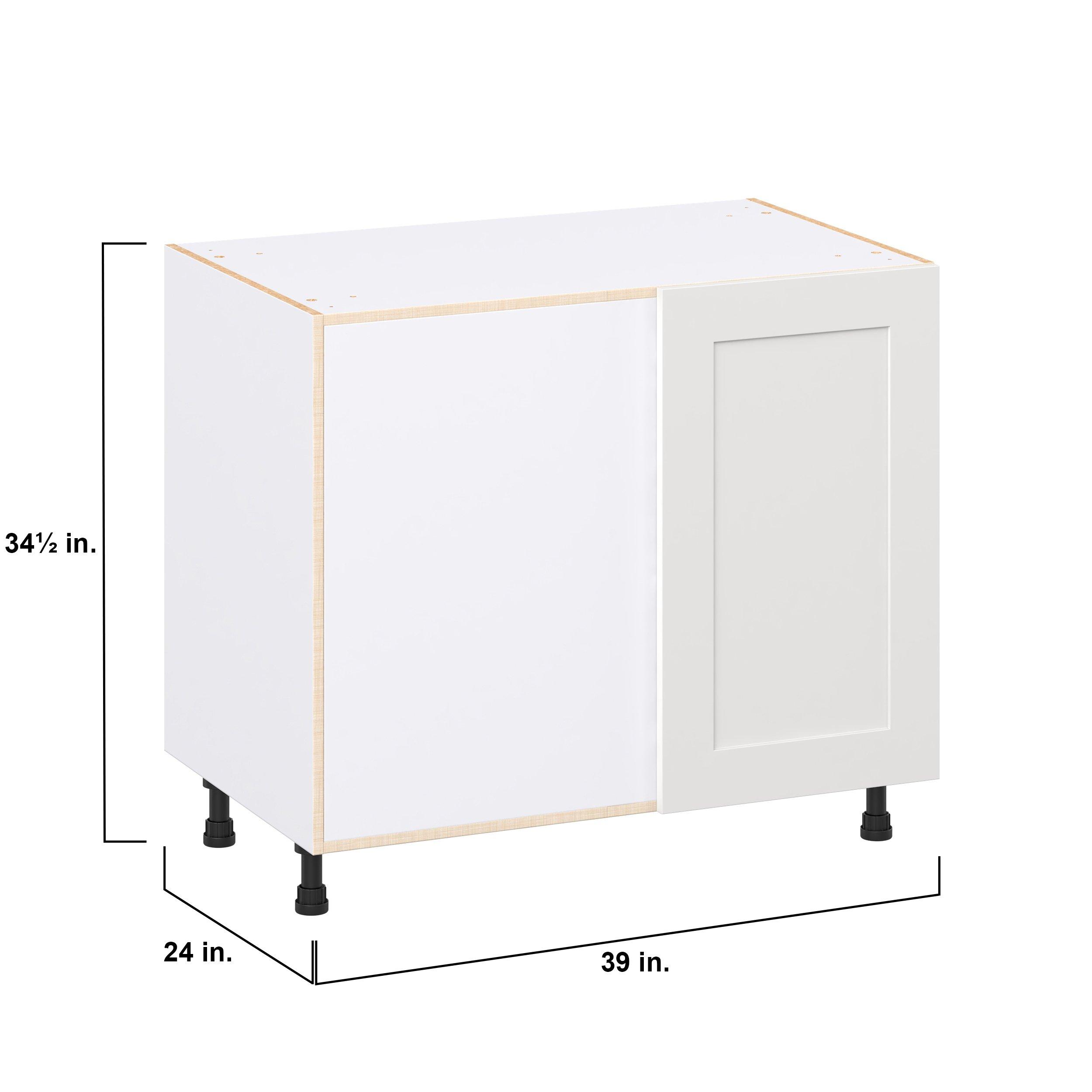 Transform your space with the elegance of Candler wide-rail shaker styles. Both the warm white and slate gray options create a rich transitional backdrop to complement any decor. Crafted from one-piece MDF Studio Design Collection Candler 39 in. Painted Warm White Lemans Swing Out Blind Corner Base Cabinet is designed to resist hairline cracks while the easy-to-clean finish stands up to stains and moisture. Featuring 5-piece doors and dovetail drawer joints, these cabinets offer durability and elegance. This collection combines style with everyday storage solutions.