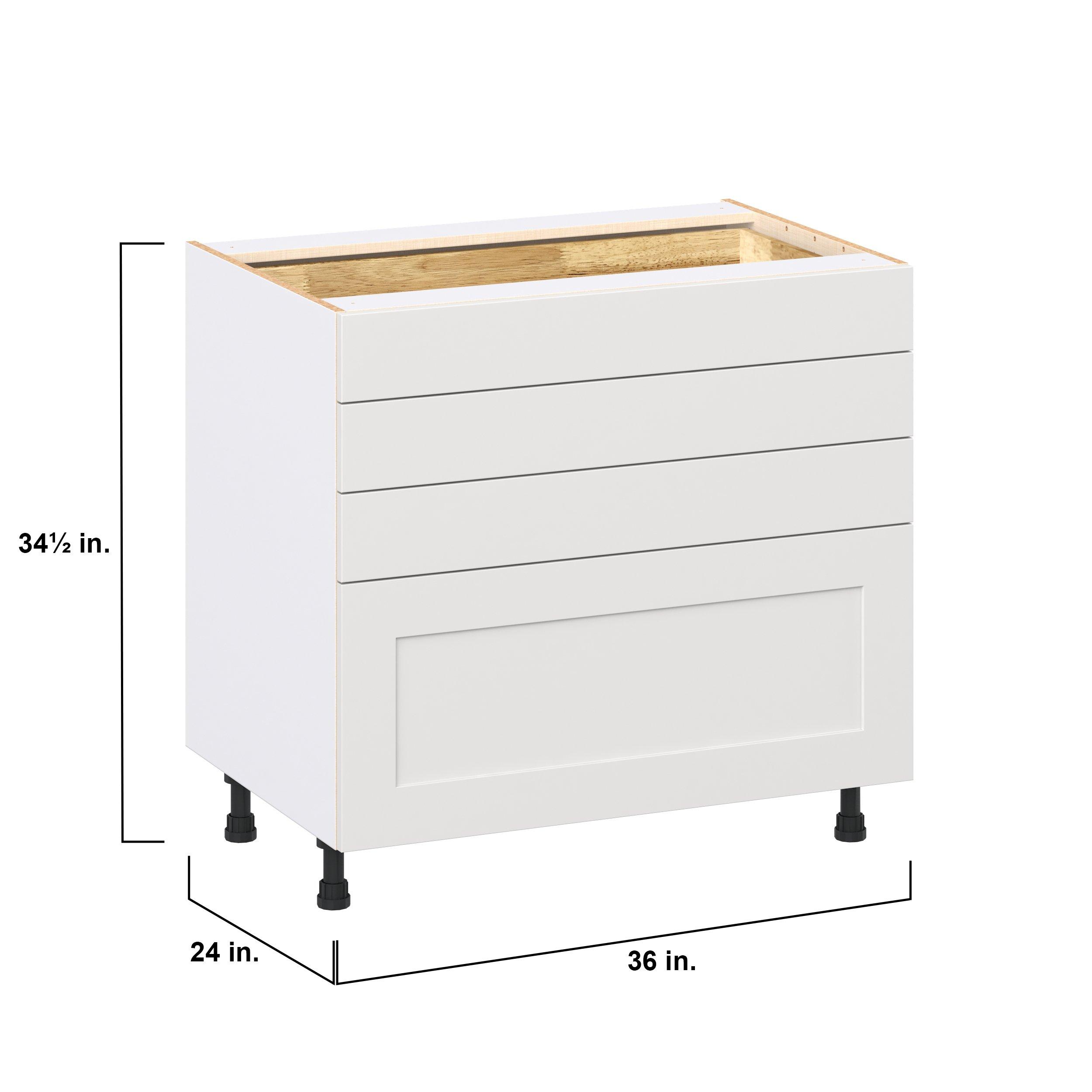 Transform your space with the elegance of Candler wide-rail shaker styles. Both the warm white and slate gray options create a rich transitional backdrop to complement any decor. Crafted from one-piece MDF Studio Design Collection Candler 36 in. Painted Warm White Drawer Base Cabinet is designed to resist hairline cracks while the easy-to-clean finish stands up to stains and moisture. Featuring 5-piece doors and dovetail drawer joints, these cabinets offer durability and elegance. This collection combines style with everyday storage solutions.