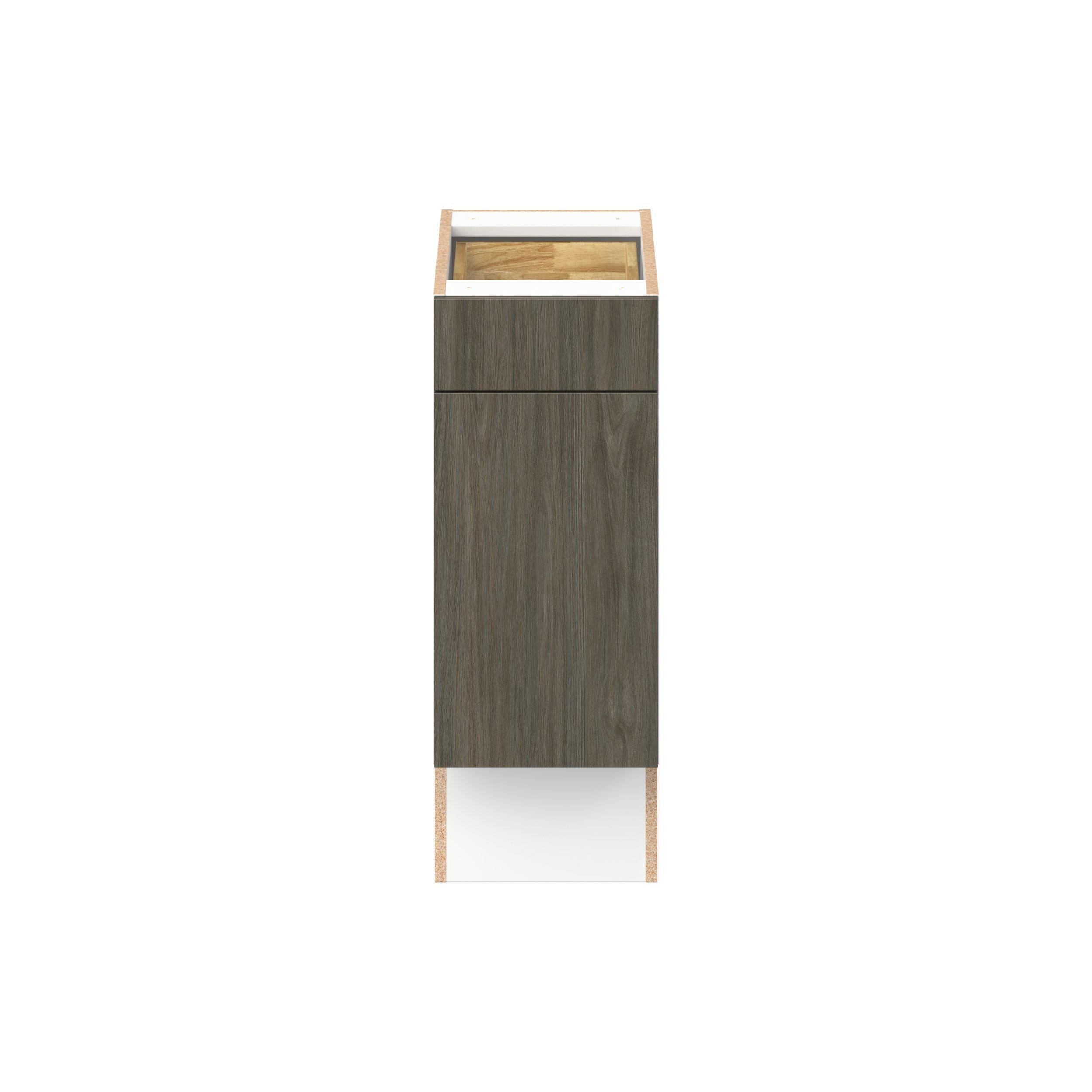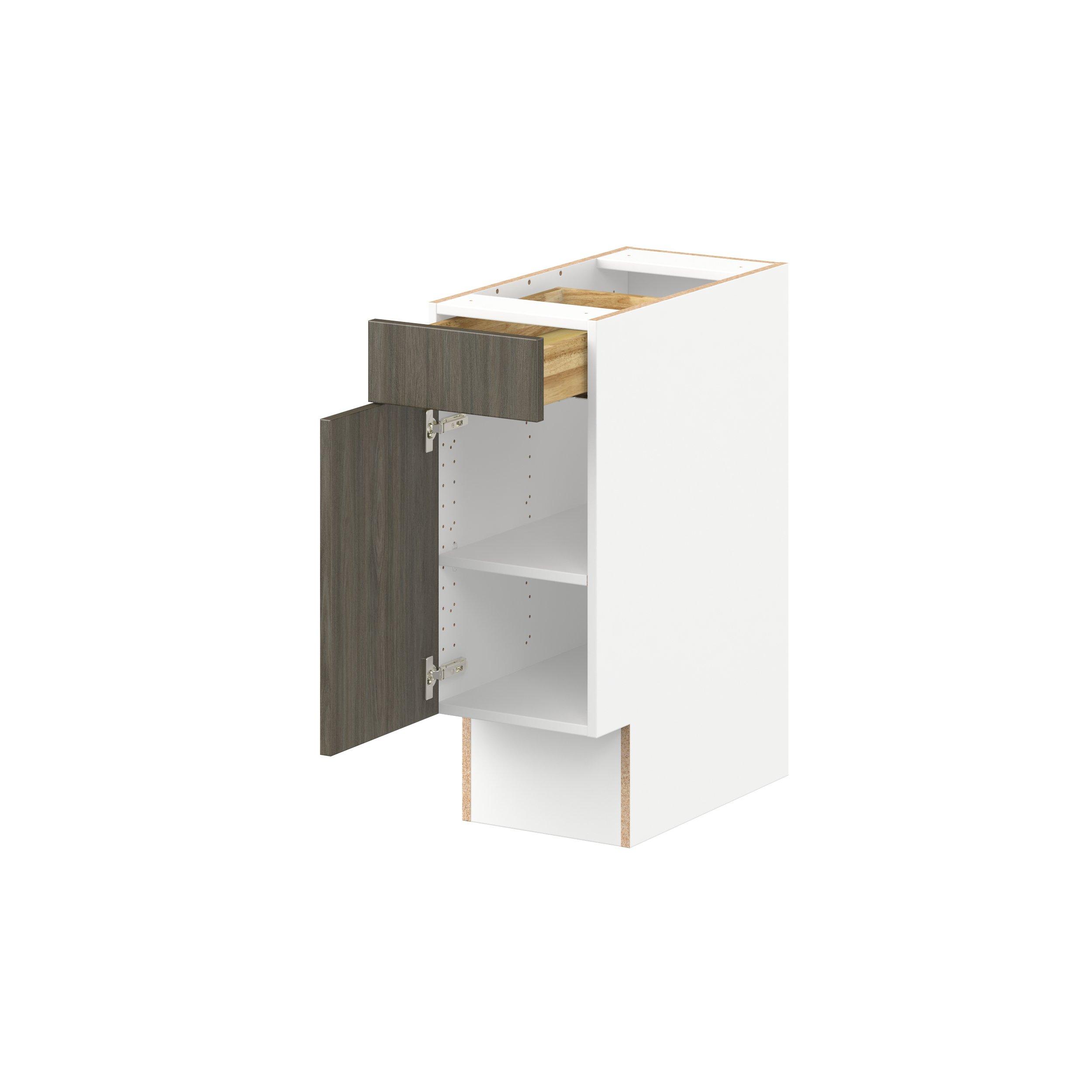 Elevate your project with the contemporary charm of Glenwood slab-style cabinets. Available in desert Mojavi oak and rich burnt walnut finishes, this collection captures the warmth and beauty of natural wood with the practicality of textured melamine. Crafted from one-piece MDF Studio Design Collection Glenwood 12 in. Burnt Walnut Door and Drawer Base Cabinet - ADA is designed to resist hairline cracks while the easy-to-clean finish stands up to stains and moisture. Featuring 5-piece doors and dovetail drawer joints, these cabinets offer durability and elegance. This collection combines style with everyday storage solutions.