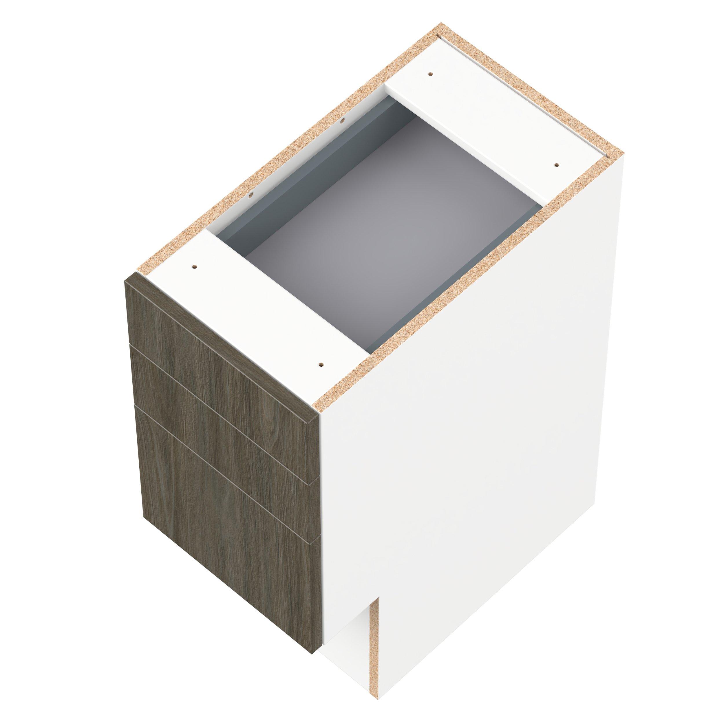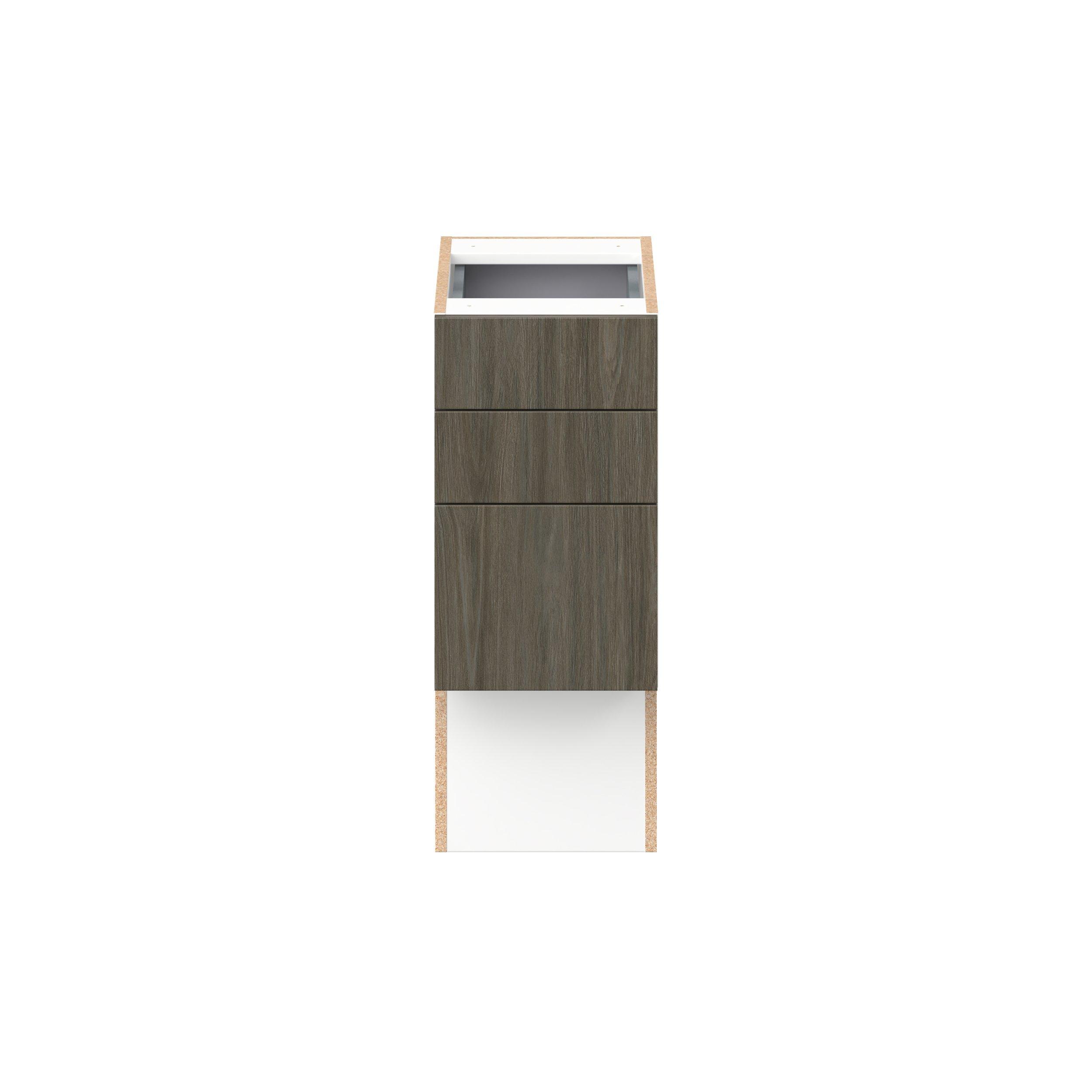 Elevate your project with the contemporary charm of Glenwood slab-style cabinets. Available in desert Mojavi oak and rich burnt walnut finishes, this collection captures the warmth and beauty of natural wood with the practicality of textured melamine. Crafted from one-piece MDF Studio Design Collection Glenwood 12 in. Burnt Walnut Vanity Drawer Base Cabinet - ADA is designed to resist hairline cracks while the easy-to-clean finish stands up to stains and moisture. Featuring 5-piece doors and dovetail drawer joints, these cabinets offer durability and elegance. This collection combines style with everyday storage solutions.