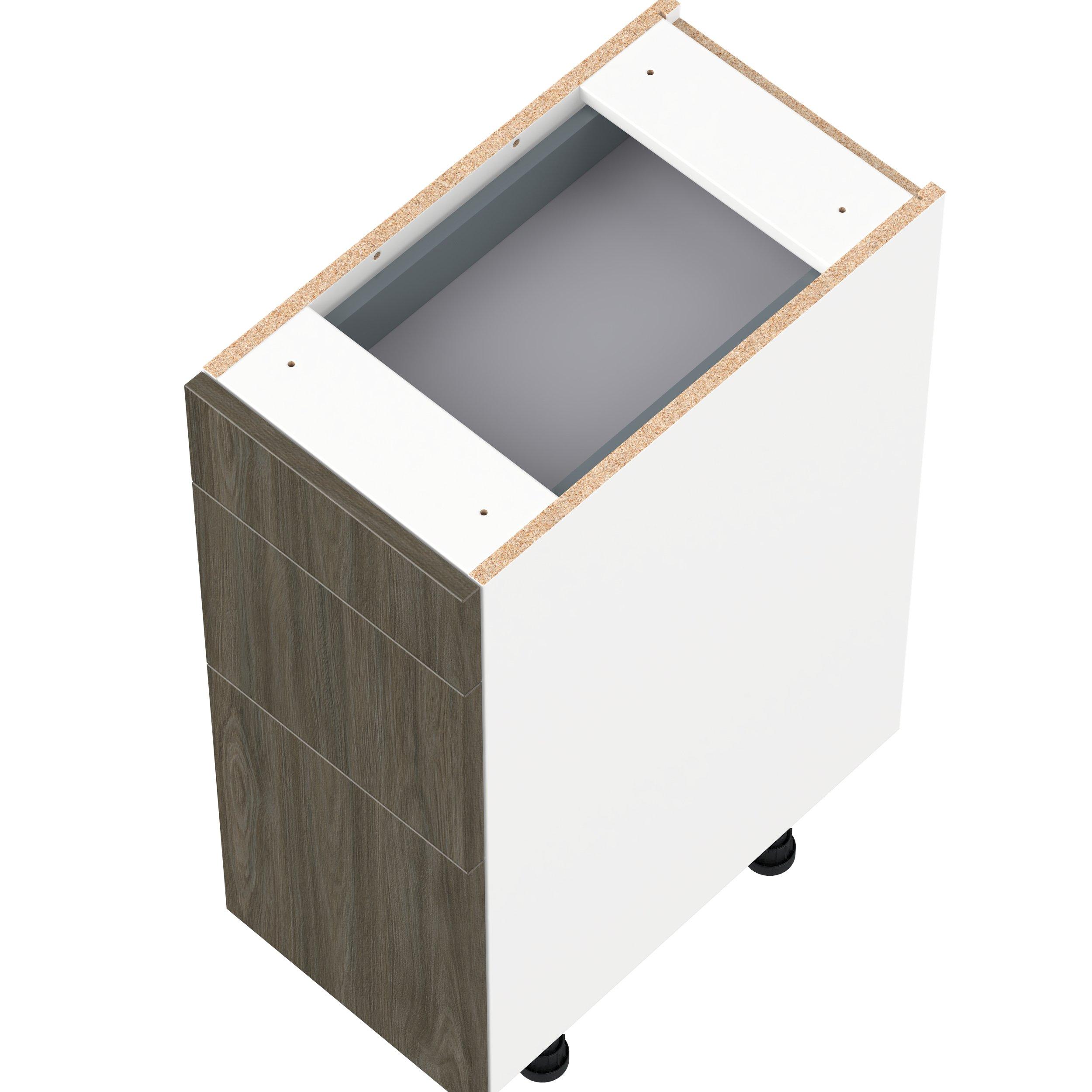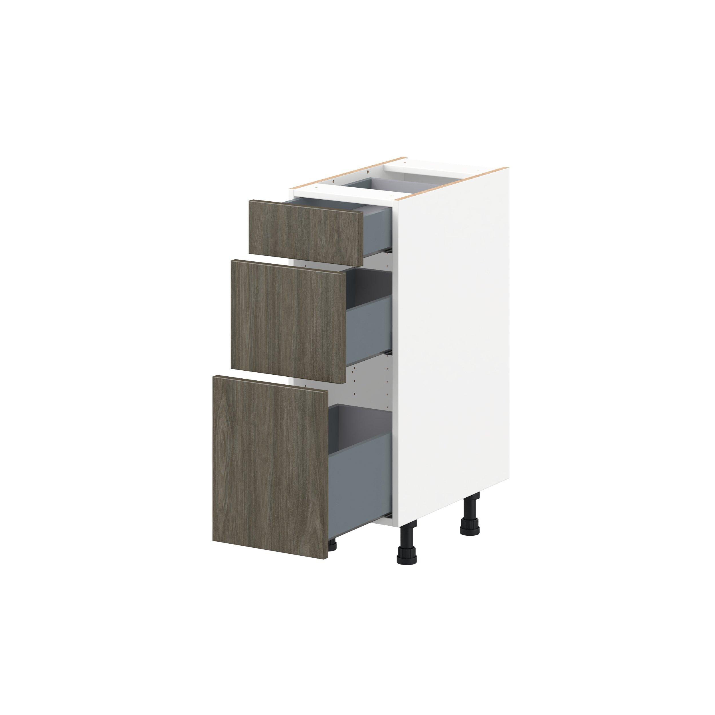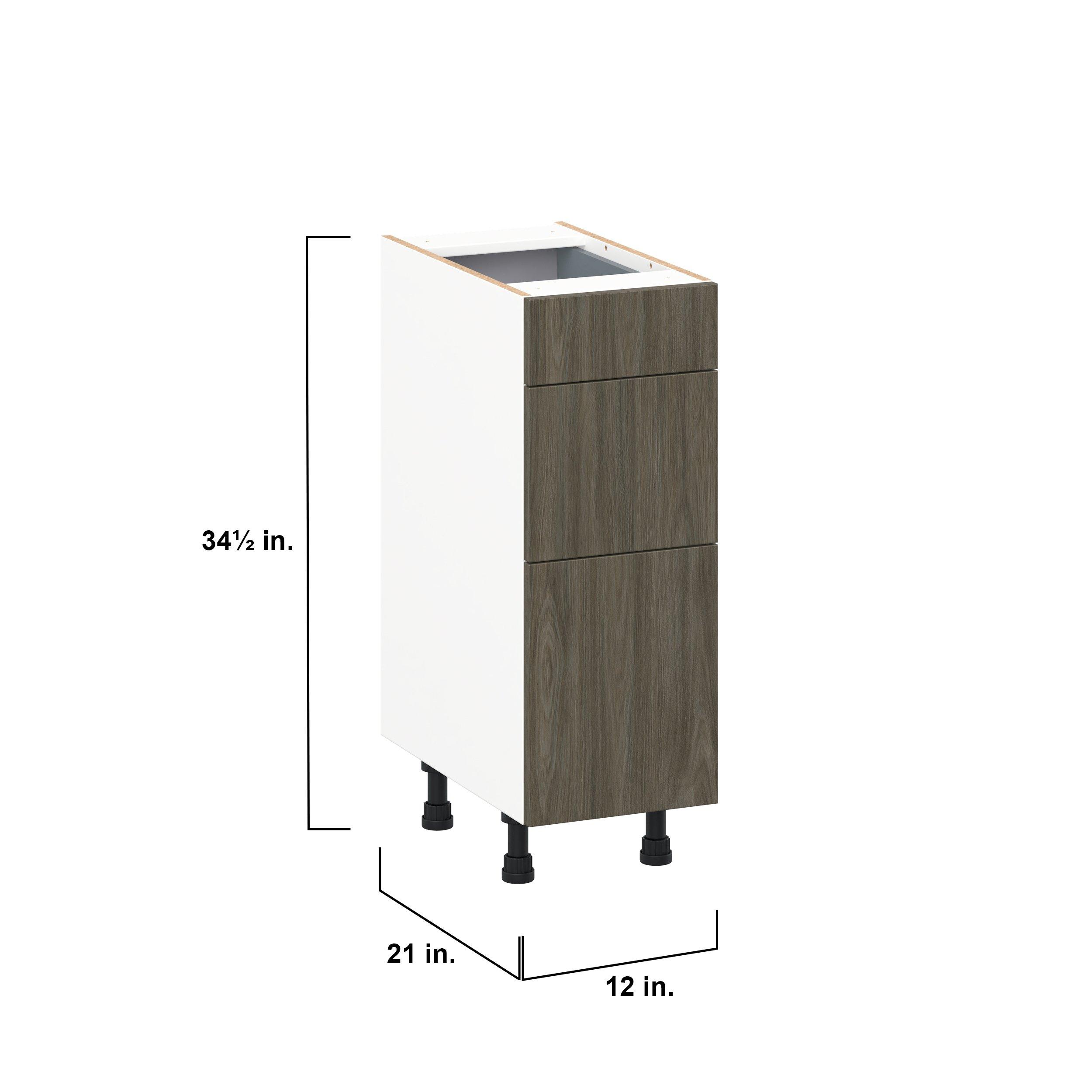 Elevate your project with the contemporary charm of Glenwood slab-style cabinets. Available in desert Mojavi oak and rich burnt walnut finishes, this collection captures the warmth and beauty of natural wood with the practicality of textured melamine. Crafted from one-piece MDF Studio Design Collection Glenwood 12 in. Burnt Walnut Vanity Drawer Base Cabinet - ADA is designed to resist hairline cracks while the easy-to-clean finish stands up to stains and moisture. Featuring 5-piece doors and dovetail drawer joints, these cabinets offer durability and elegance. This collection combines style with everyday storage solutions.