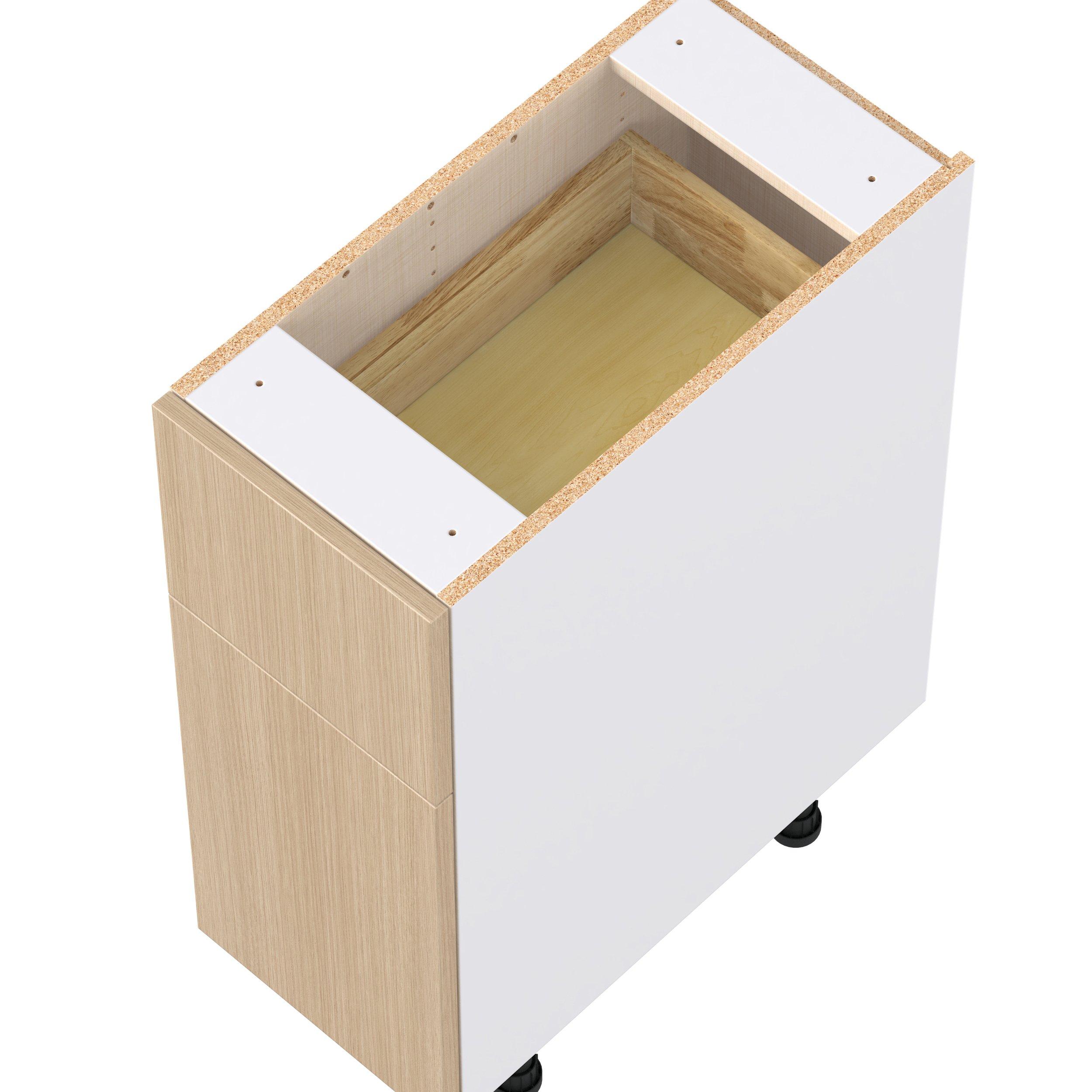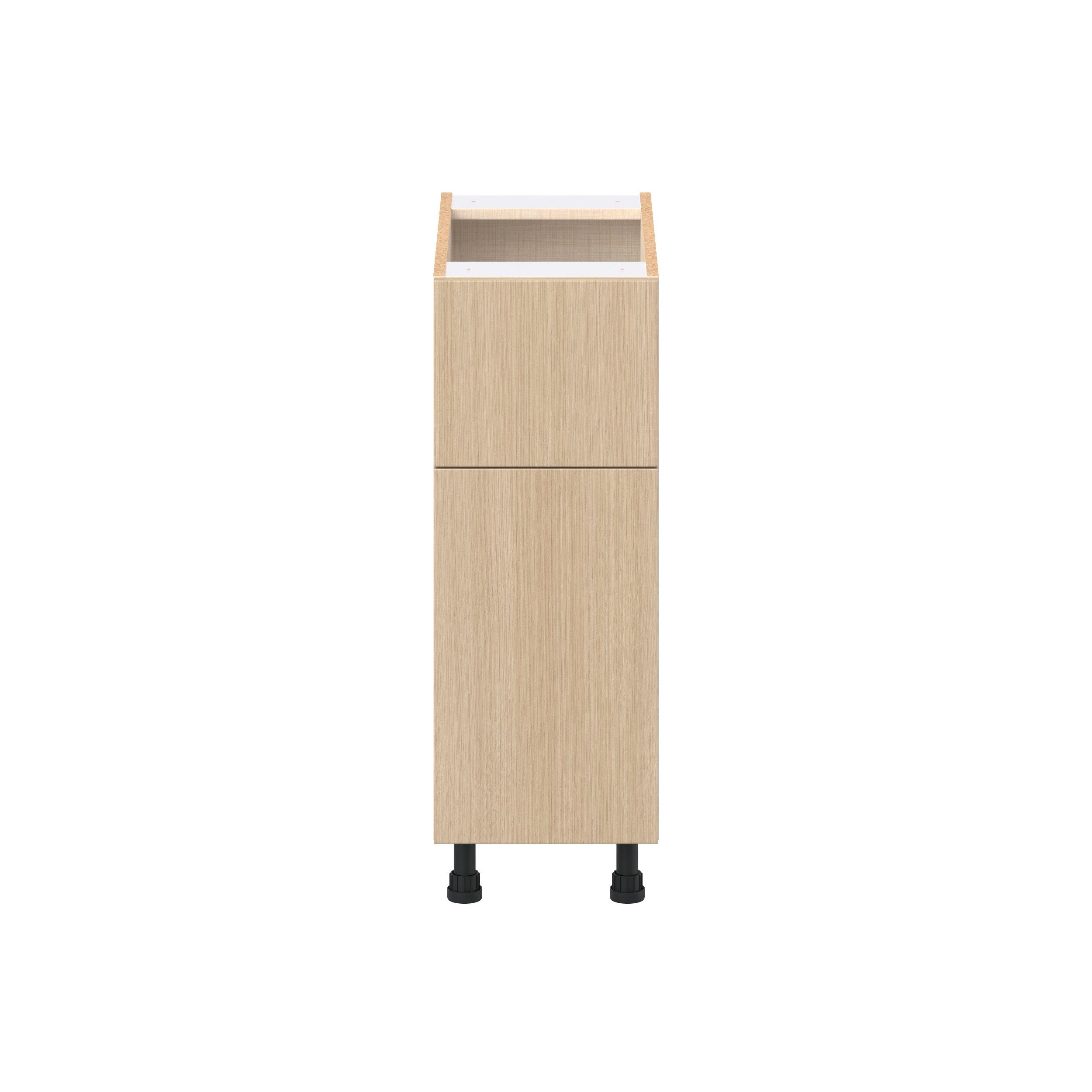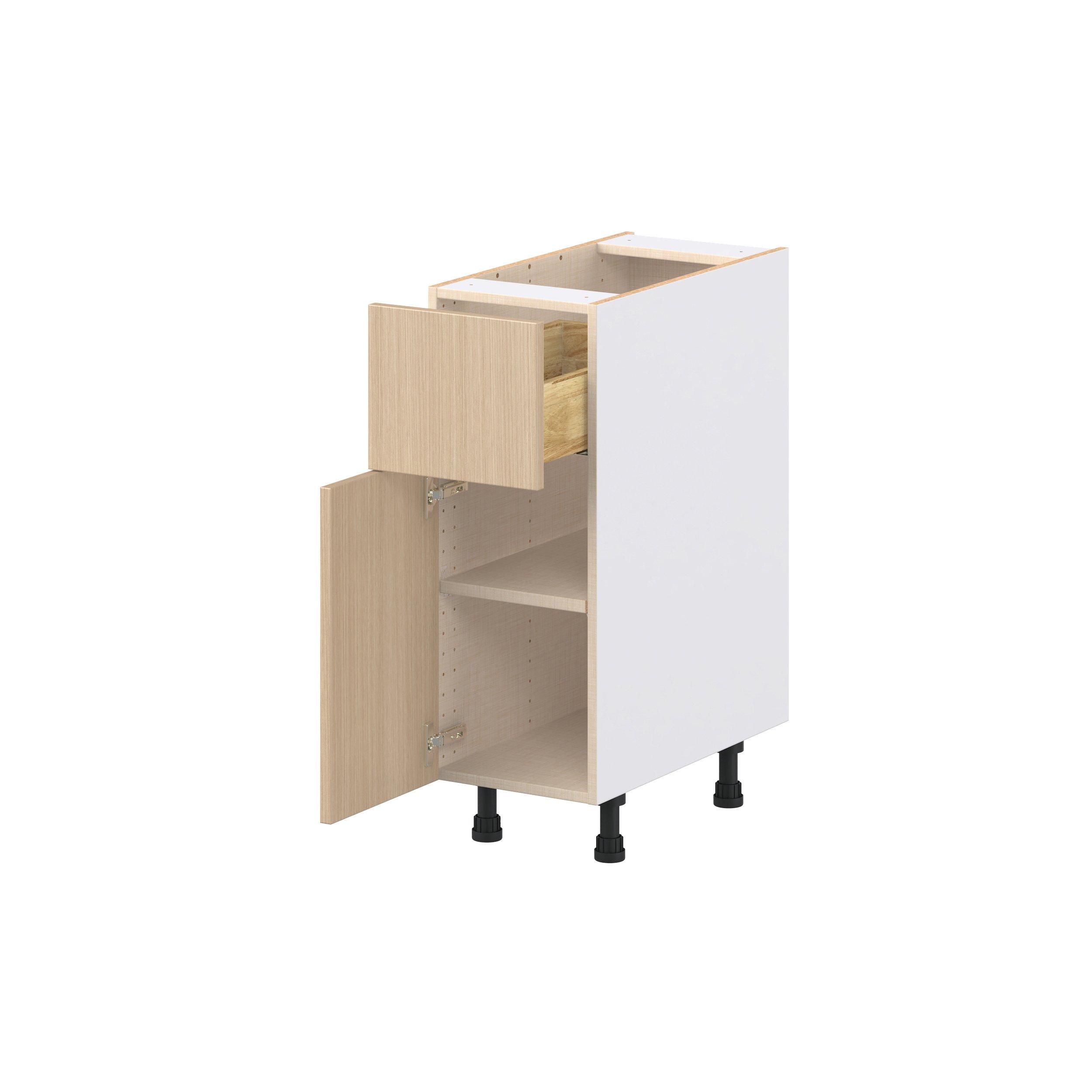 Elevate your project with the contemporary charm of Glenwood slab-style cabinets. Available in desert Mojavi oak and rich burnt walnut finishes, this collection captures the warmth and beauty of natural wood with the practicality of textured melamine. Crafted from one-piece MDF Studio Design Collection Glenwood 12 in. Mojavi Oak Door and Drawer Base Cabinet is designed to resist hairline cracks while the easy-to-clean finish stands up to stains and moisture. Featuring 5-piece doors and dovetail drawer joints, these cabinets offer durability and elegance. This collection combines style with everyday storage solutions.