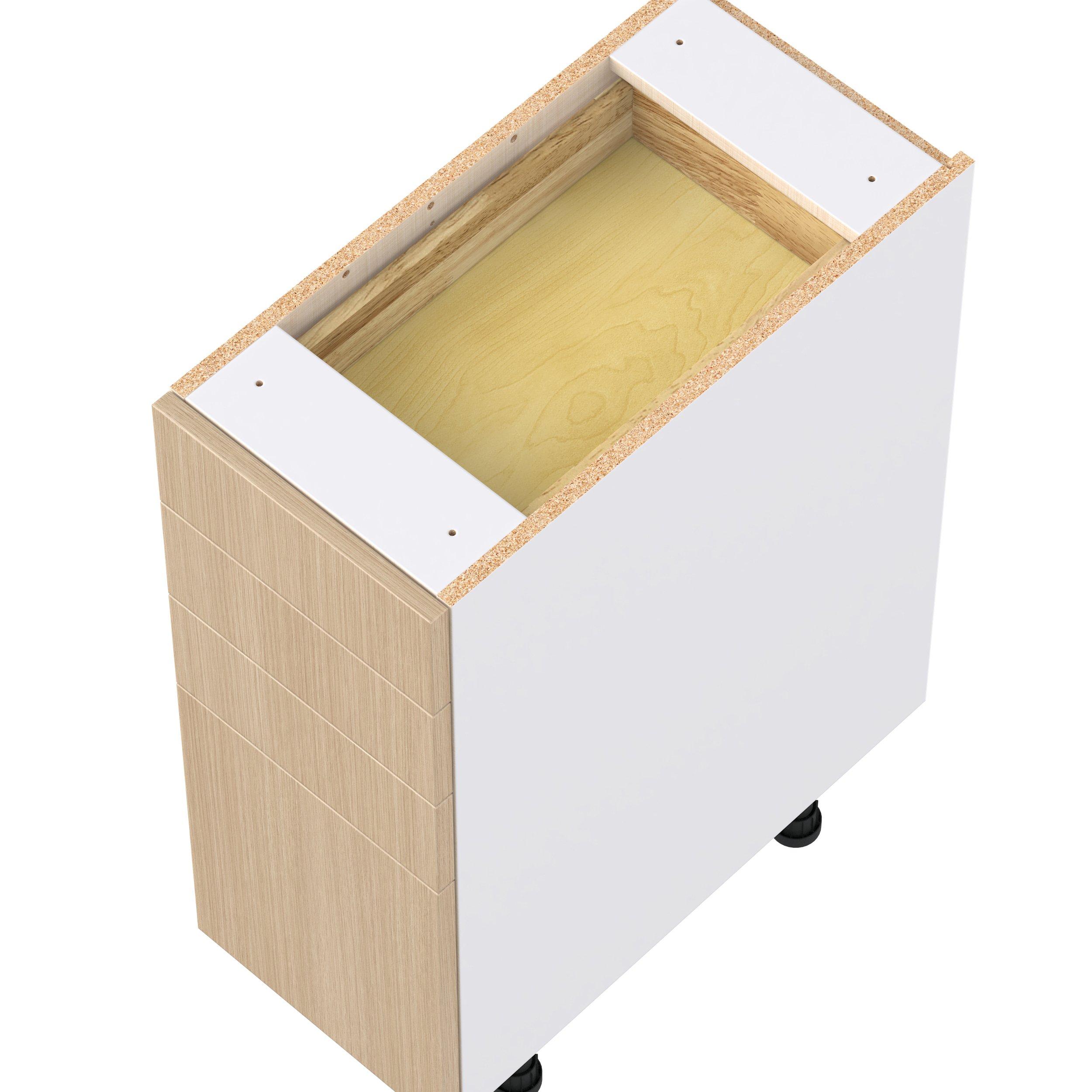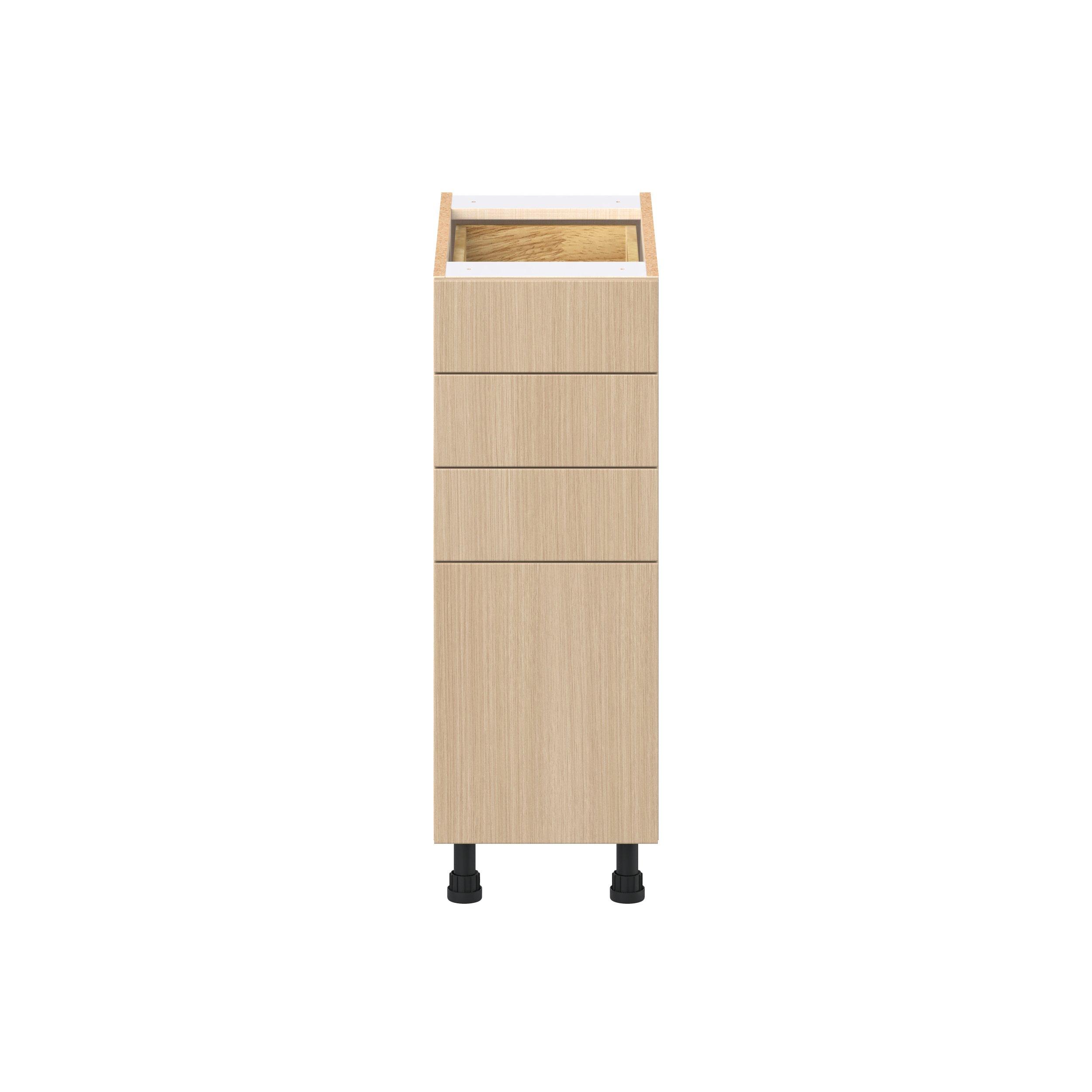 Elevate your project with the contemporary charm of Glenwood slab-style cabinets. Available in desert Mojavi oak and rich burnt walnut finishes, this collection captures the warmth and beauty of natural wood with the practicality of textured melamine. Crafted from one-piece MDF Studio Design Collection Glenwood 12 in. Mojavi Oak Drawer Base Cabinet is designed to resist hairline cracks while the easy-to-clean finish stands up to stains and moisture. Featuring 5-piece doors and dovetail drawer joints, these cabinets offer durability and elegance. This collection combines style with everyday storage solutions.