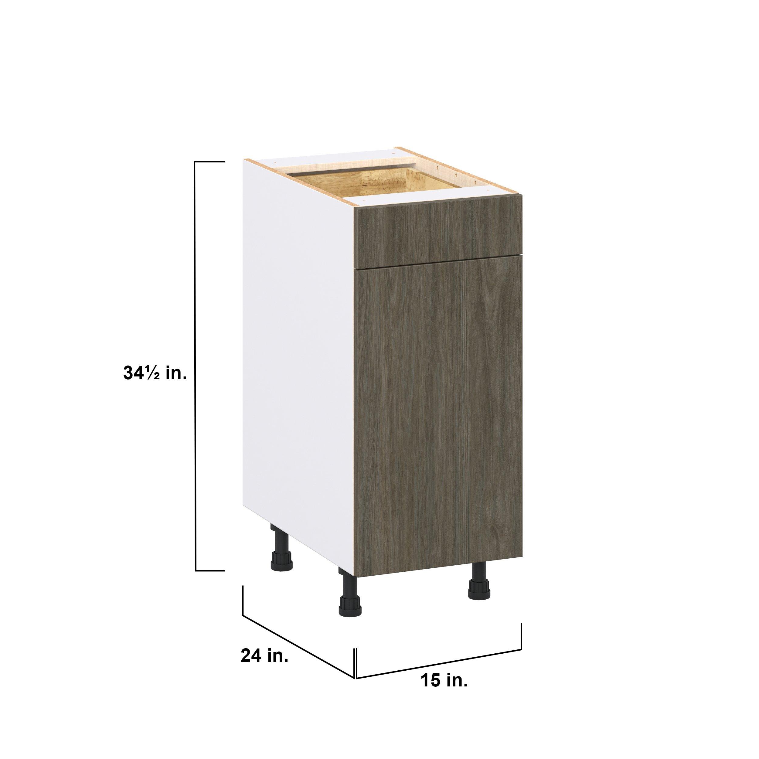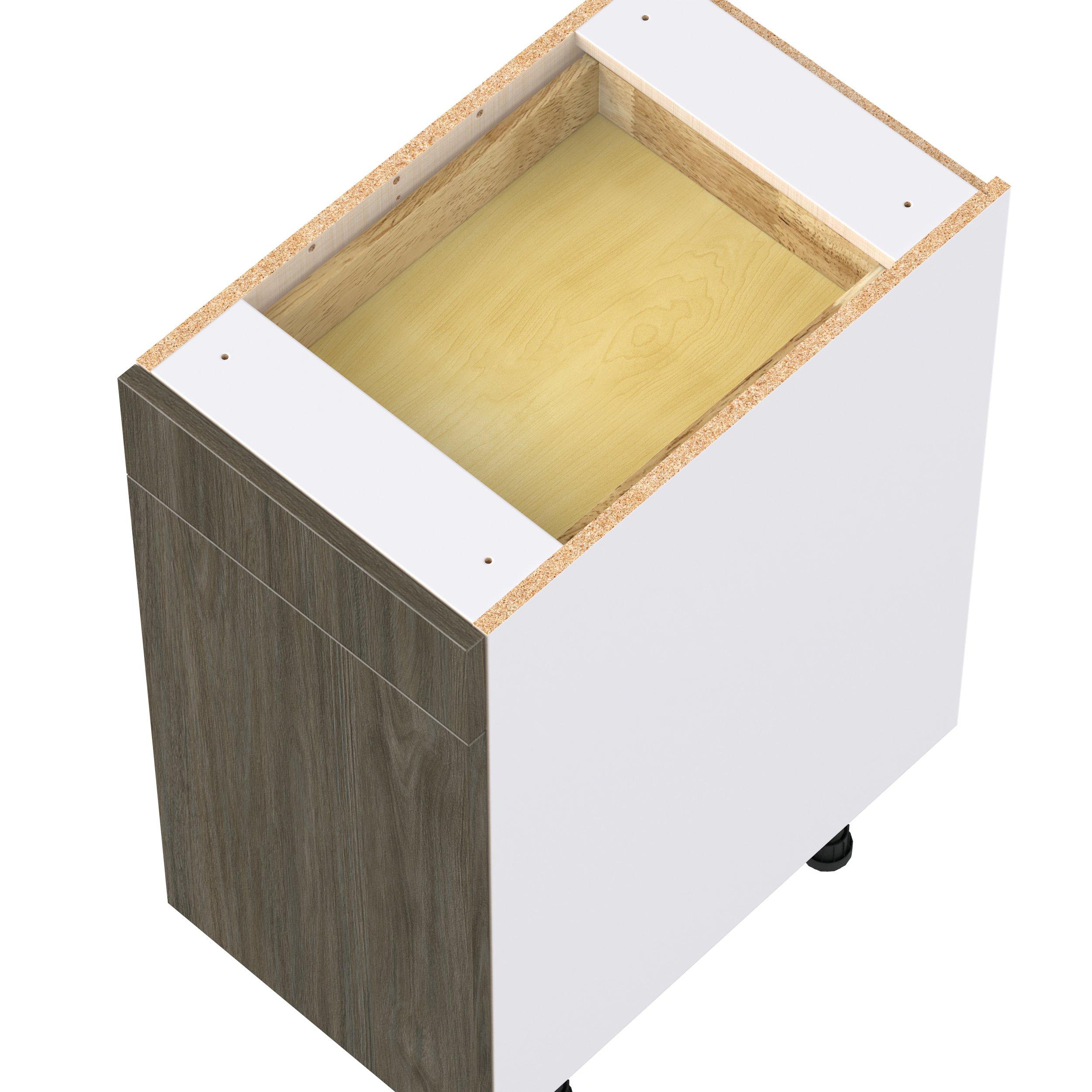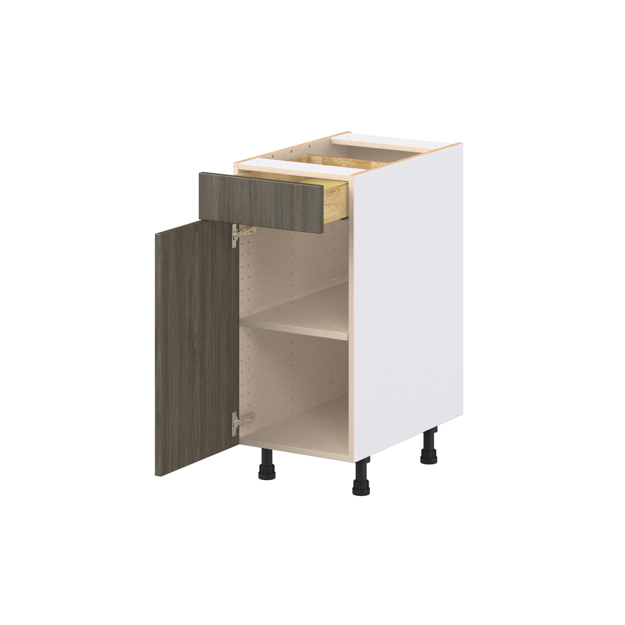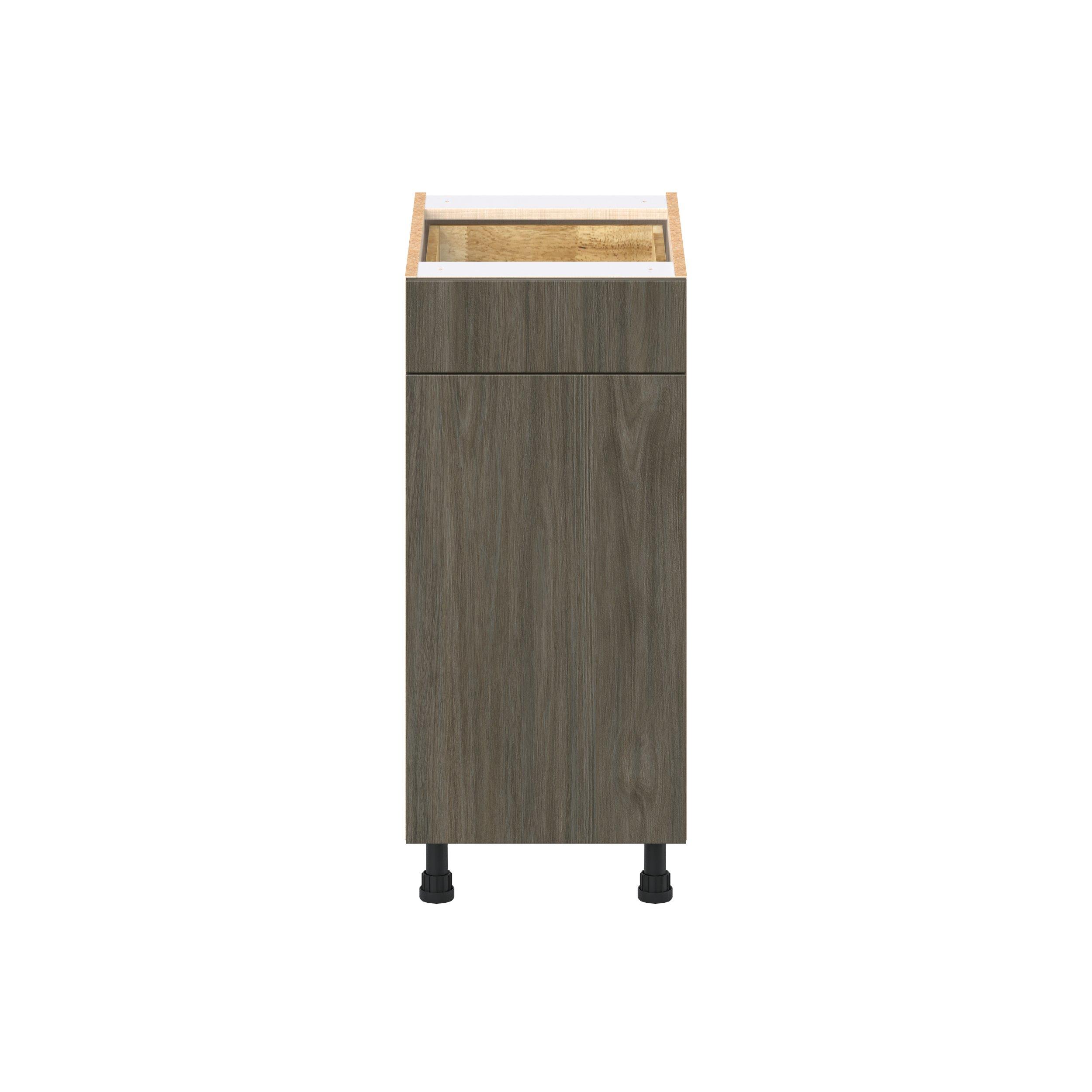 Elevate your project with the contemporary charm of Glenwood slab-style cabinets. Available in desert Mojavi oak and rich burnt walnut finishes, this collection captures the warmth and beauty of natural wood with the practicality of textured melamine. Crafted from one-piece MDF Studio Design Collection Glenwood 15 in. Burnt Walnut Door and Drawer Base Cabinet is designed to resist hairline cracks while the easy-to-clean finish stands up to stains and moisture. Featuring 5-piece doors and dovetail drawer joints, these cabinets offer durability and elegance. This collection combines style with everyday storage solutions.