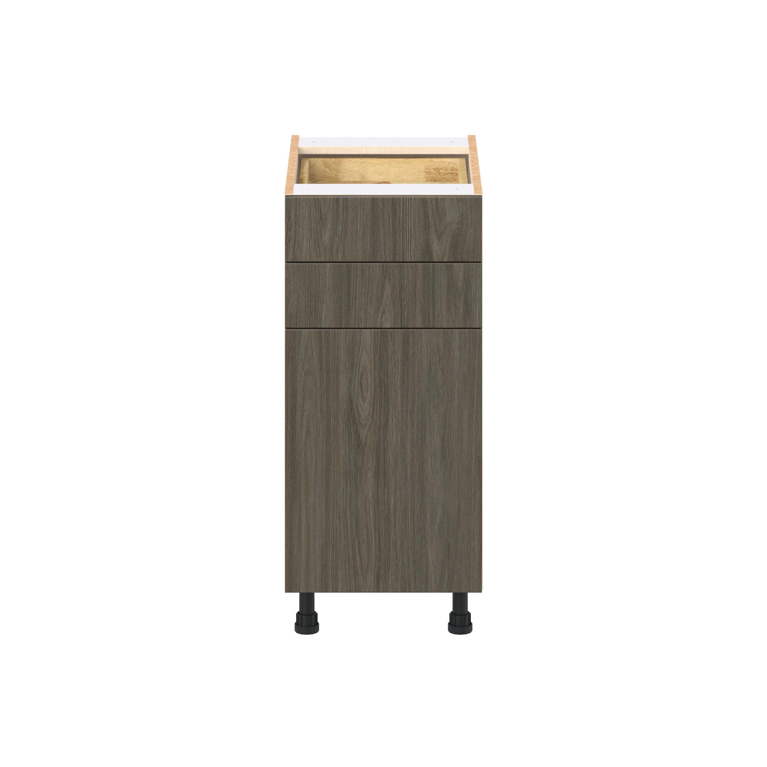 Elevate your project with the contemporary charm of Glenwood slab-style cabinets. Available in desert Mojavi oak and rich burnt walnut finishes, this collection captures the warmth and beauty of natural wood with the practicality of textured melamine. Crafted from one-piece MDF Studio Design Collection Glenwood 15 in. Burnt Walnut Door and Drawer Base Cabinet is designed to resist hairline cracks while the easy-to-clean finish stands up to stains and moisture. Featuring 5-piece doors and dovetail drawer joints, these cabinets offer durability and elegance. This collection combines style with everyday storage solutions.