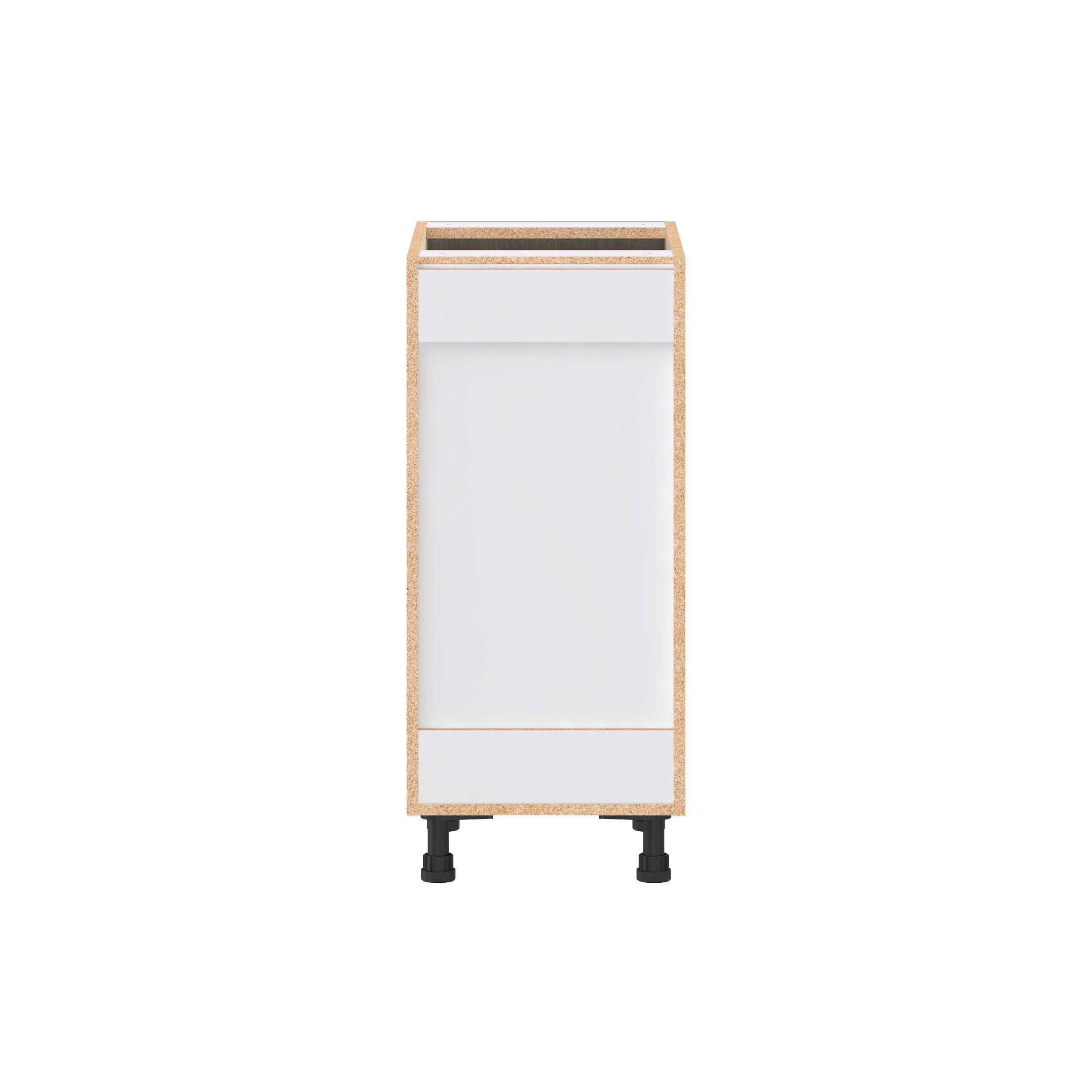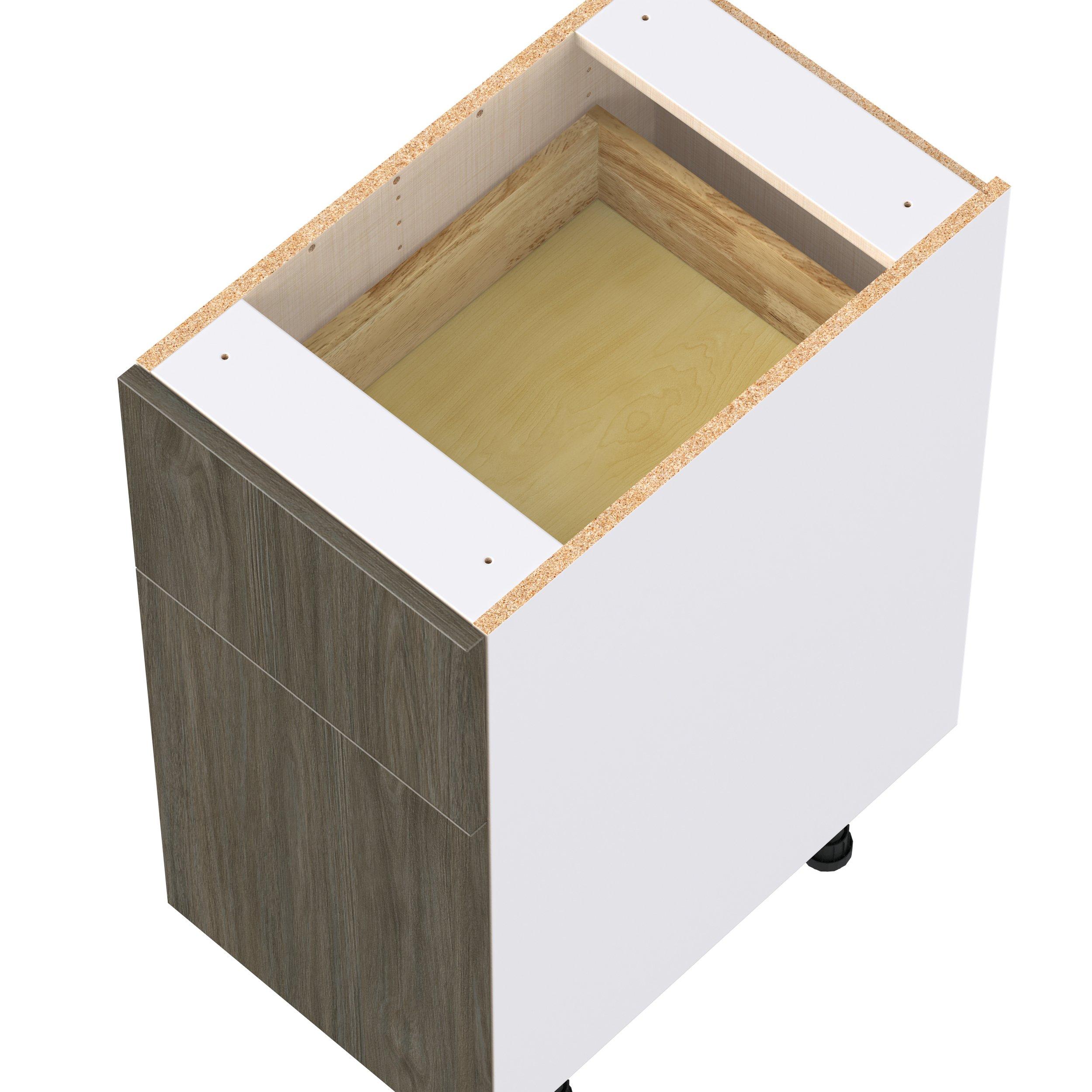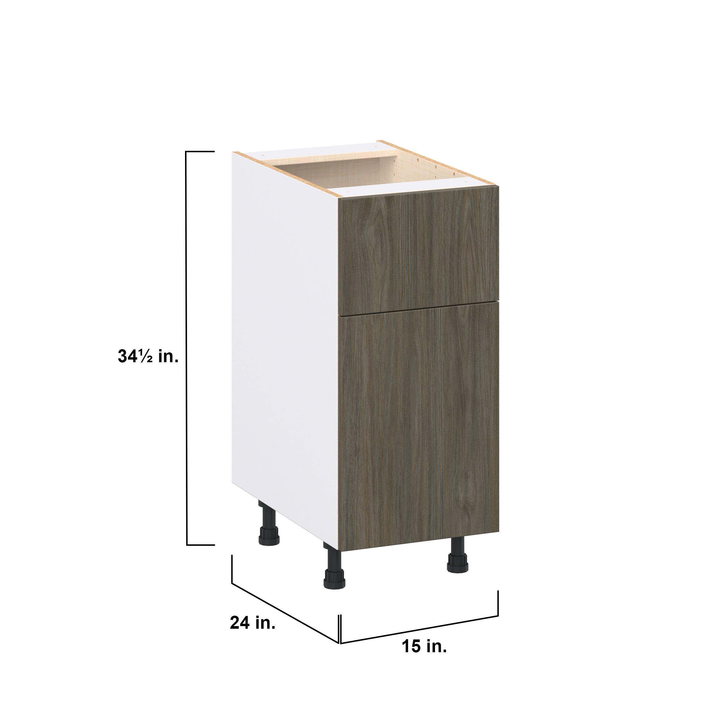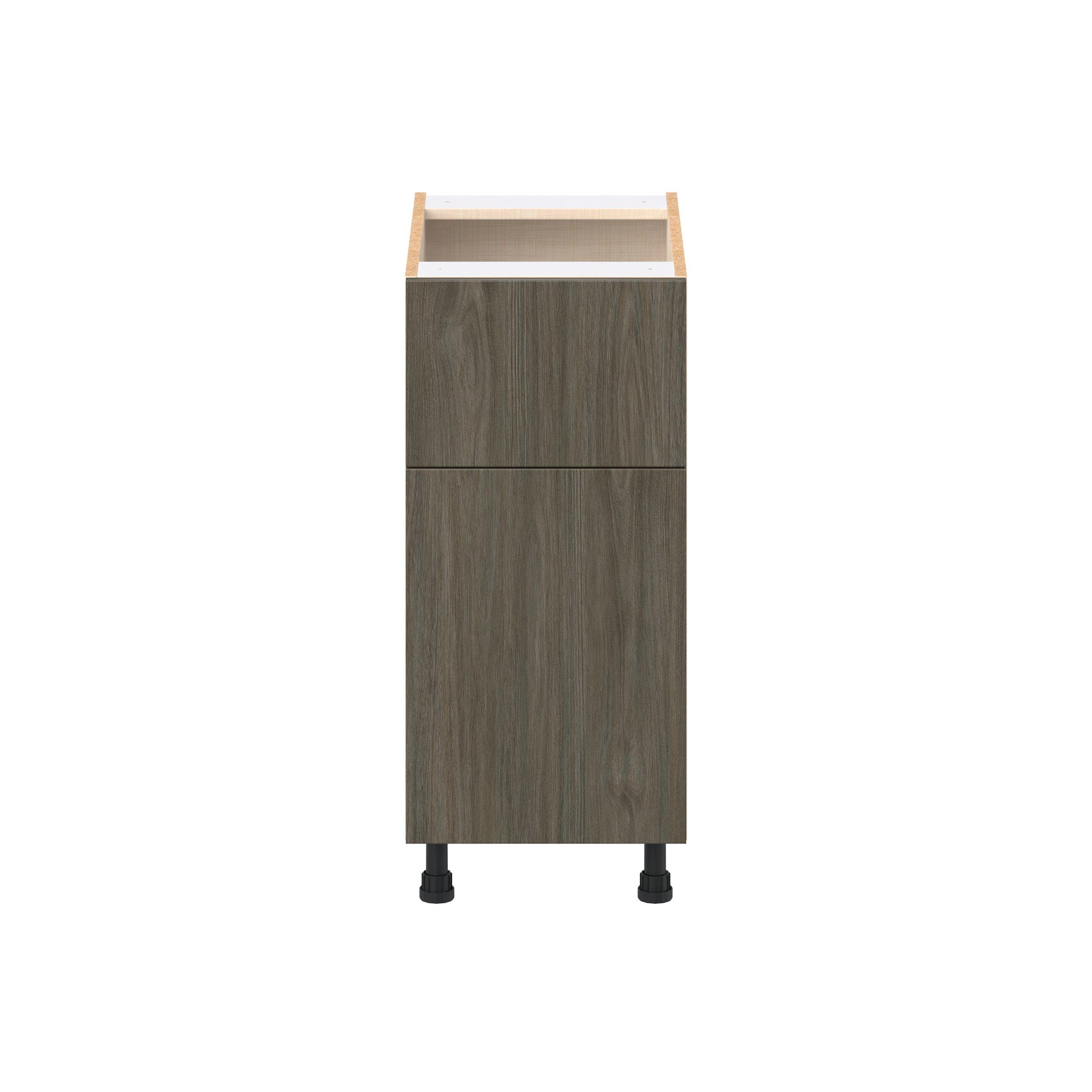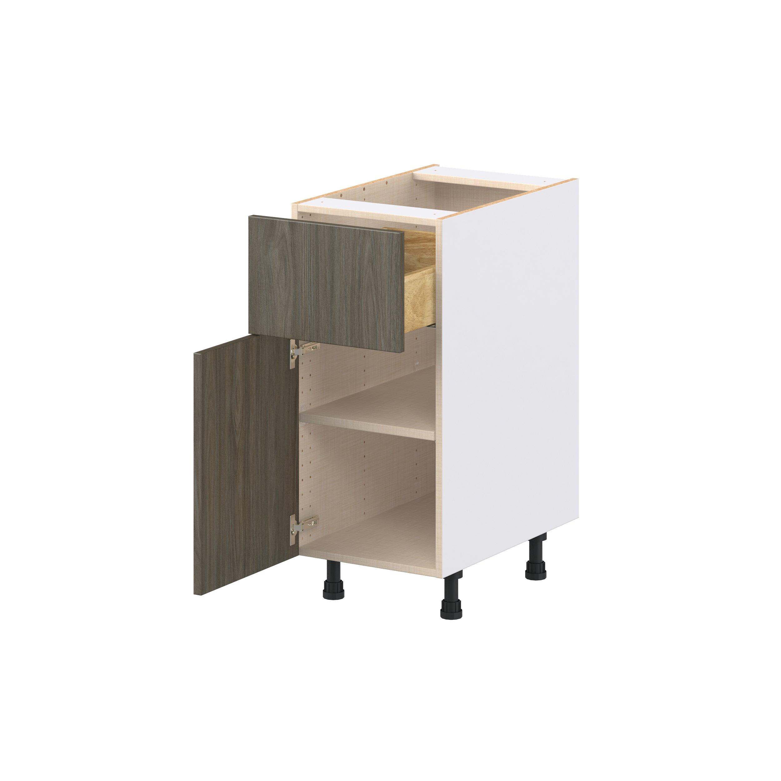 Elevate your project with the contemporary charm of Glenwood slab-style cabinets. Available in desert Mojavi oak and rich burnt walnut finishes, this collection captures the warmth and beauty of natural wood with the practicality of textured melamine. Crafted from one-piece MDF Studio Design Collection Glenwood 15 in. Burnt Walnut Door and Drawer Base Cabinet is designed to resist hairline cracks while the easy-to-clean finish stands up to stains and moisture. Featuring 5-piece doors and dovetail drawer joints, these cabinets offer durability and elegance. This collection combines style with everyday storage solutions.