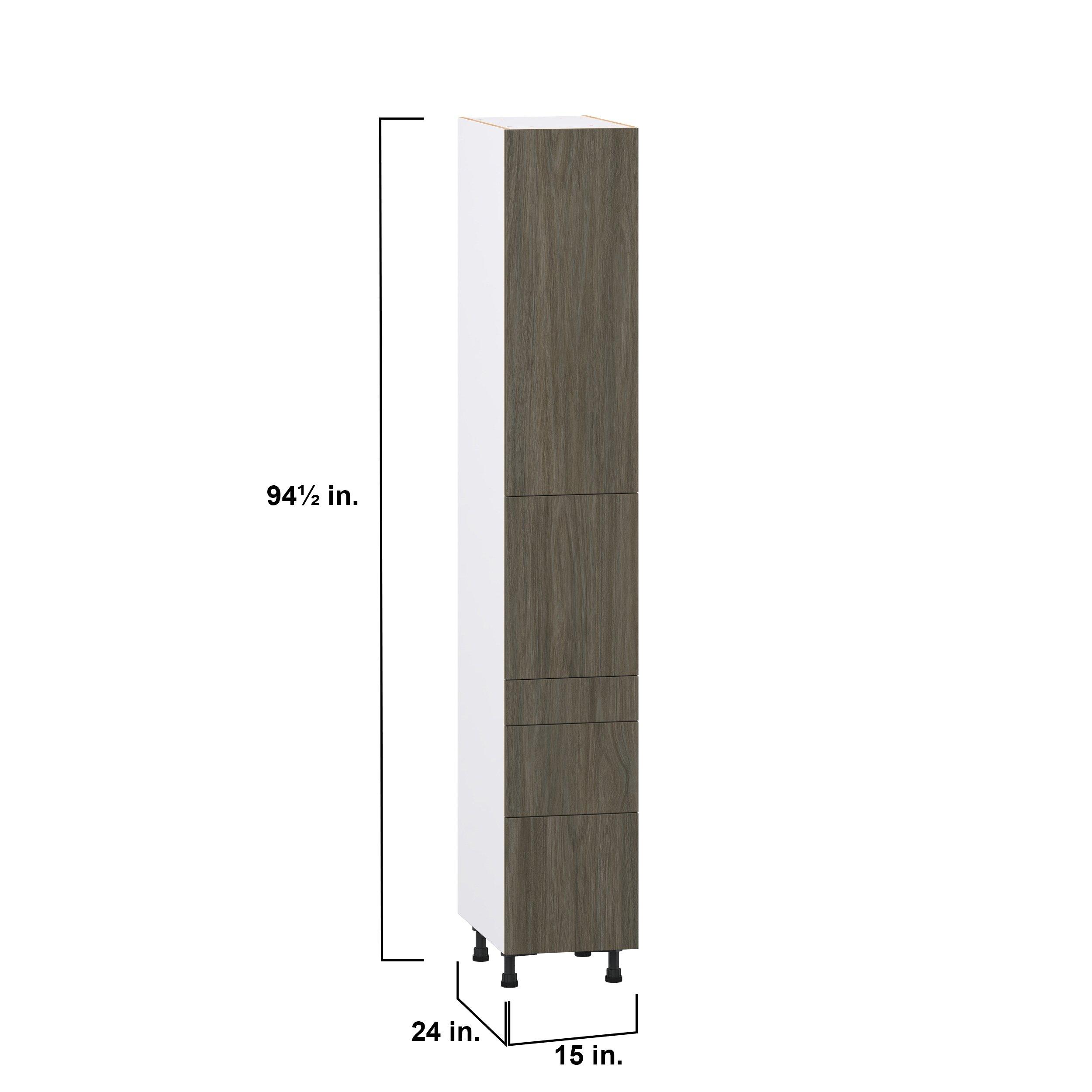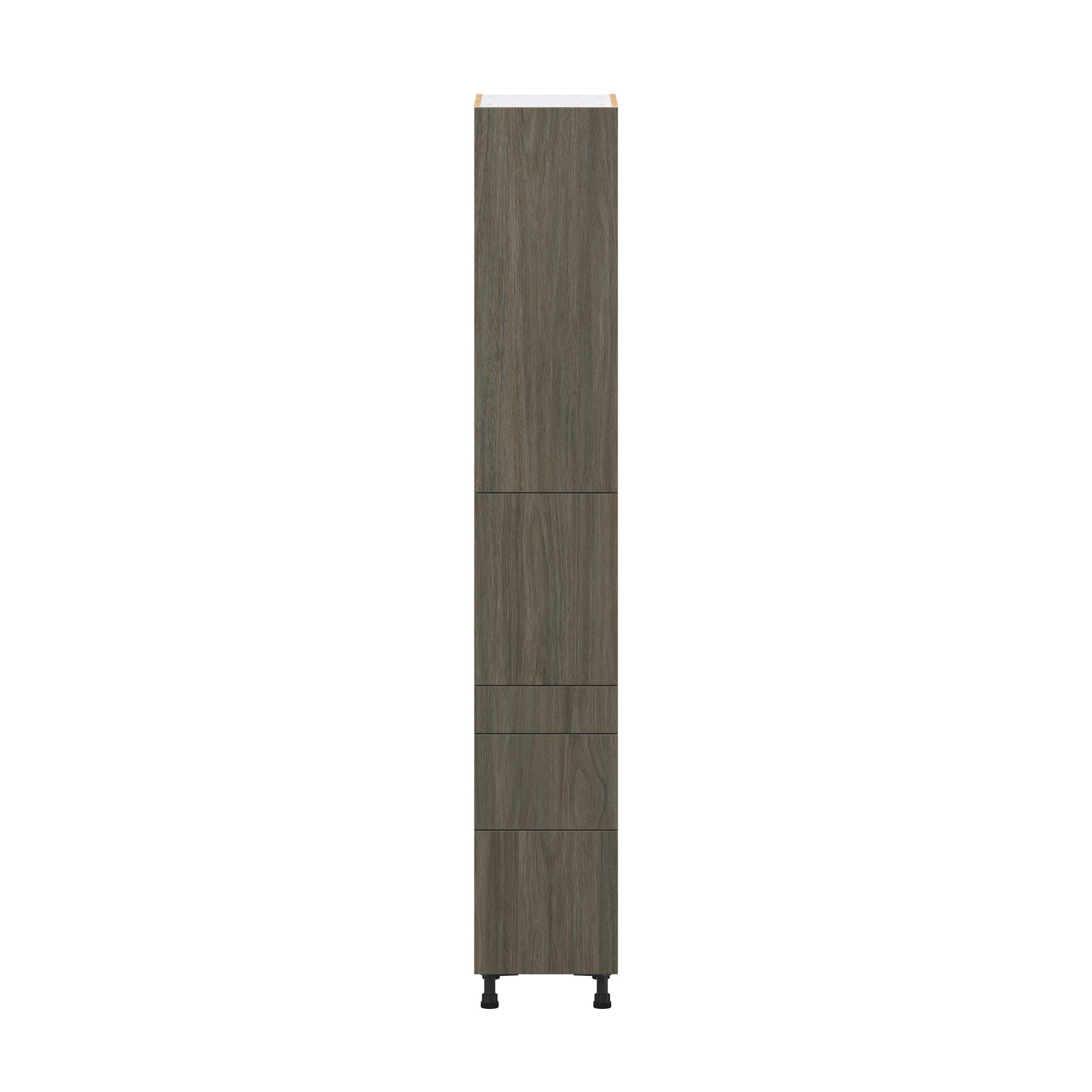 Elevate your project with the contemporary charm of Glenwood slab-style cabinets. Available in desert Mojavi oak and rich burnt walnut finishes, this collection captures the warmth and beauty of natural wood with the practicality of textured melamine. Crafted from one-piece MDF Studio Design Collection Glenwood 15 in. Burnt Walnut Door and Drawer Pantry Cabinet with Inner Pull-Out is designed to resist hairline cracks while the easy-to-clean finish stands up to stains and moisture. Featuring 5-piece doors and dovetail drawer joints, these cabinets offer durability and elegance. This collection combines style with everyday storage solutions.