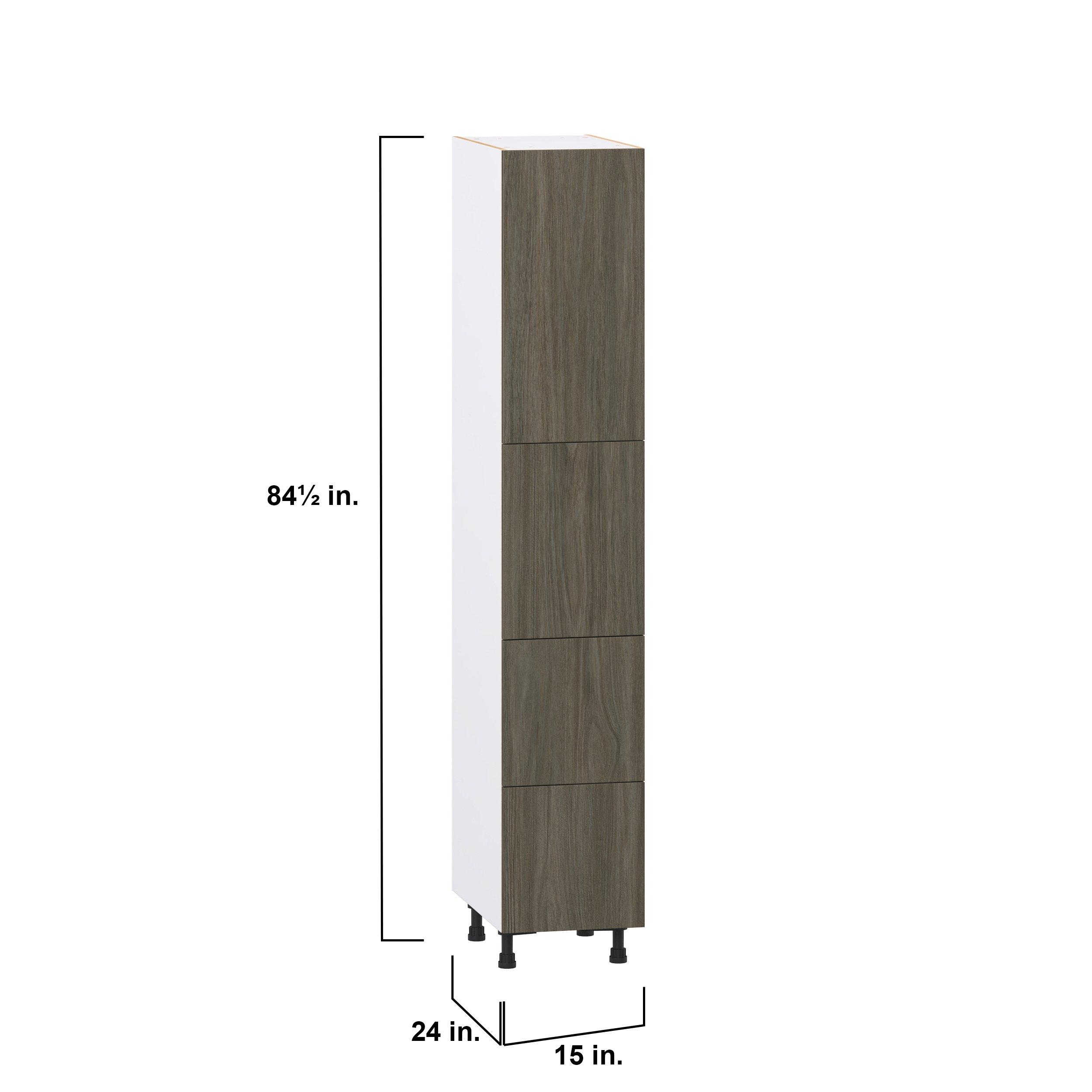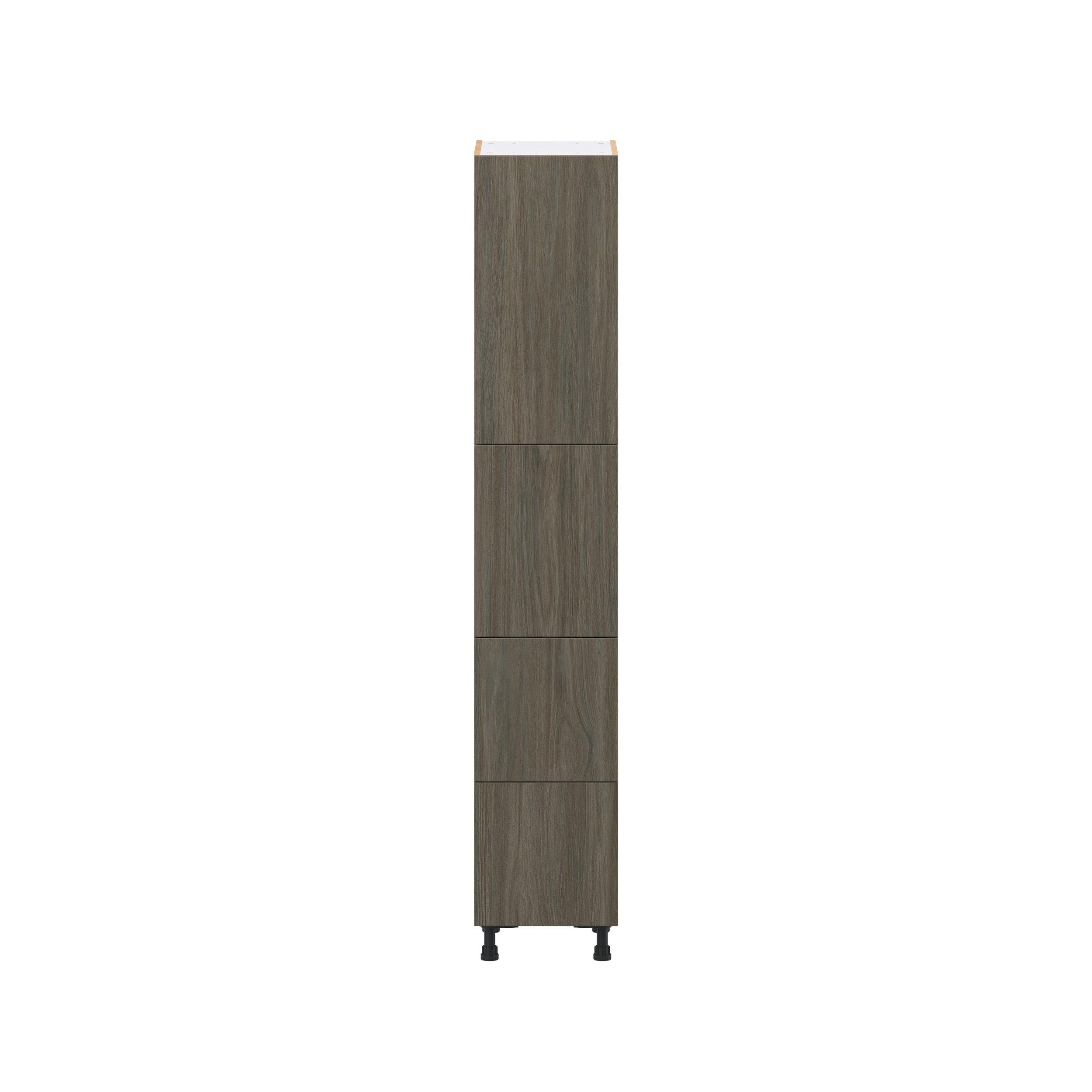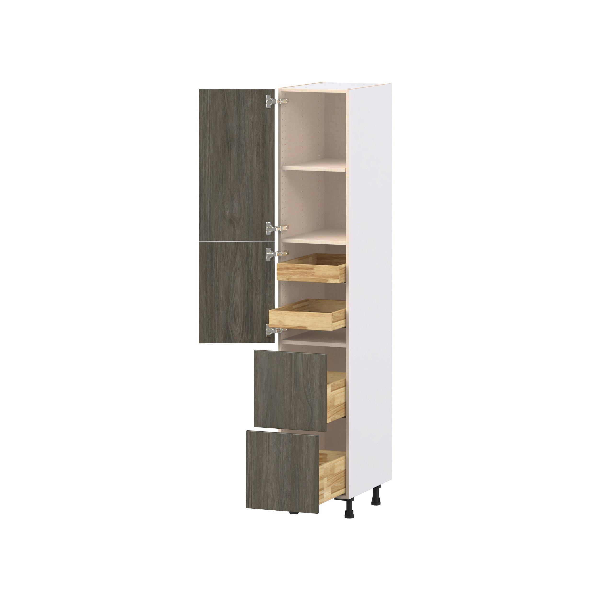 Elevate your project with the contemporary charm of Glenwood slab-style cabinets. Available in desert Mojavi oak and rich burnt walnut finishes, this collection captures the warmth and beauty of natural wood with the practicality of textured melamine. Crafted from one-piece MDF Studio Design Collection Glenwood 15 in. Burnt Walnut Door and Drawer Pantry Cabinet with Inner Pull-Out is designed to resist hairline cracks while the easy-to-clean finish stands up to stains and moisture. Featuring 5-piece doors and dovetail drawer joints, these cabinets offer durability and elegance. This collection combines style with everyday storage solutions.