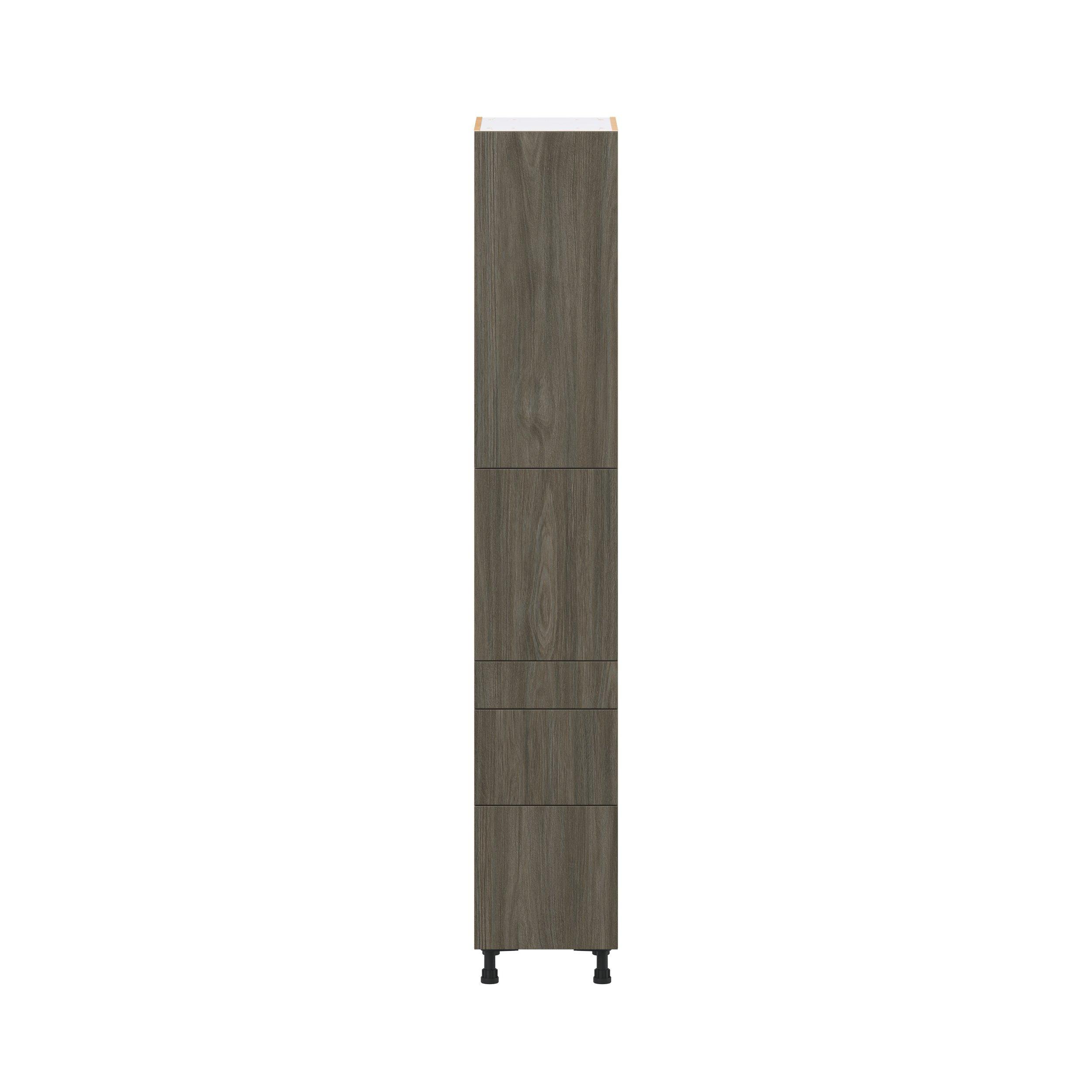 Elevate your project with the contemporary charm of Glenwood slab-style cabinets. Available in desert Mojavi oak and rich burnt walnut finishes, this collection captures the warmth and beauty of natural wood with the practicality of textured melamine. Crafted from one-piece MDF Studio Design Collection Glenwood 15 in. Burnt Walnut Door and Drawer Pantry Cabinet with Inner Pull-Out is designed to resist hairline cracks while the easy-to-clean finish stands up to stains and moisture. Featuring 5-piece doors and dovetail drawer joints, these cabinets offer durability and elegance. This collection combines style with everyday storage solutions.