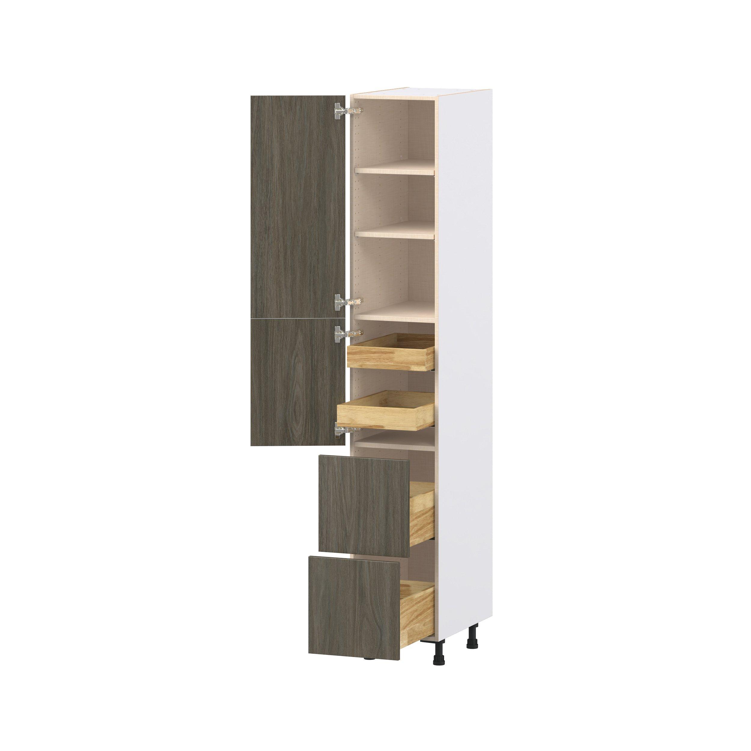 Elevate your project with the contemporary charm of Glenwood slab-style cabinets. Available in desert Mojavi oak and rich burnt walnut finishes, this collection captures the warmth and beauty of natural wood with the practicality of textured melamine. Crafted from one-piece MDF Studio Design Collection Glenwood 15 in. Burnt Walnut Door and Drawer Pantry Cabinet with Inner Pull-Out is designed to resist hairline cracks while the easy-to-clean finish stands up to stains and moisture. Featuring 5-piece doors and dovetail drawer joints, these cabinets offer durability and elegance. This collection combines style with everyday storage solutions.