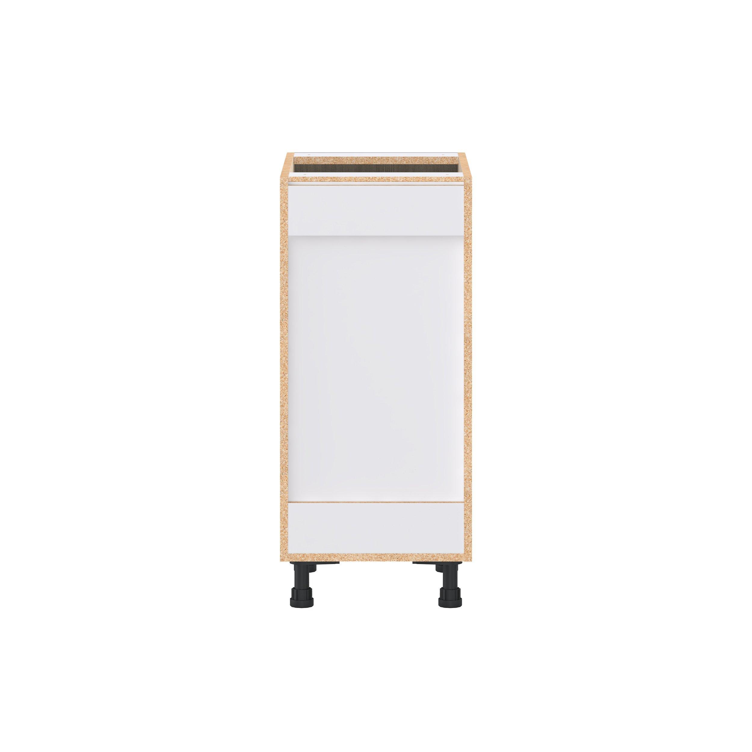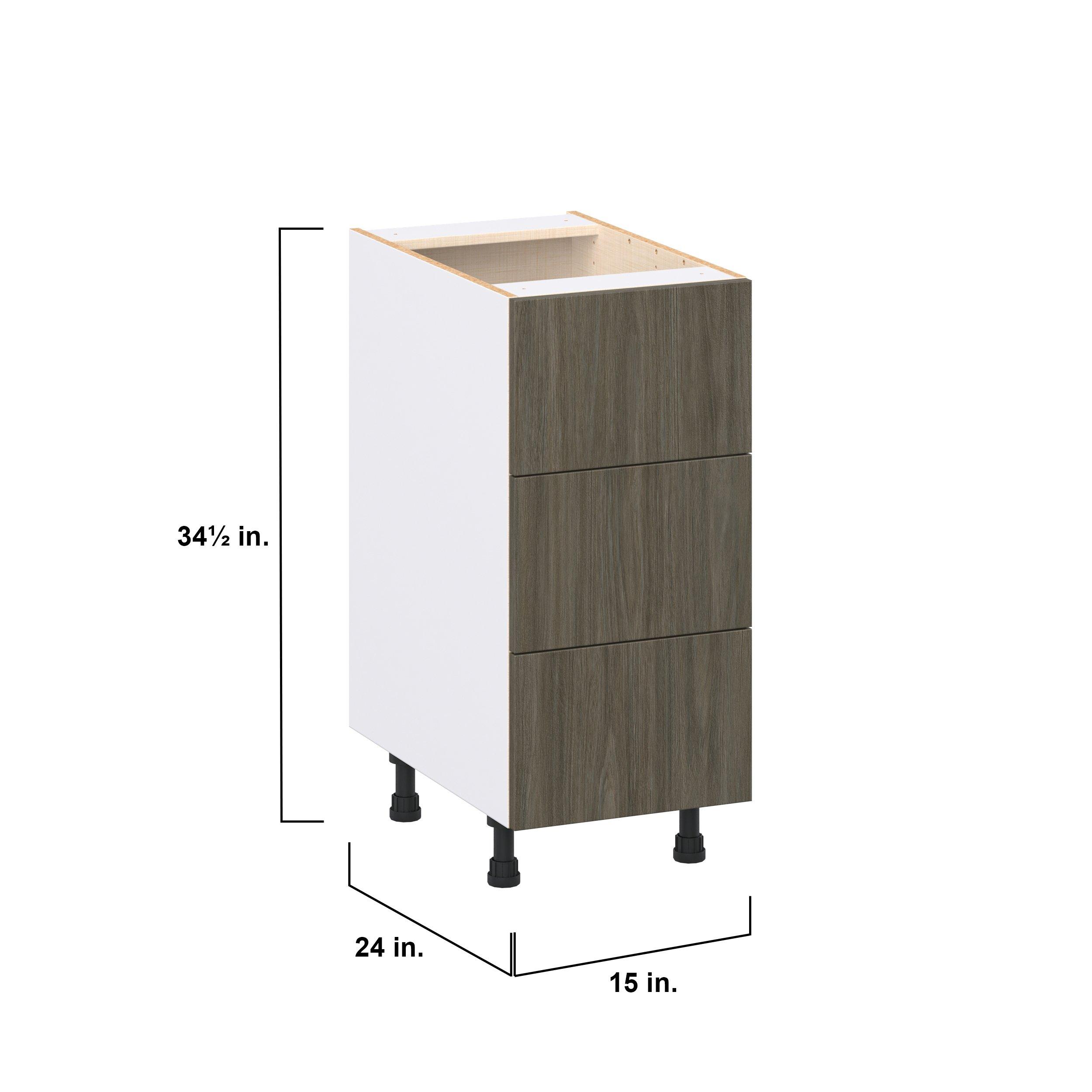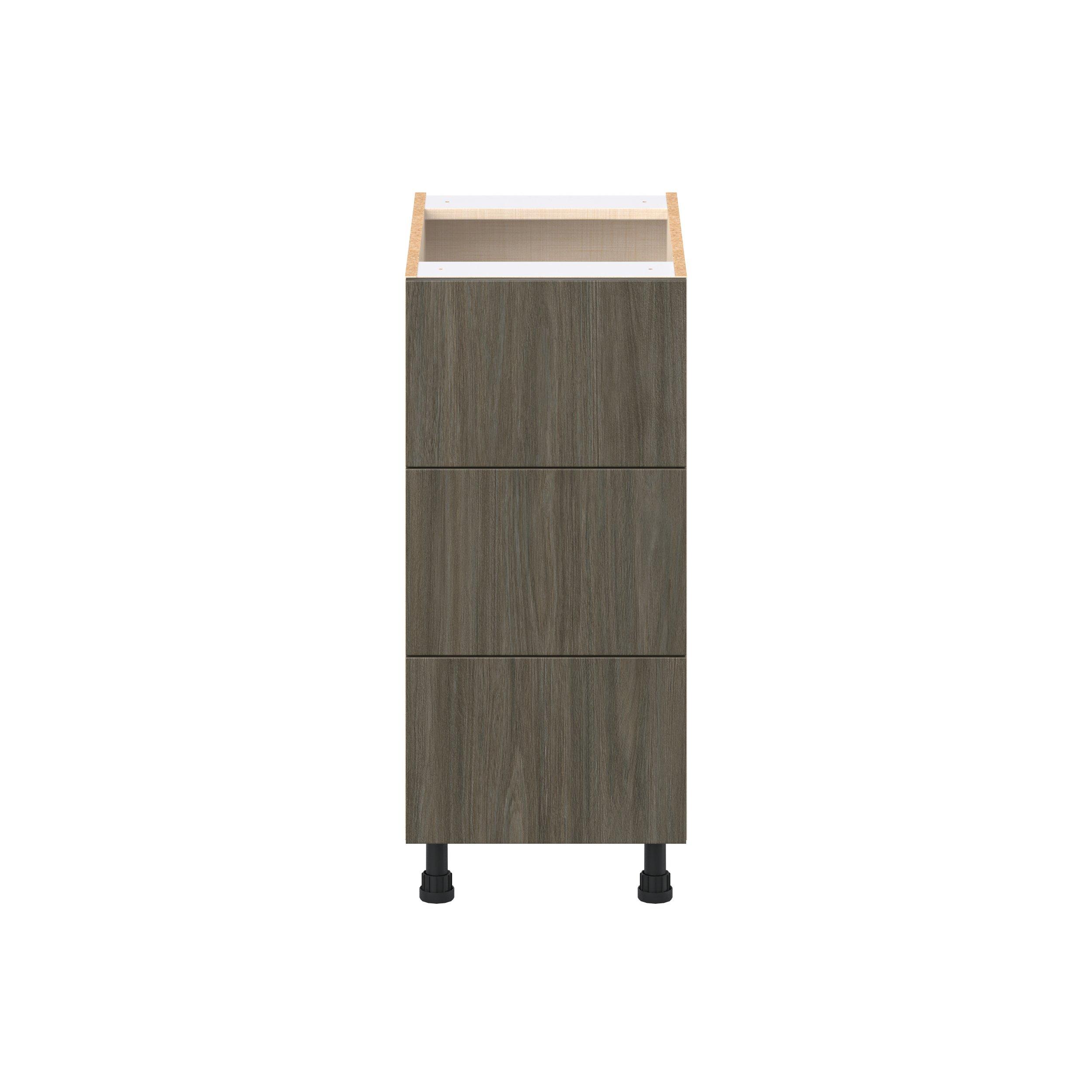 Elevate your project with the contemporary charm of Glenwood slab-style cabinets. Available in desert Mojavi oak and rich burnt walnut finishes, this collection captures the warmth and beauty of natural wood with the practicality of textured melamine. Crafted from one-piece MDF Studio Design Collection Glenwood 15 in. Burnt Walnut Drawer Base Cabinet is designed to resist hairline cracks while the easy-to-clean finish stands up to stains and moisture. Featuring 5-piece doors and dovetail drawer joints, these cabinets offer durability and elegance. This collection combines style with everyday storage solutions.