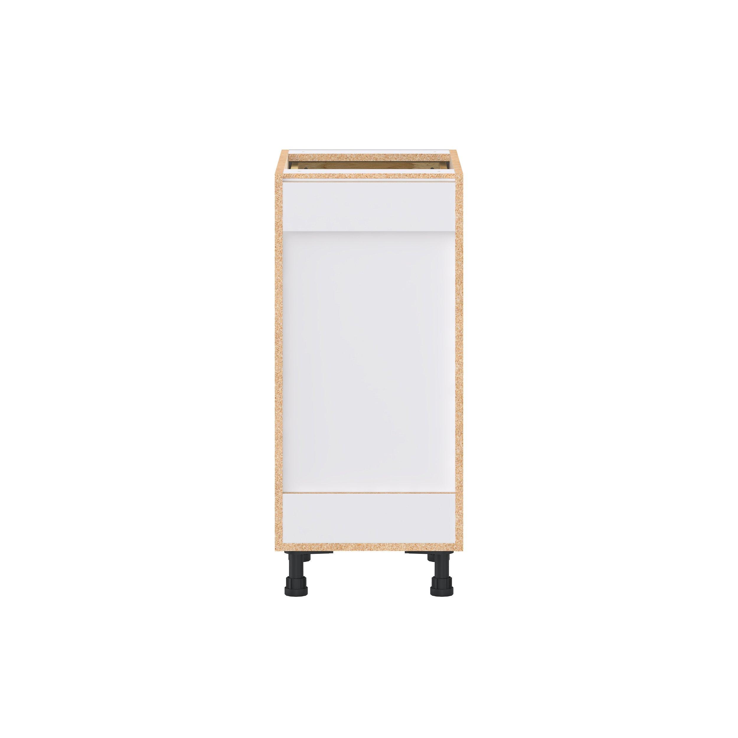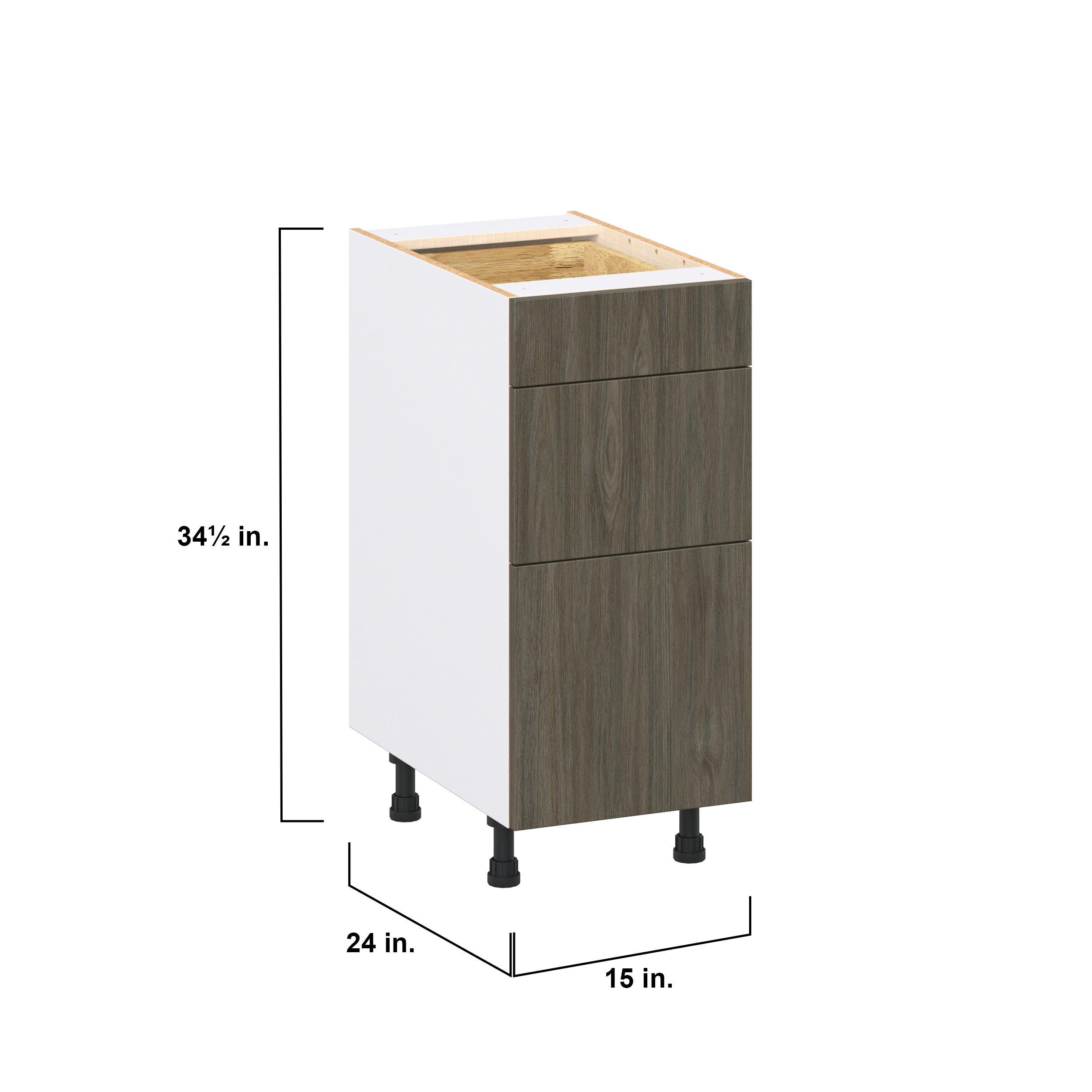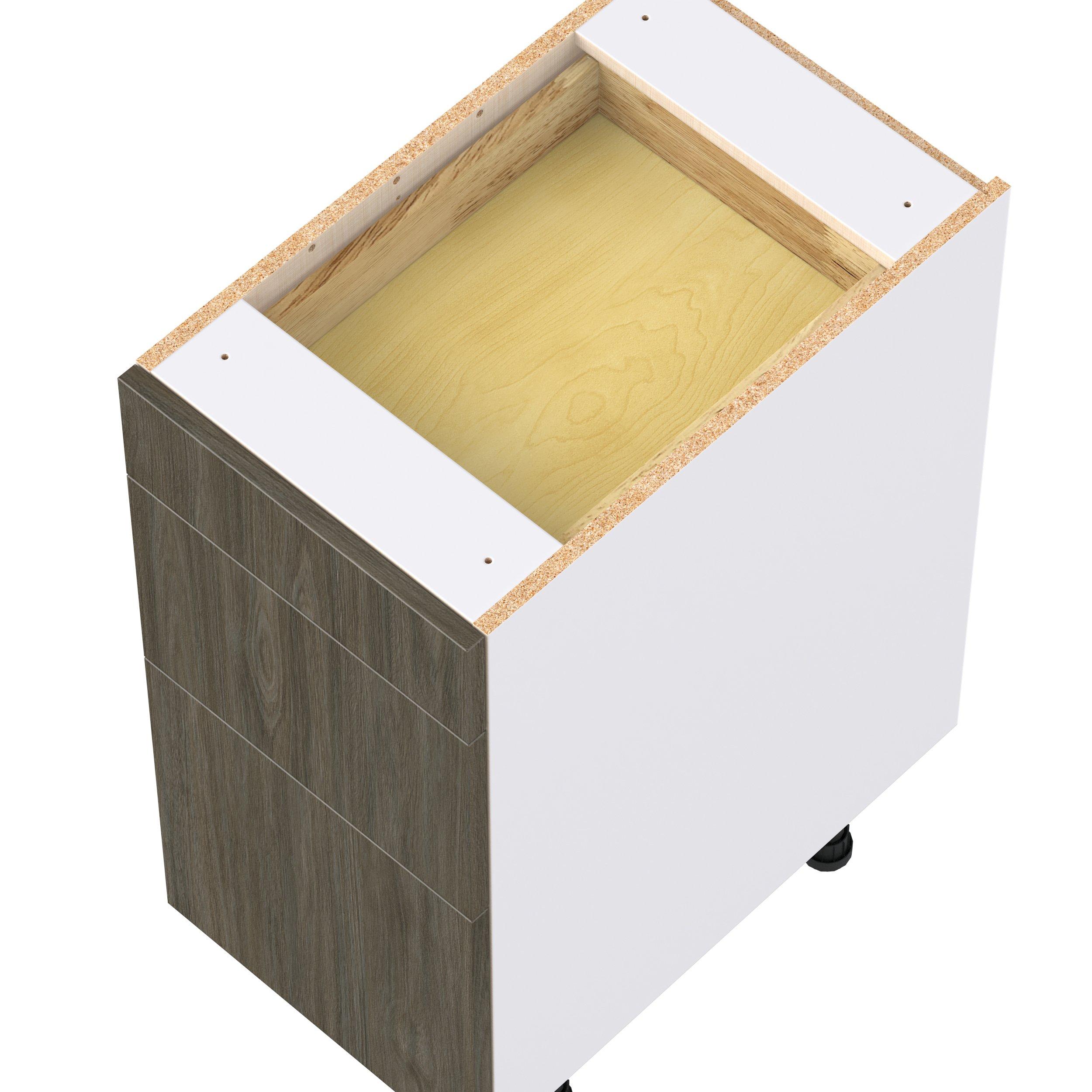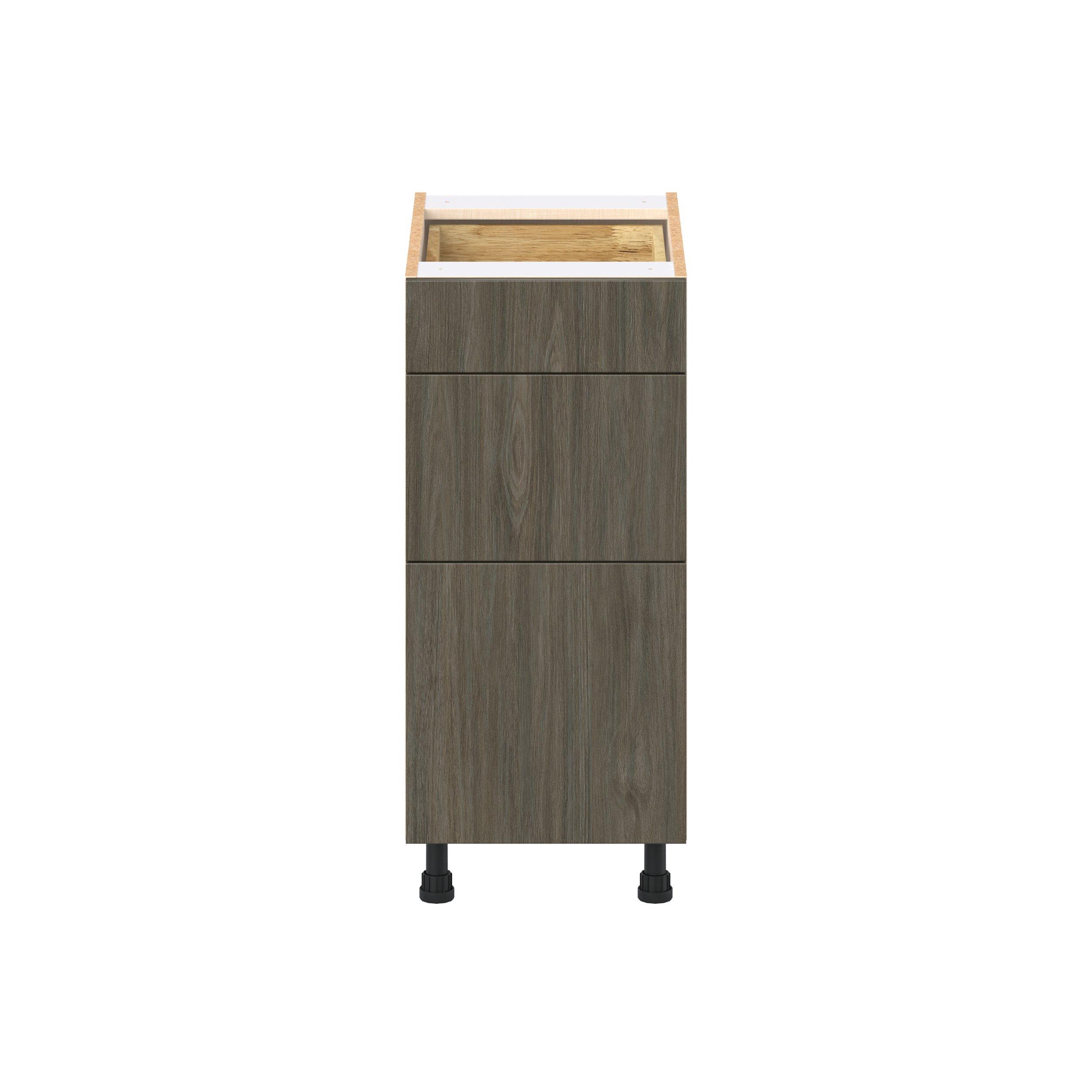 Elevate your project with the contemporary charm of Glenwood slab-style cabinets. Available in desert Mojavi oak and rich burnt walnut finishes, this collection captures the warmth and beauty of natural wood with the practicality of textured melamine. Crafted from one-piece MDF Studio Design Collection Glenwood 15 in. Burnt Walnut Drawer Base Cabinet is designed to resist hairline cracks while the easy-to-clean finish stands up to stains and moisture. Featuring 5-piece doors and dovetail drawer joints, these cabinets offer durability and elegance. This collection combines style with everyday storage solutions.