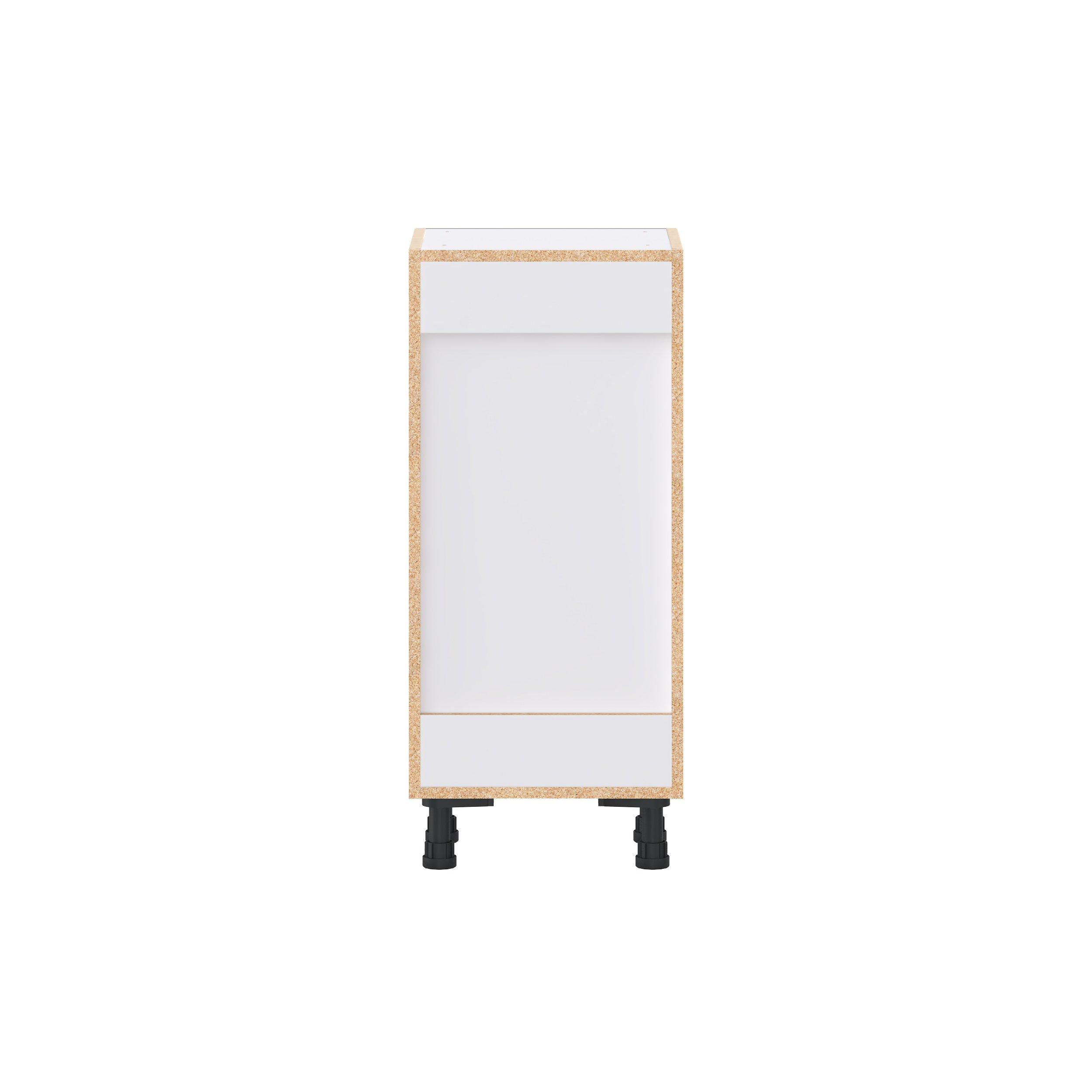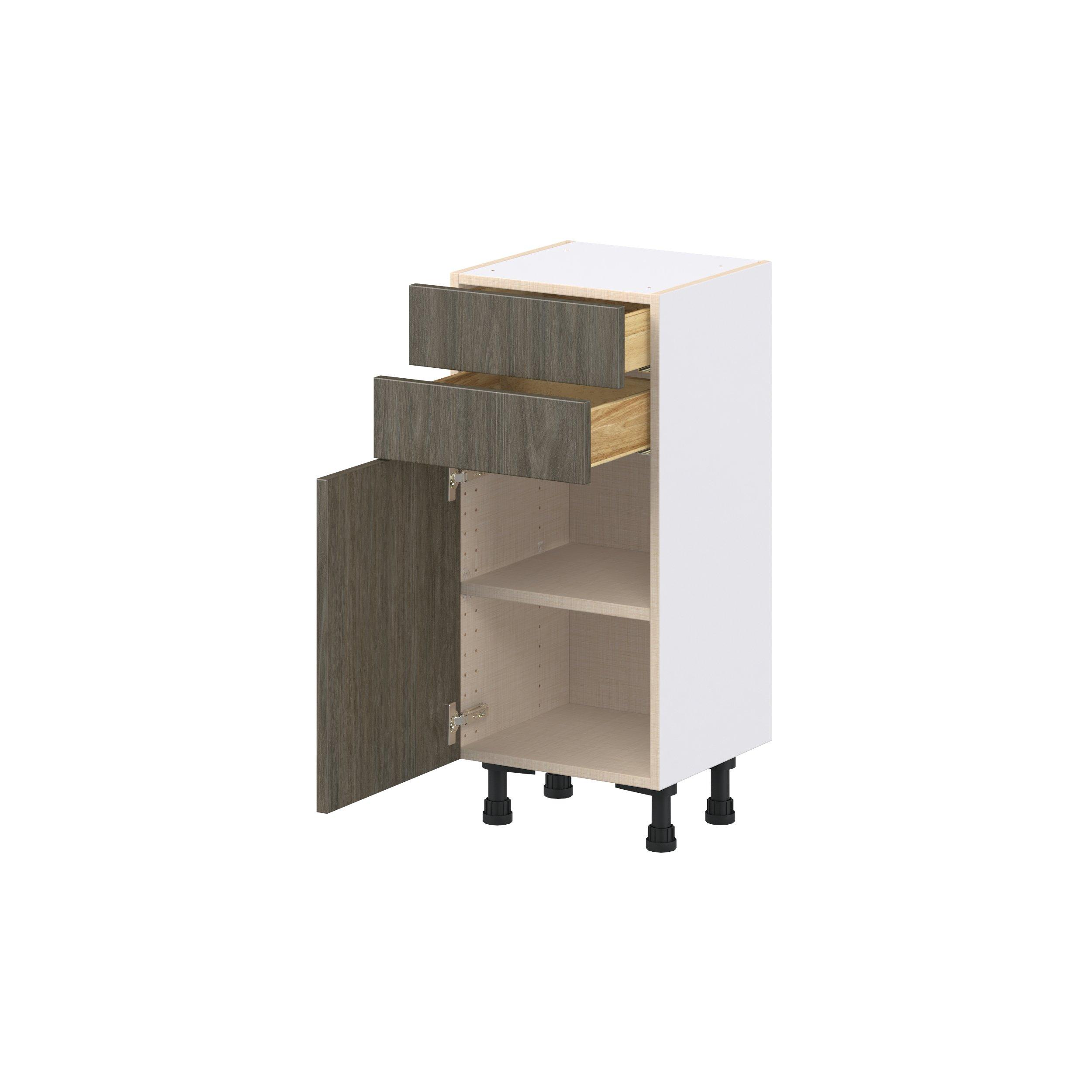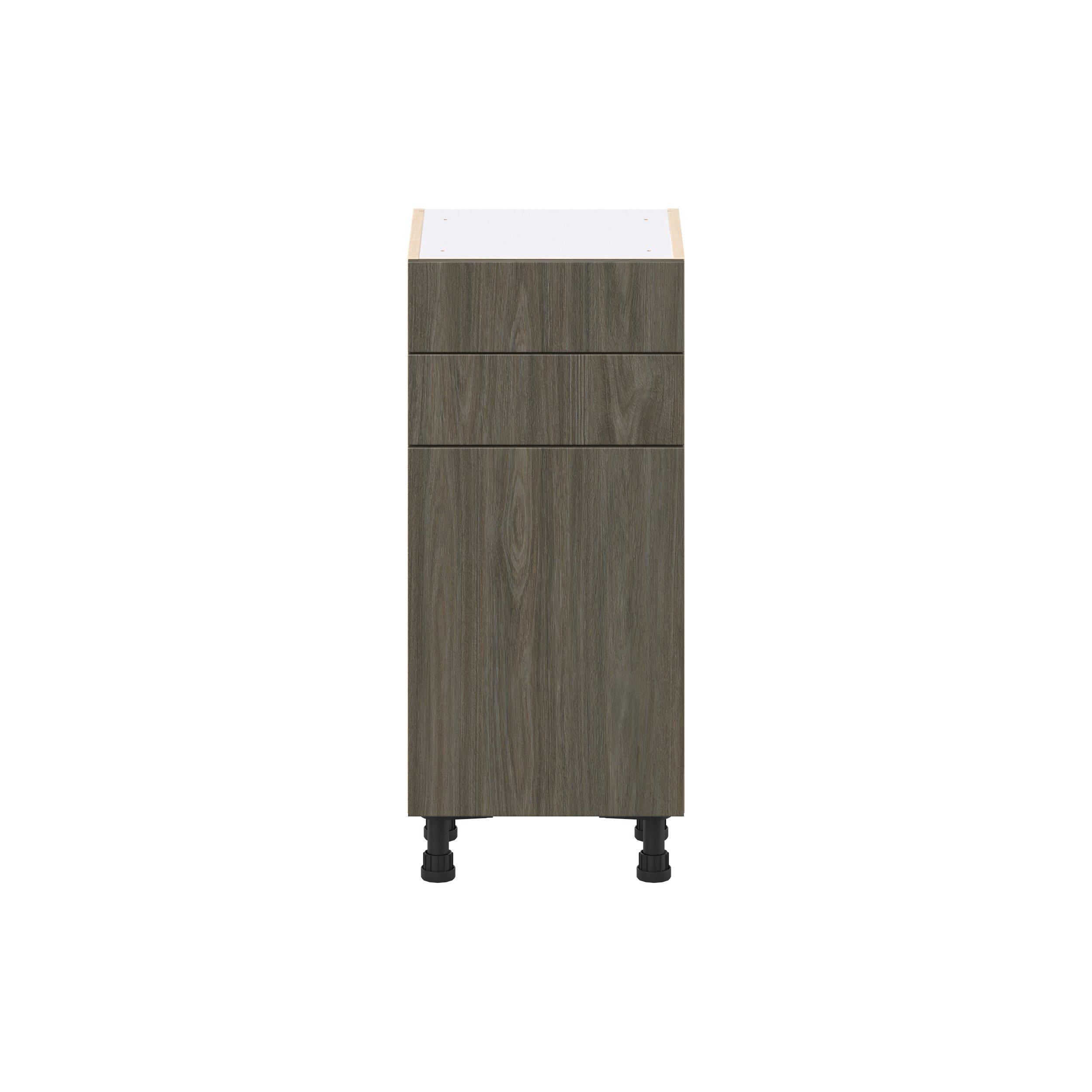 Elevate your project with the contemporary charm of Glenwood slab-style cabinets. Available in desert Mojavi oak and rich burnt walnut finishes, this collection captures the warmth and beauty of natural wood with the practicality of textured melamine. Crafted from one-piece MDF Studio Design Collection Glenwood 15 in. Burnt Walnut Shallow Base Cabinet is designed to resist hairline cracks while the easy-to-clean finish stands up to stains and moisture. Featuring 5-piece doors and dovetail drawer joints, these cabinets offer durability and elegance. This collection combines style with everyday storage solutions.
