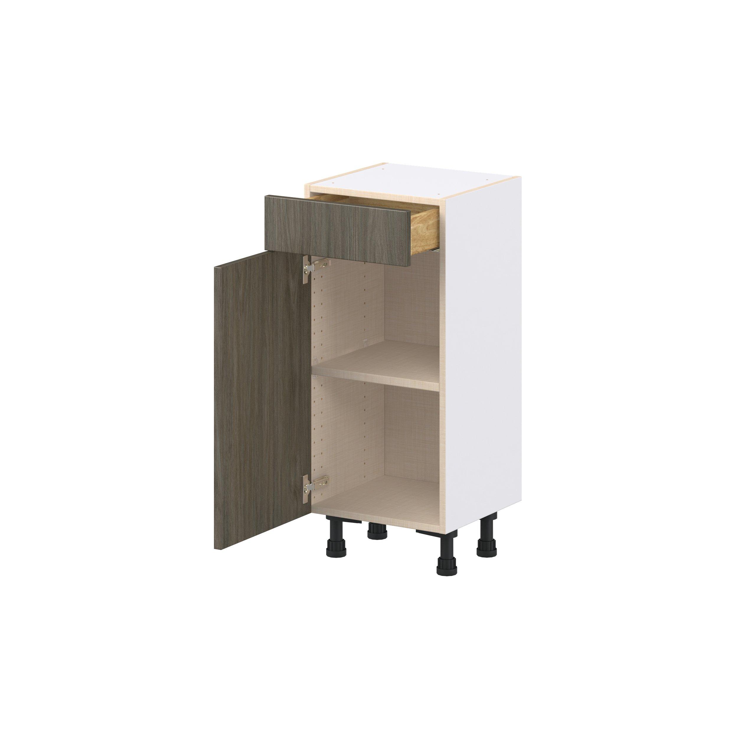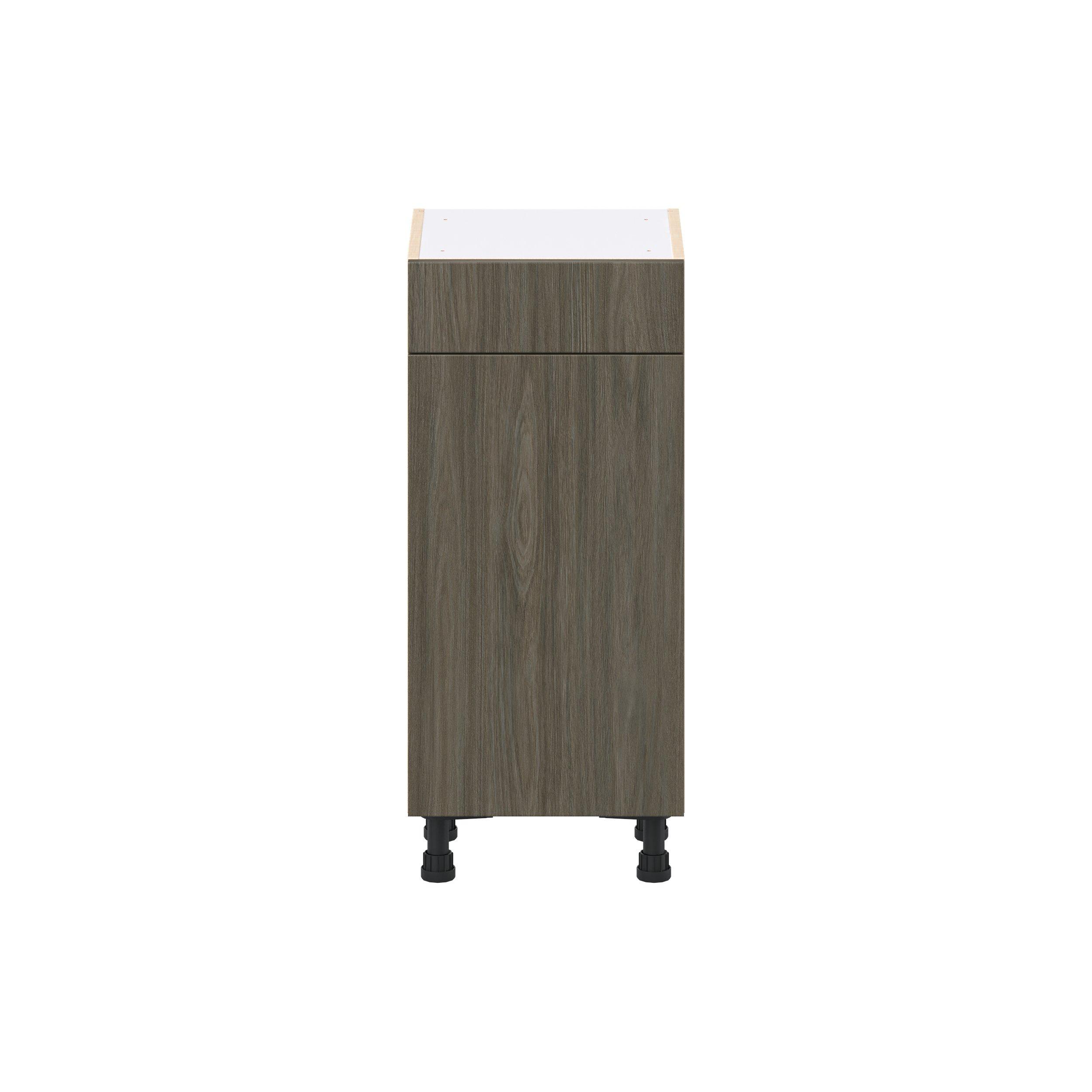 Elevate your project with the contemporary charm of Glenwood slab-style cabinets. Available in desert Mojavi oak and rich burnt walnut finishes, this collection captures the warmth and beauty of natural wood with the practicality of textured melamine. Crafted from one-piece MDF Studio Design Collection Glenwood 15 in. Burnt Walnut Shallow Base Cabinet is designed to resist hairline cracks while the easy-to-clean finish stands up to stains and moisture. Featuring 5-piece doors and dovetail drawer joints, these cabinets offer durability and elegance. This collection combines style with everyday storage solutions.