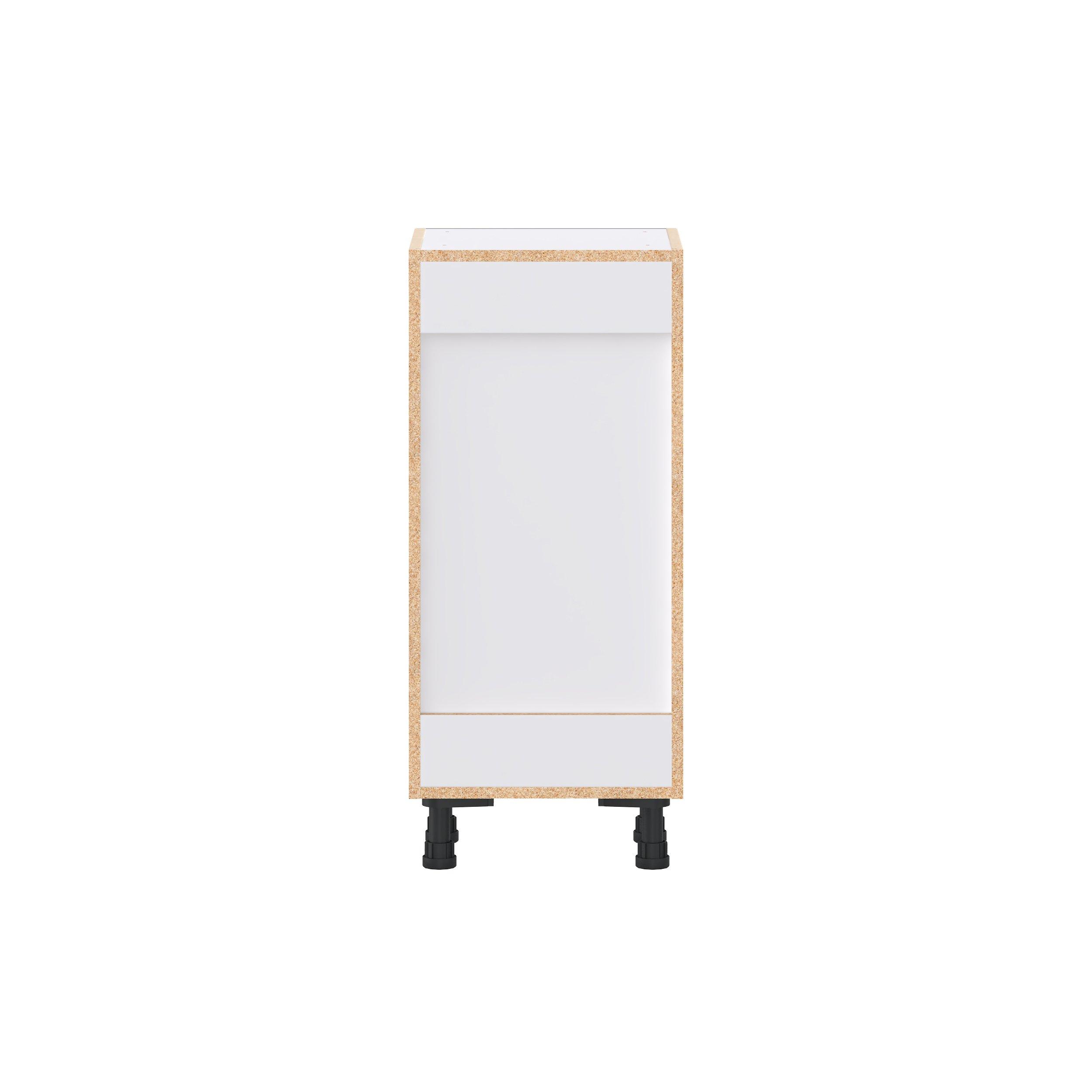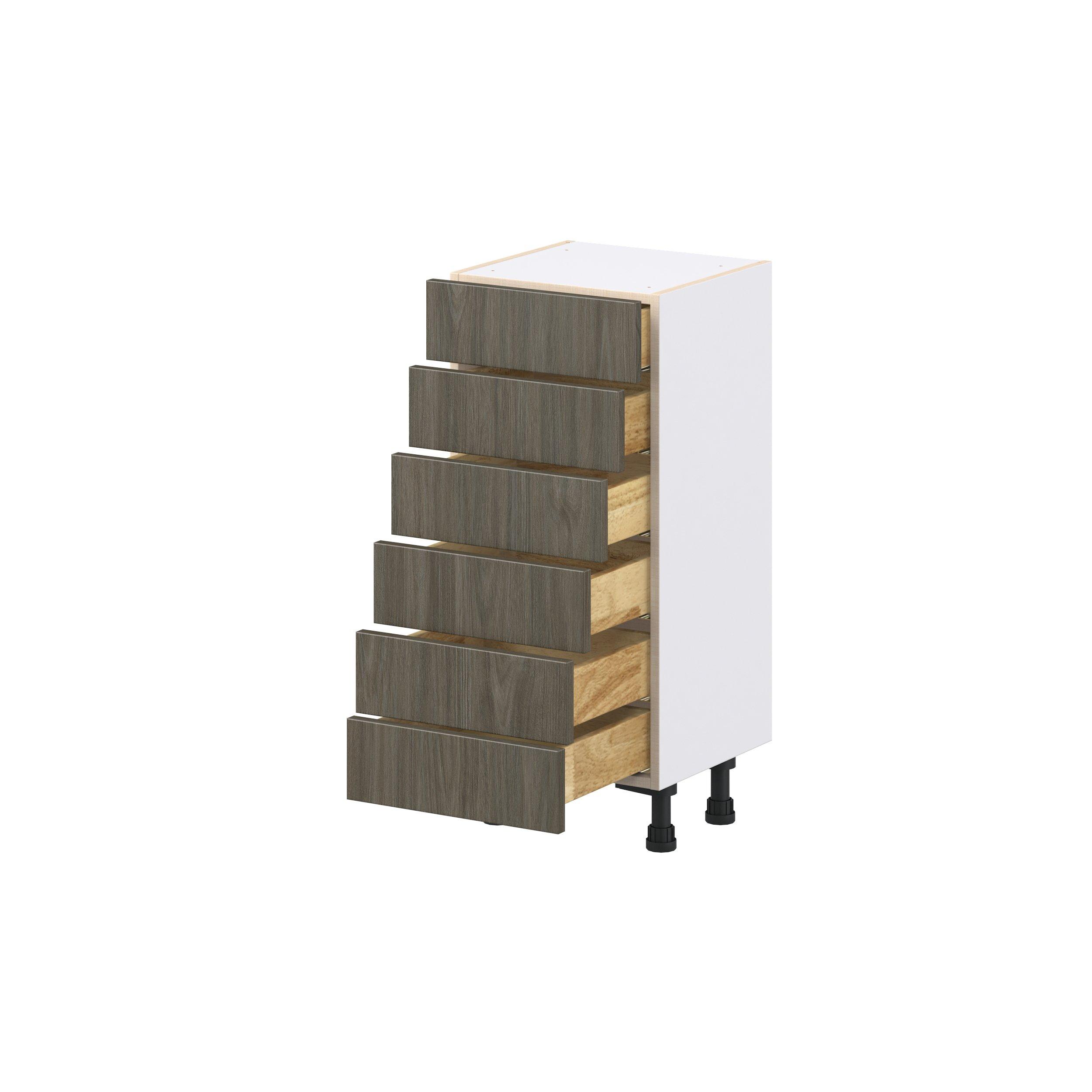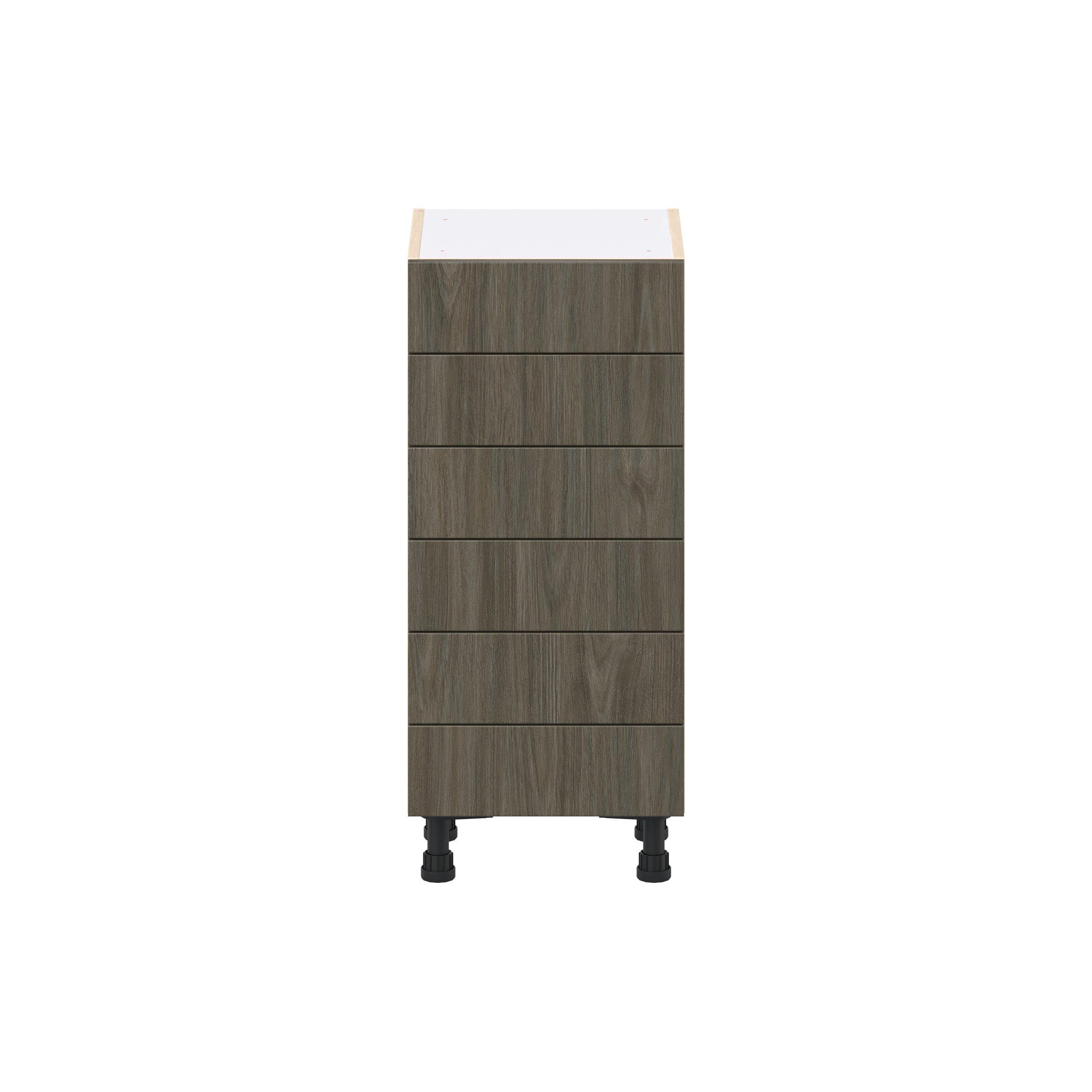 Elevate your project with the contemporary charm of Glenwood slab-style cabinets. Available in desert Mojavi oak and rich burnt walnut finishes, this collection captures the warmth and beauty of natural wood with the practicality of textured melamine. Crafted from one-piece MDF Studio Design Collection Glenwood 15 in. Burnt Walnut Shallow Base Cabinet is designed to resist hairline cracks while the easy-to-clean finish stands up to stains and moisture. Featuring 5-piece doors and dovetail drawer joints, these cabinets offer durability and elegance. This collection combines style with everyday storage solutions.