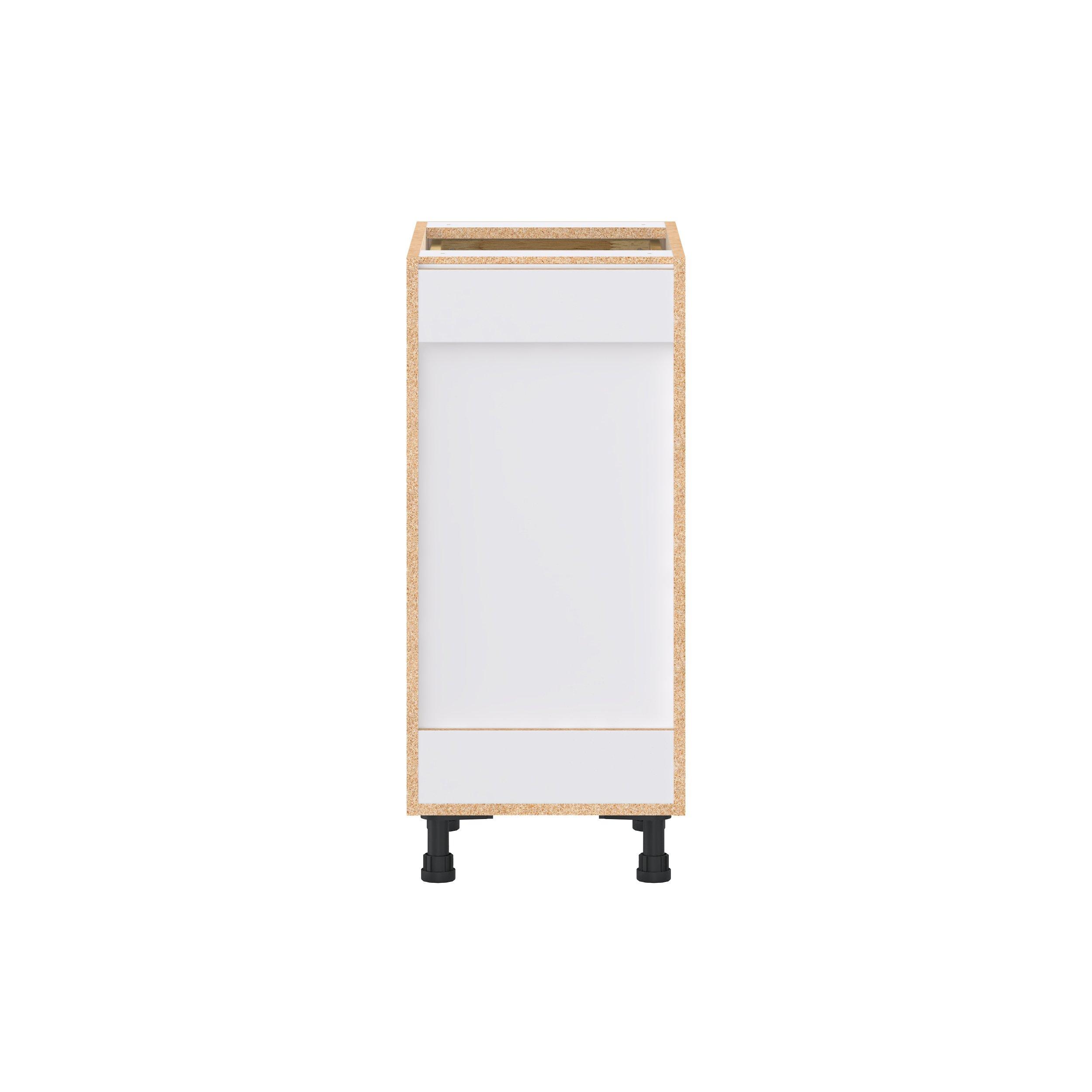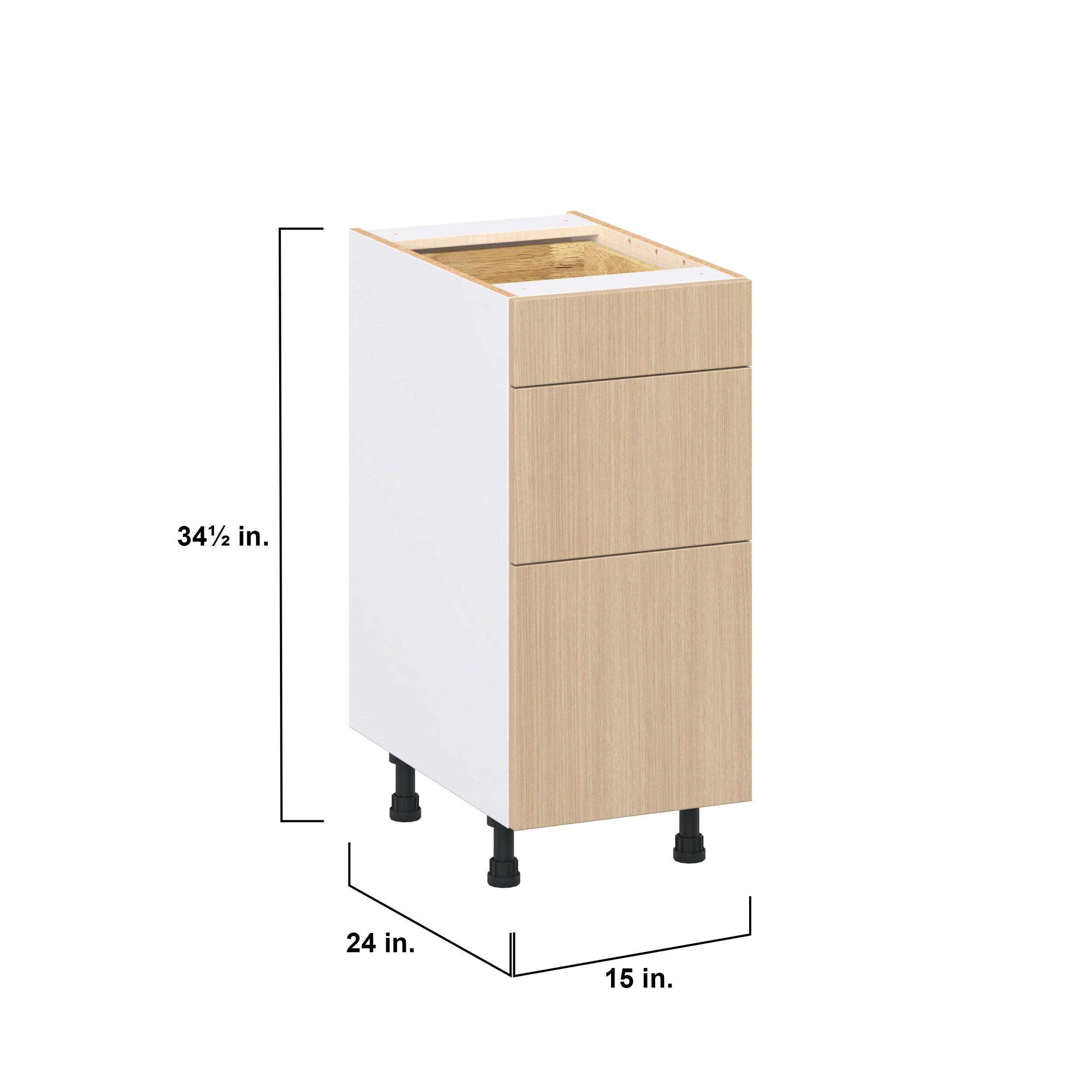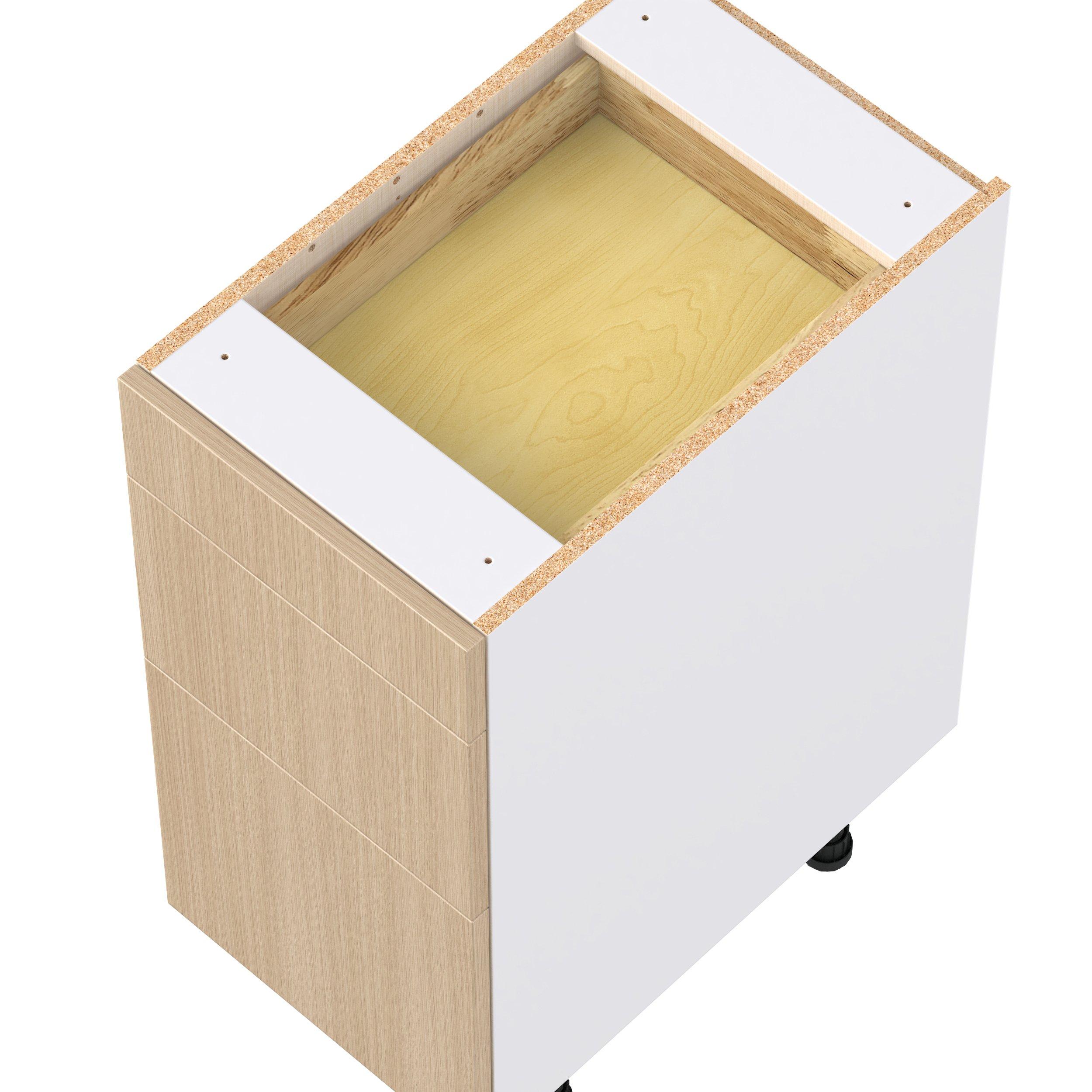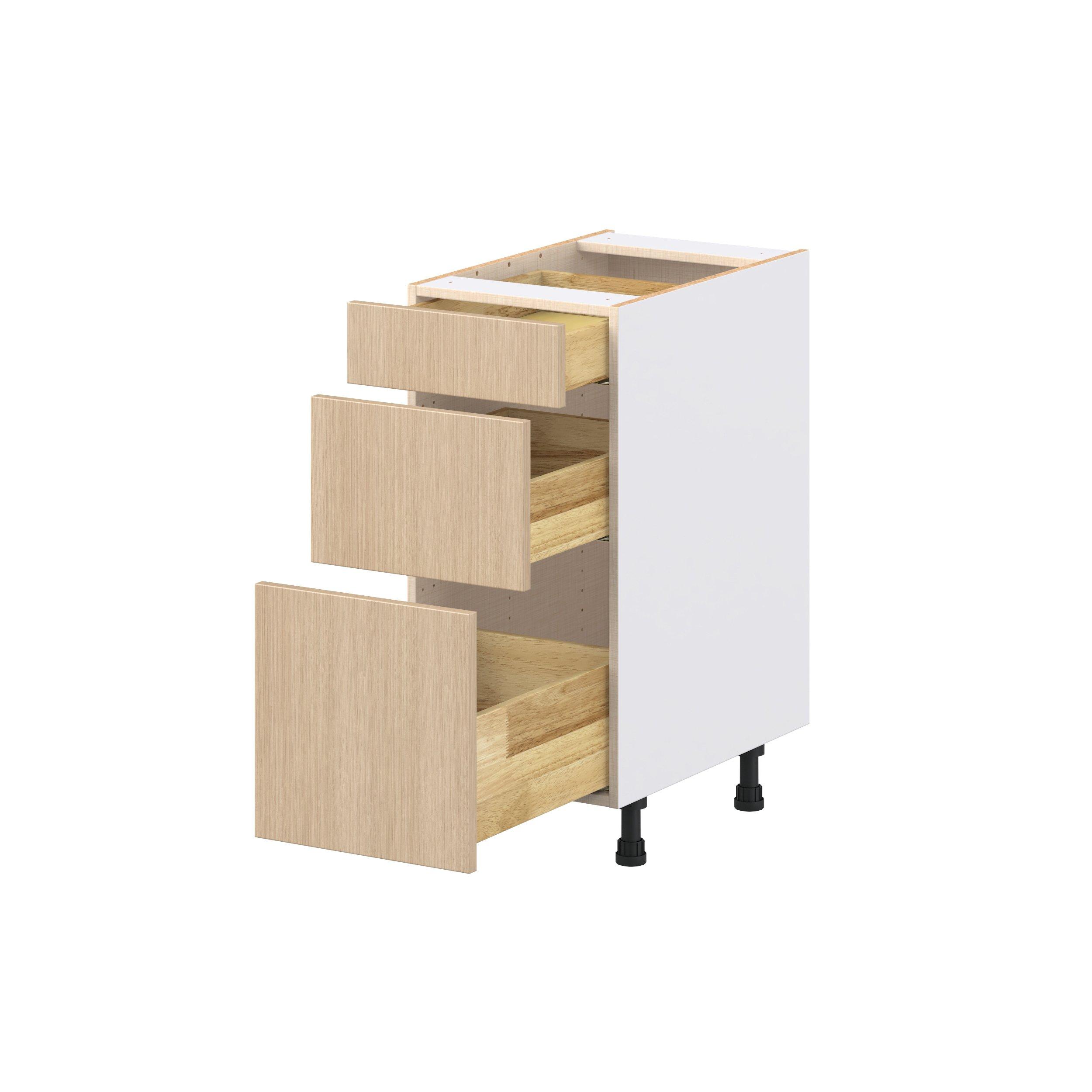 Elevate your project with the contemporary charm of Glenwood slab-style cabinets. Available in desert Mojavi oak and rich burnt walnut finishes, this collection captures the warmth and beauty of natural wood with the practicality of textured melamine. Crafted from one-piece MDF Studio Design Collection Glenwood 15 in. Mojavi Oak Drawer Base Cabinet is designed to resist hairline cracks while the easy-to-clean finish stands up to stains and moisture. Featuring 5-piece doors and dovetail drawer joints, these cabinets offer durability and elegance. This collection combines style with everyday storage solutions.