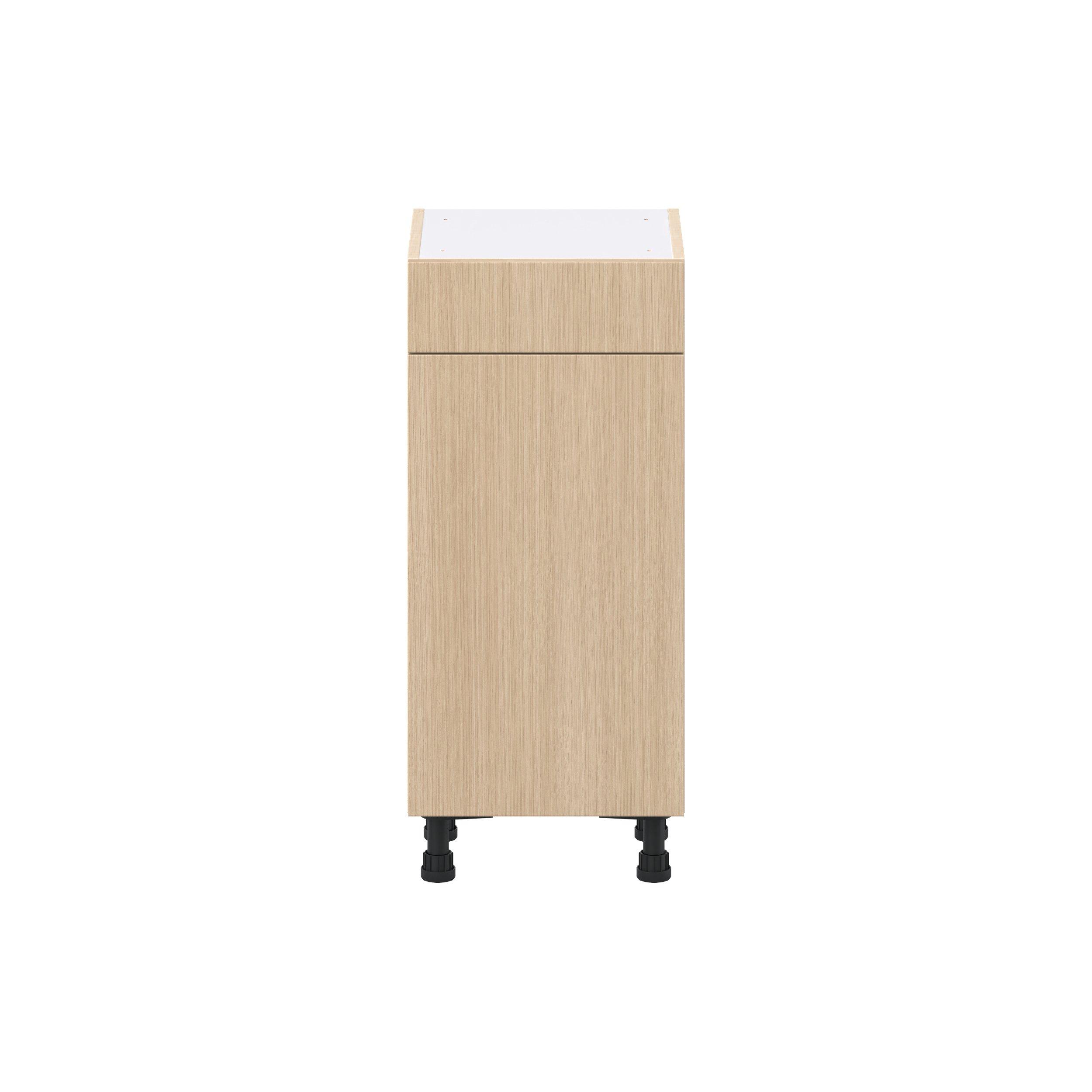 Elevate your project with the contemporary charm of Glenwood slab-style cabinets. Available in desert Mojavi oak and rich burnt walnut finishes, this collection captures the warmth and beauty of natural wood with the practicality of textured melamine. Crafted from one-piece MDF Studio Design Collection Glenwood 15 in. Mojavi Oak Shallow Base Cabinet is designed to resist hairline cracks while the easy-to-clean finish stands up to stains and moisture. Featuring 5-piece doors and dovetail drawer joints, these cabinets offer durability and elegance. This collection combines style with everyday storage solutions.