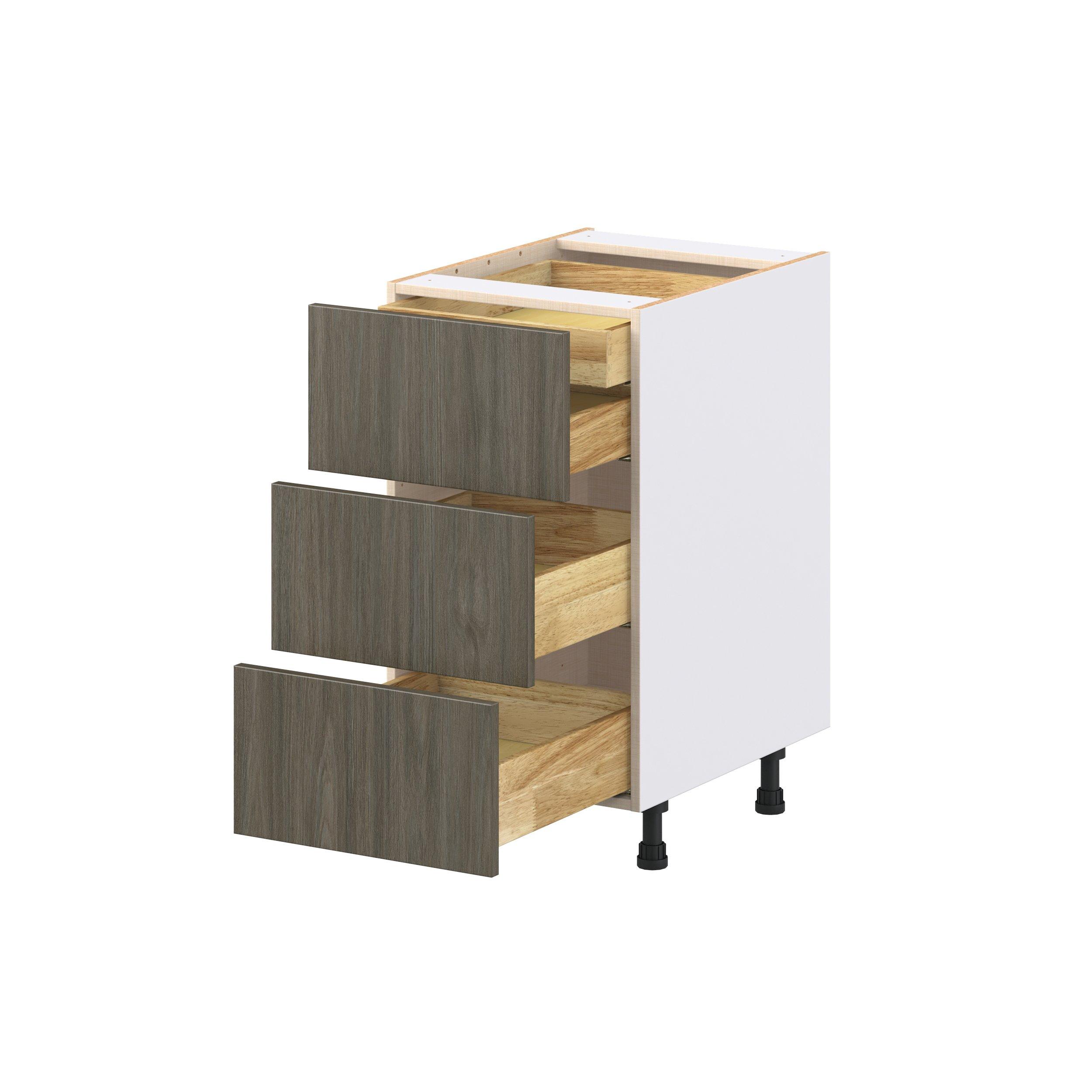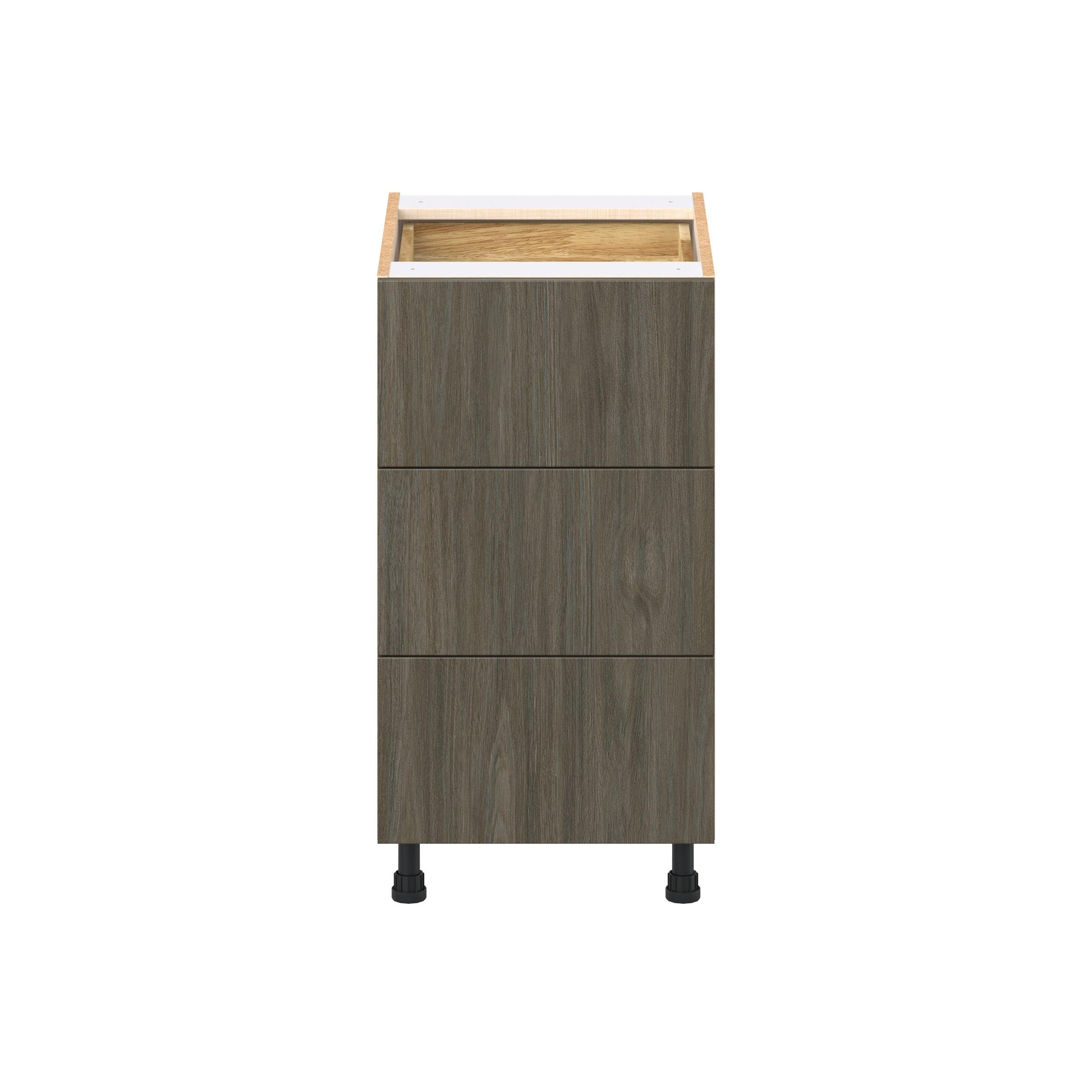 Elevate your project with the contemporary charm of Glenwood slab-style cabinets. Available in desert Mojavi oak and rich burnt walnut finishes, this collection captures the warmth and beauty of natural wood with the practicality of textured melamine. Crafted from one-piece MDF Studio Design Collection Glenwood 18 in. Burnt Walnut Base Cabinet with Inner Pull-Out Drawer is designed to resist hairline cracks while the easy-to-clean finish stands up to stains and moisture. Featuring 5-piece doors and dovetail drawer joints, these cabinets offer durability and elegance. This collection combines style with everyday storage solutions.