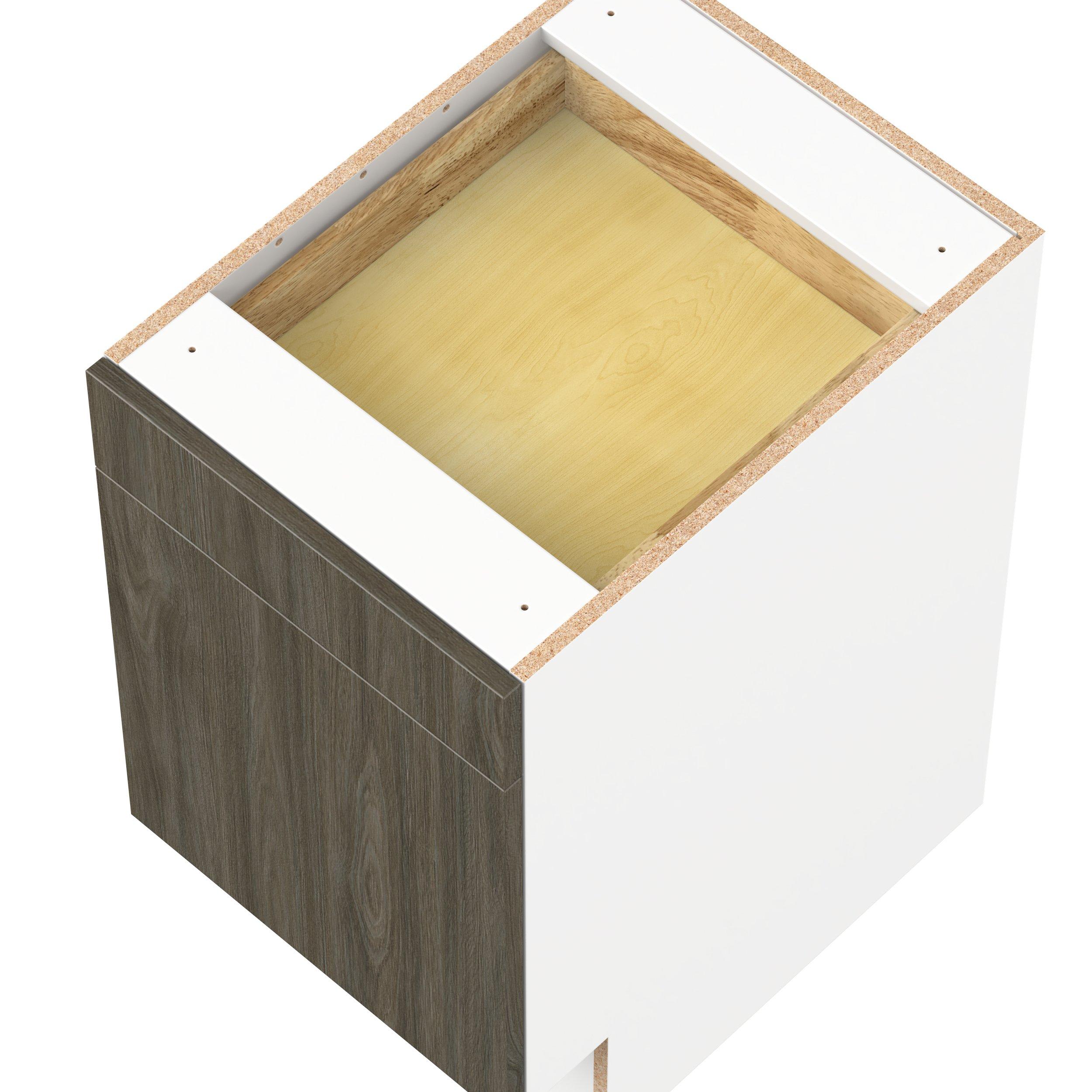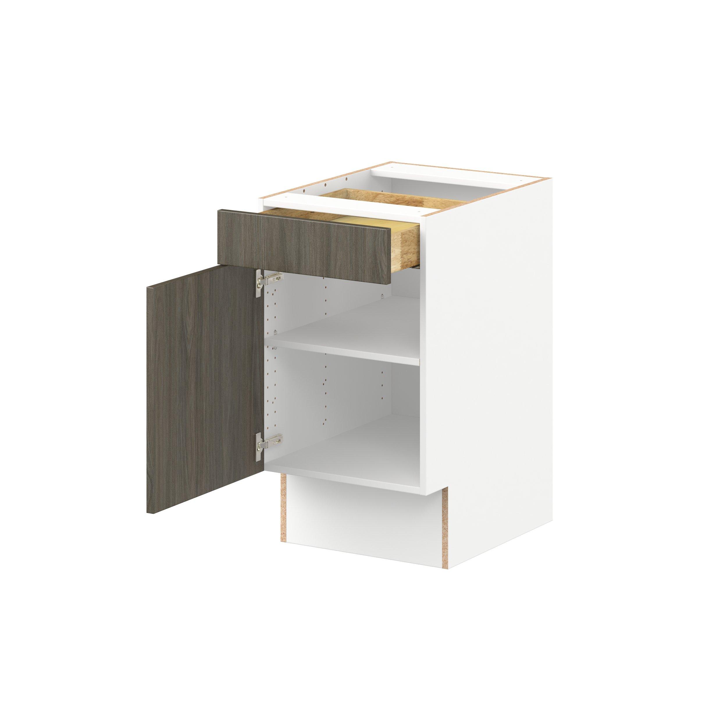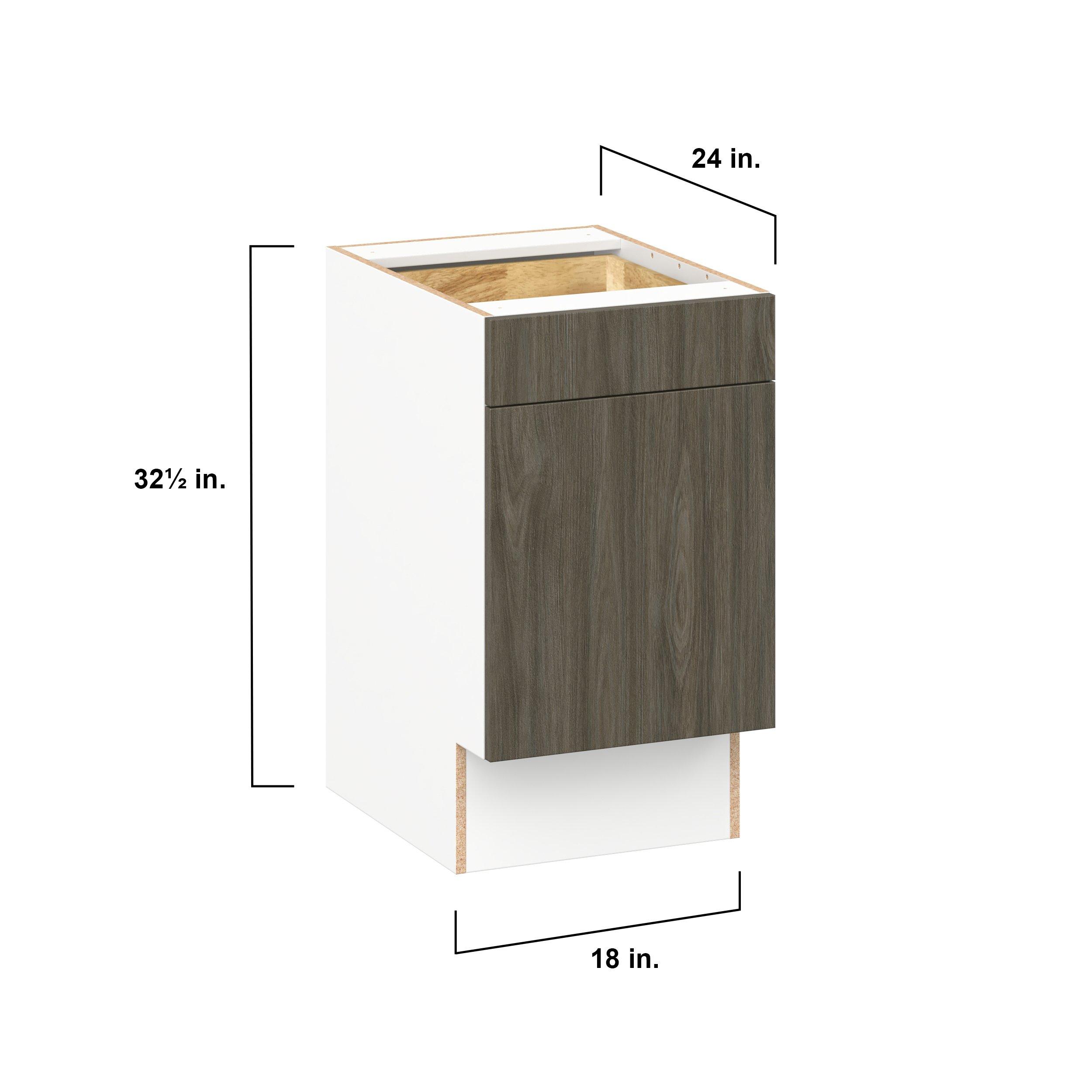 Elevate your project with the contemporary charm of Glenwood slab-style cabinets. Available in desert Mojavi oak and rich burnt walnut finishes, this collection captures the warmth and beauty of natural wood with the practicality of textured melamine. Crafted from one-piece MDF Studio Design Collection Glenwood 18 in. Burnt Walnut Door and Drawer Base Cabinet - ADA is designed to resist hairline cracks while the easy-to-clean finish stands up to stains and moisture. Featuring 5-piece doors and dovetail drawer joints, these cabinets offer durability and elegance. This collection combines style with everyday storage solutions.