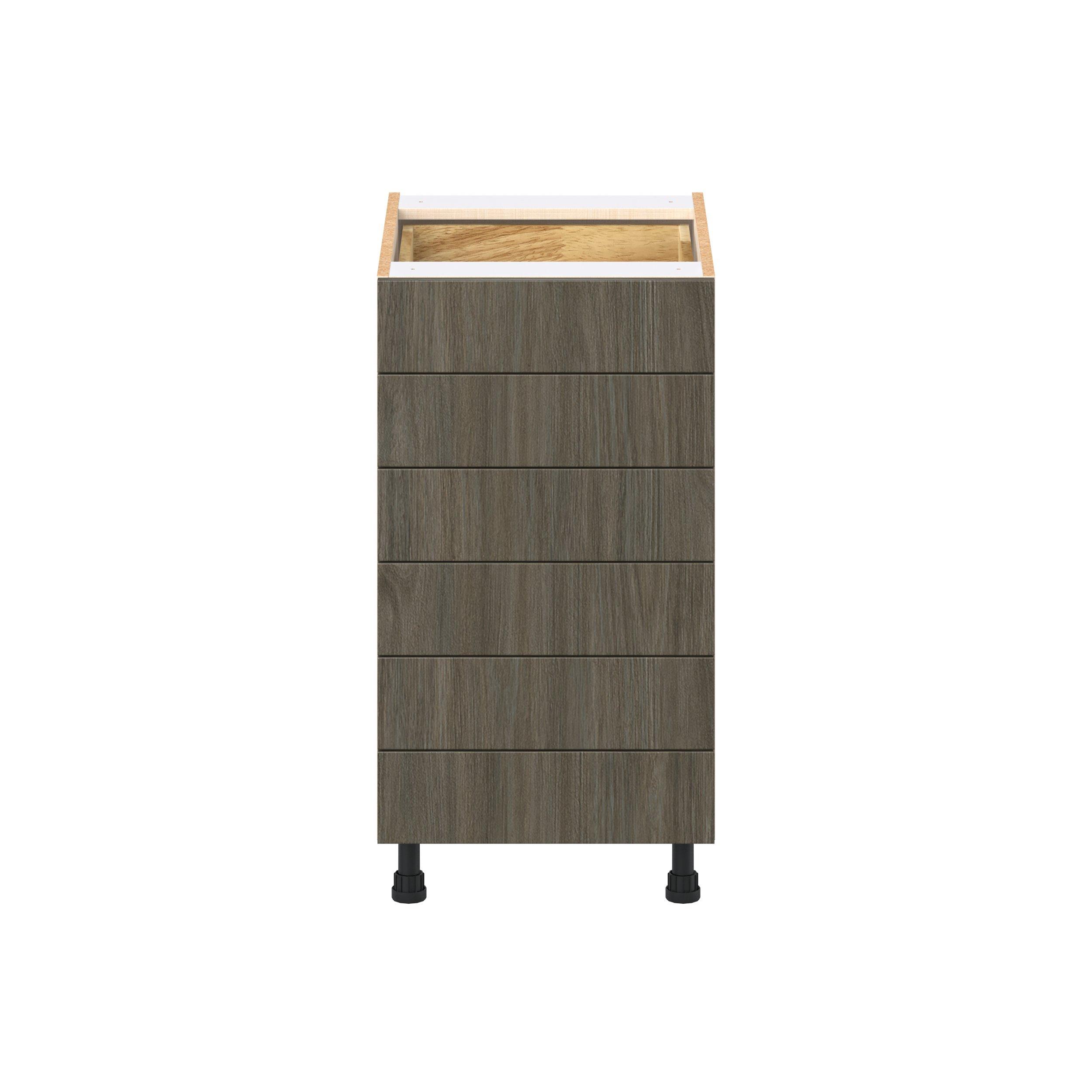 Elevate your project with the contemporary charm of Glenwood slab-style cabinets. Available in desert Mojavi oak and rich burnt walnut finishes, this collection captures the warmth and beauty of natural wood with the practicality of textured melamine. Crafted from one-piece MDF Studio Design Collection Glenwood 18 in. Burnt Walnut Drawer Base Cabinet is designed to resist hairline cracks while the easy-to-clean finish stands up to stains and moisture. Featuring 5-piece doors and dovetail drawer joints, these cabinets offer durability and elegance. This collection combines style with everyday storage solutions.