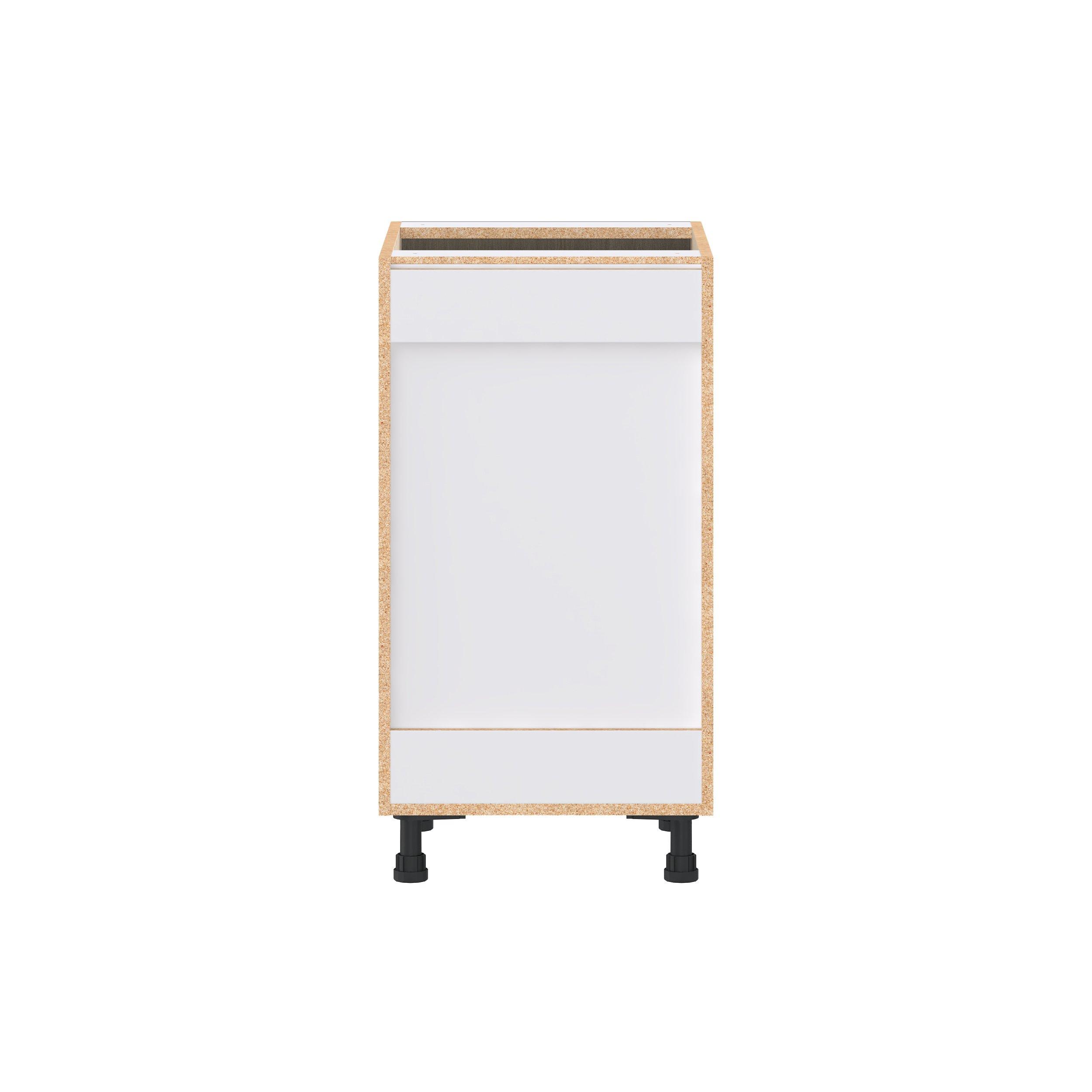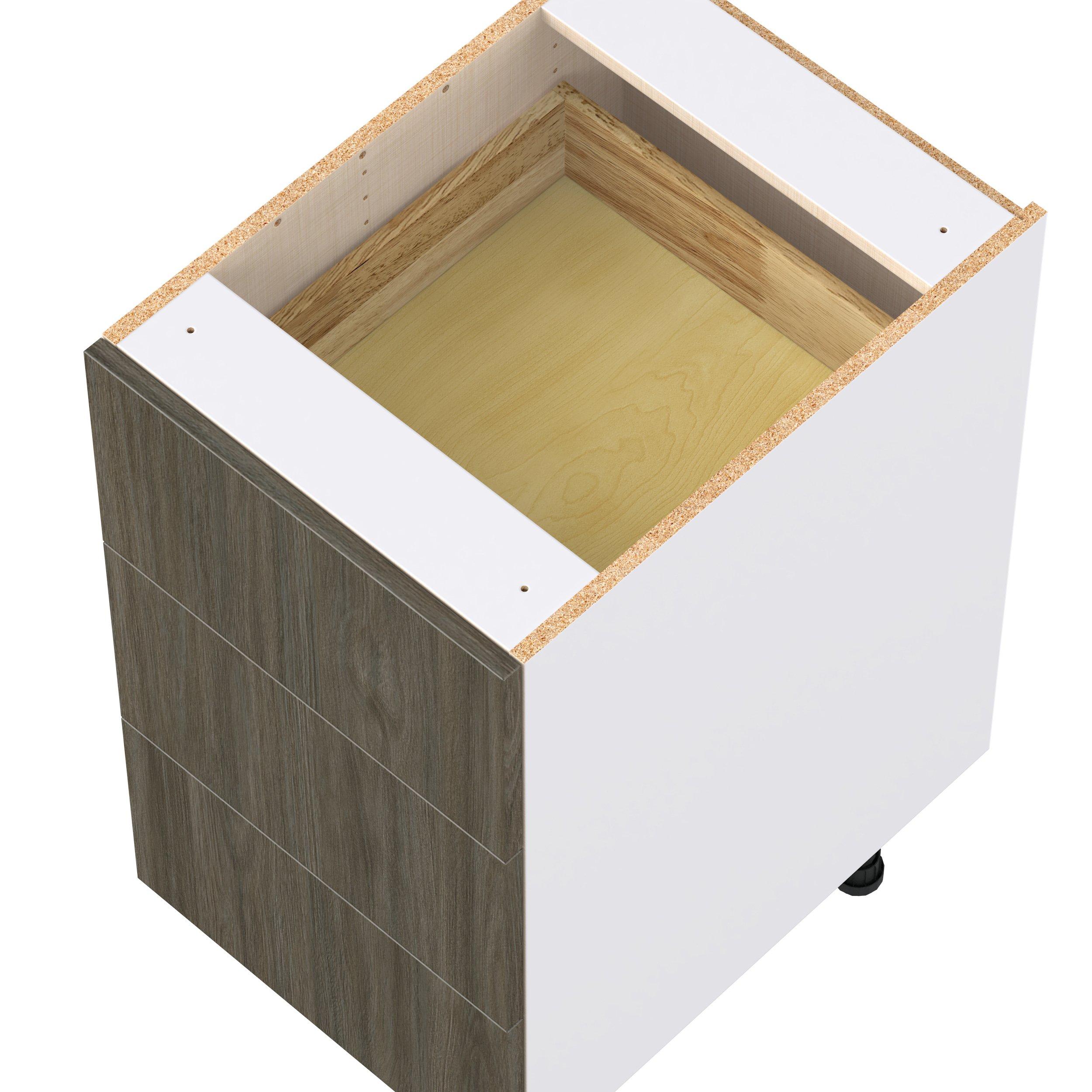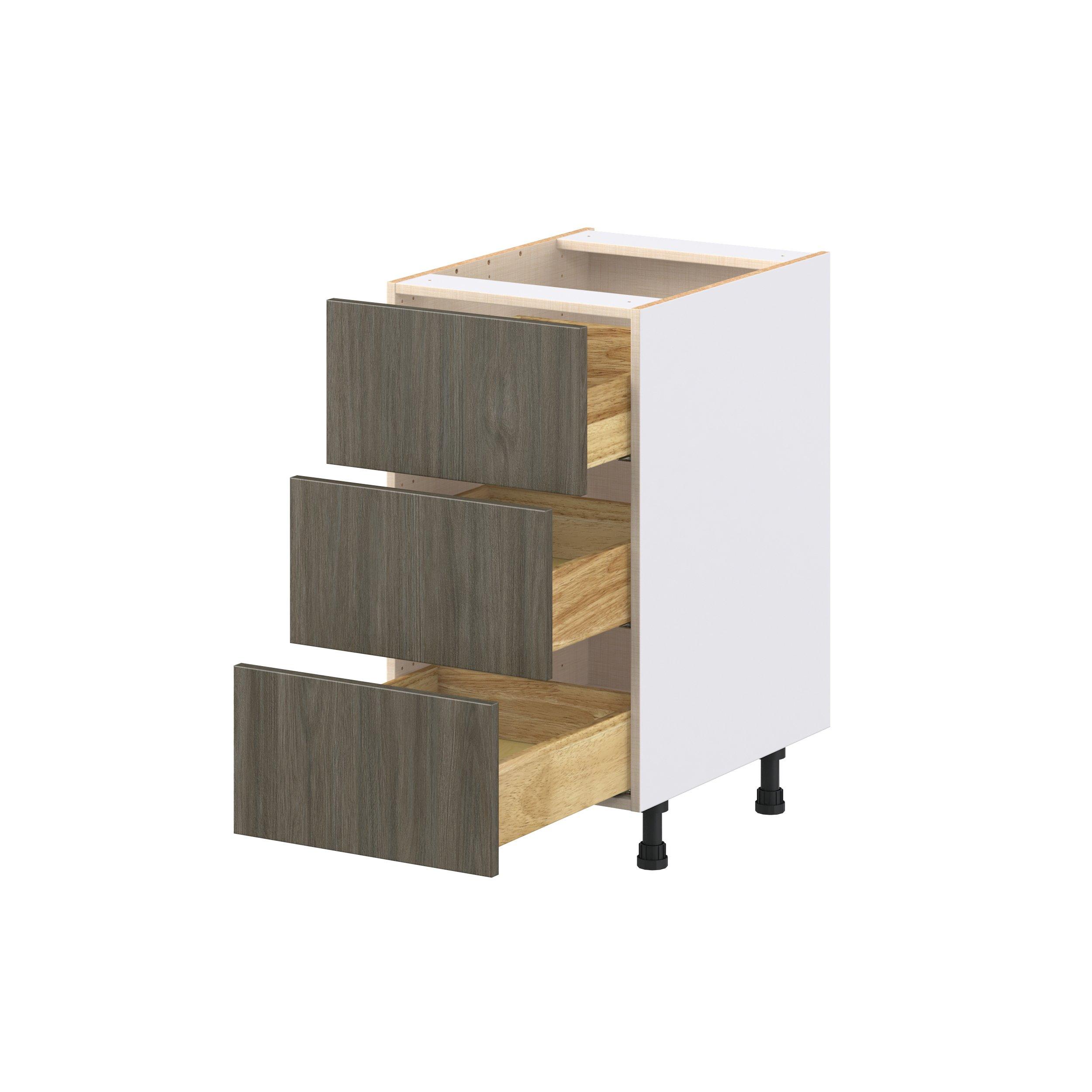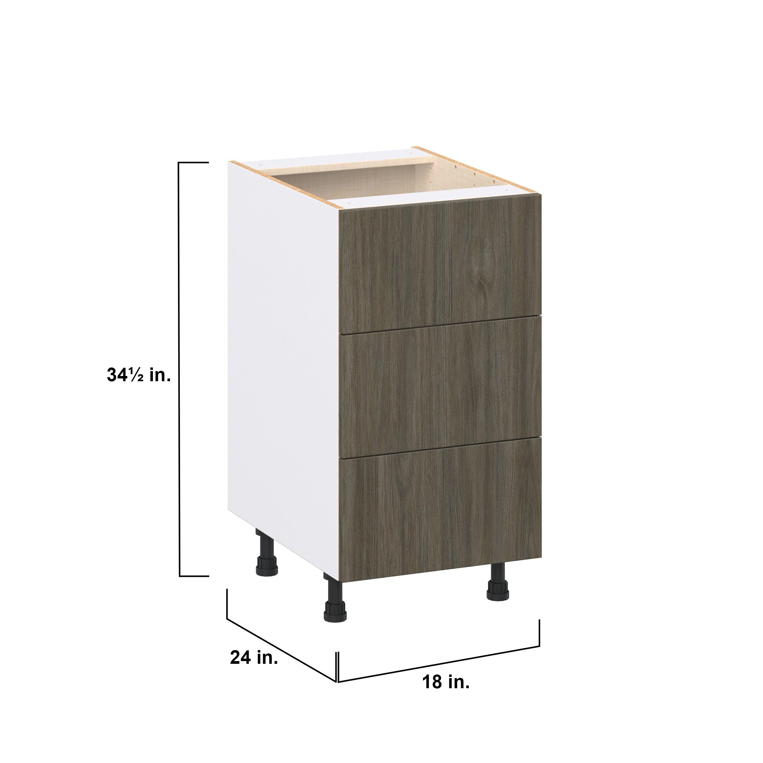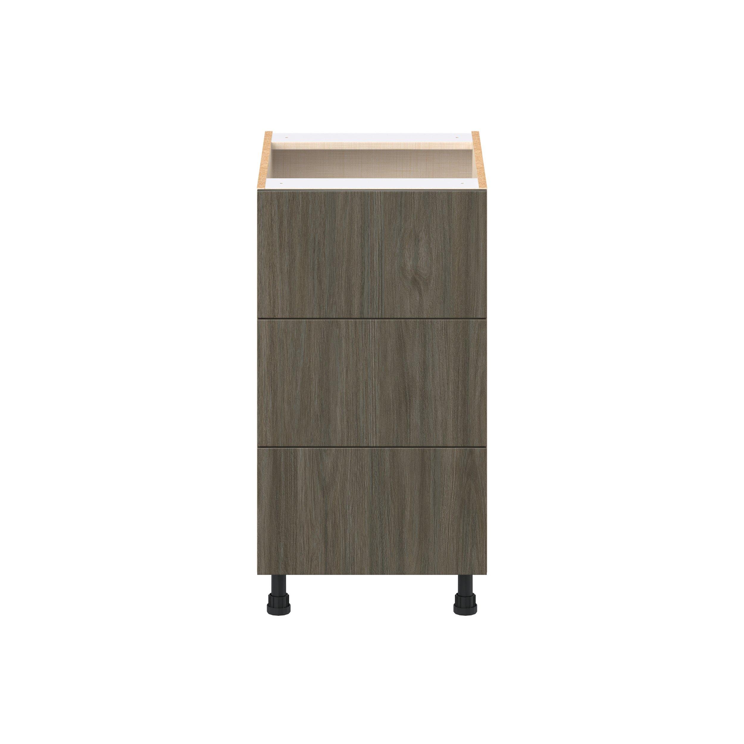 Elevate your project with the contemporary charm of Glenwood slab-style cabinets. Available in desert Mojavi oak and rich burnt walnut finishes, this collection captures the warmth and beauty of natural wood with the practicality of textured melamine. Crafted from one-piece MDF Studio Design Collection Glenwood 18 in. Burnt Walnut Drawer Base Cabinet is designed to resist hairline cracks while the easy-to-clean finish stands up to stains and moisture. Featuring 5-piece doors and dovetail drawer joints, these cabinets offer durability and elegance. This collection combines style with everyday storage solutions.