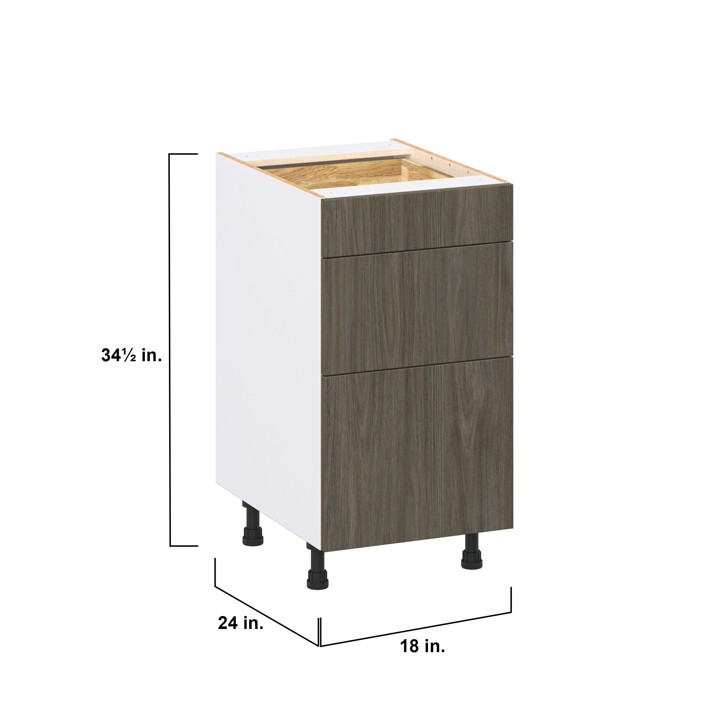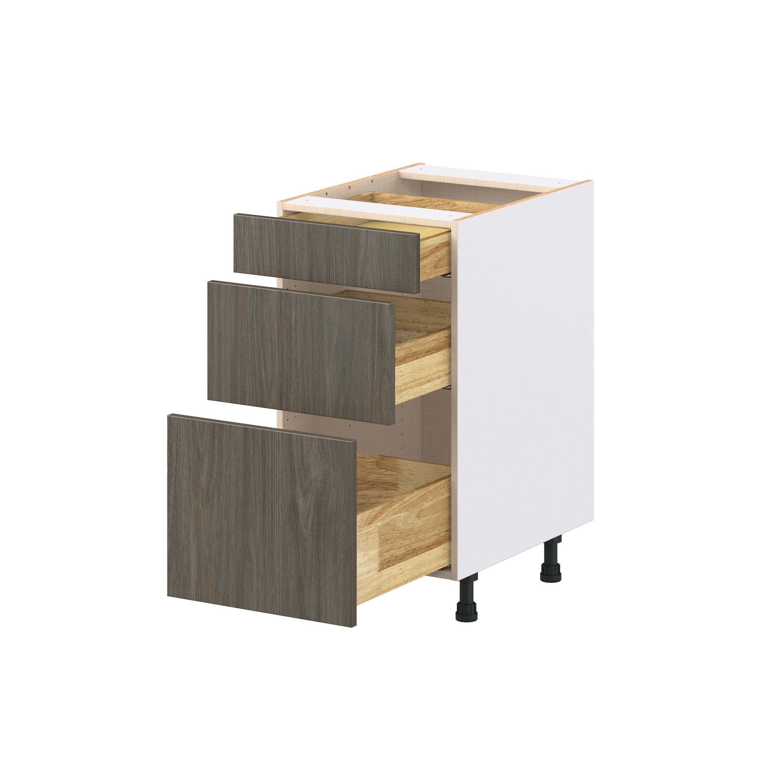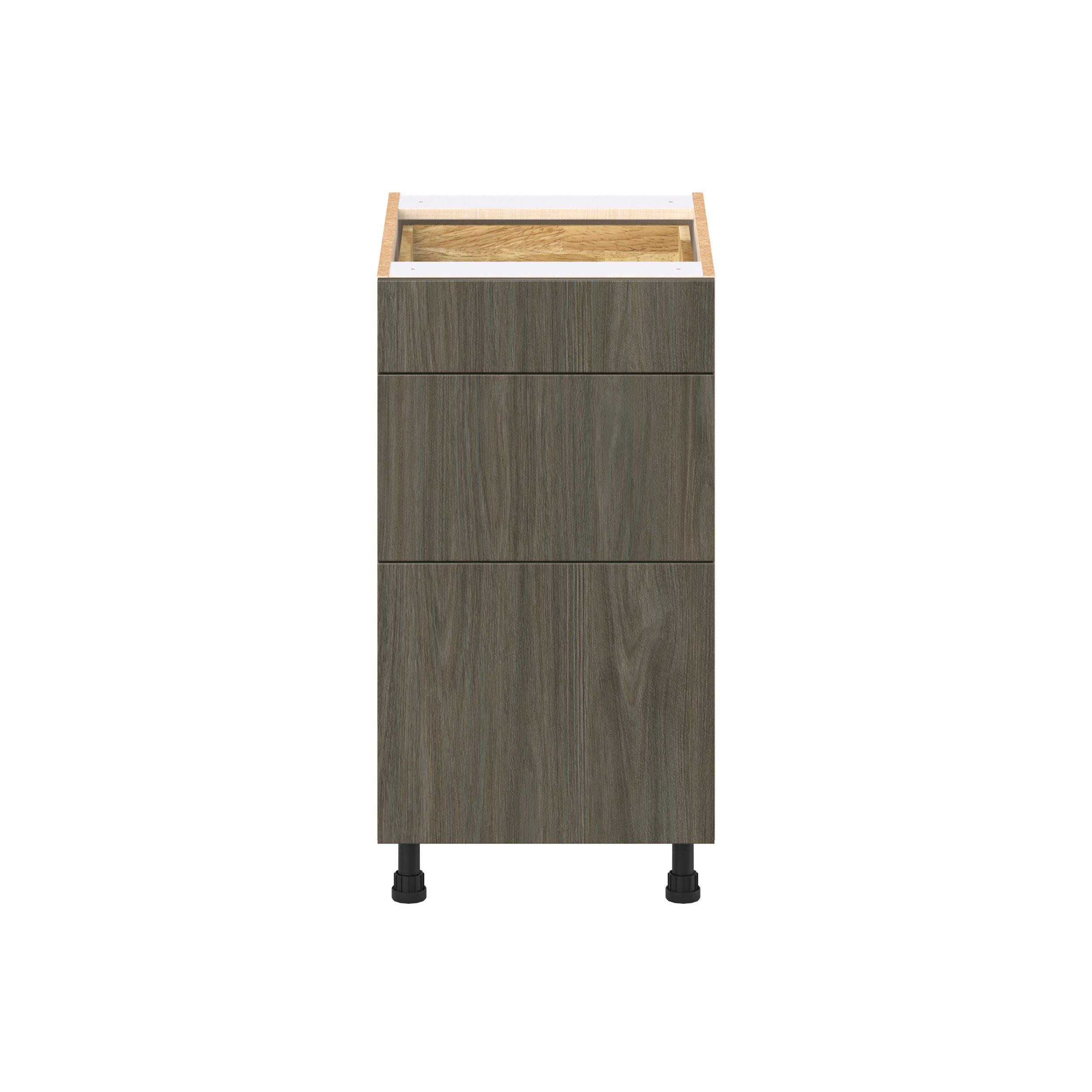 Elevate your project with the contemporary charm of Glenwood slab-style cabinets. Available in desert Mojavi oak and rich burnt walnut finishes, this collection captures the warmth and beauty of natural wood with the practicality of textured melamine. Crafted from one-piece MDF Studio Design Collection Glenwood 18 in. Burnt Walnut Drawer Base Cabinet is designed to resist hairline cracks while the easy-to-clean finish stands up to stains and moisture. Featuring 5-piece doors and dovetail drawer joints, these cabinets offer durability and elegance. This collection combines style with everyday storage solutions.