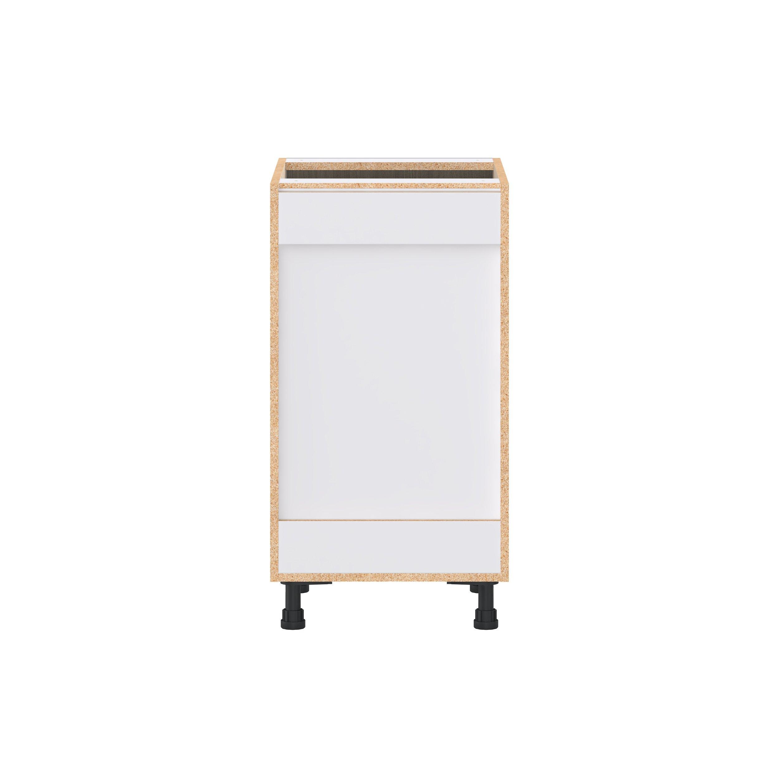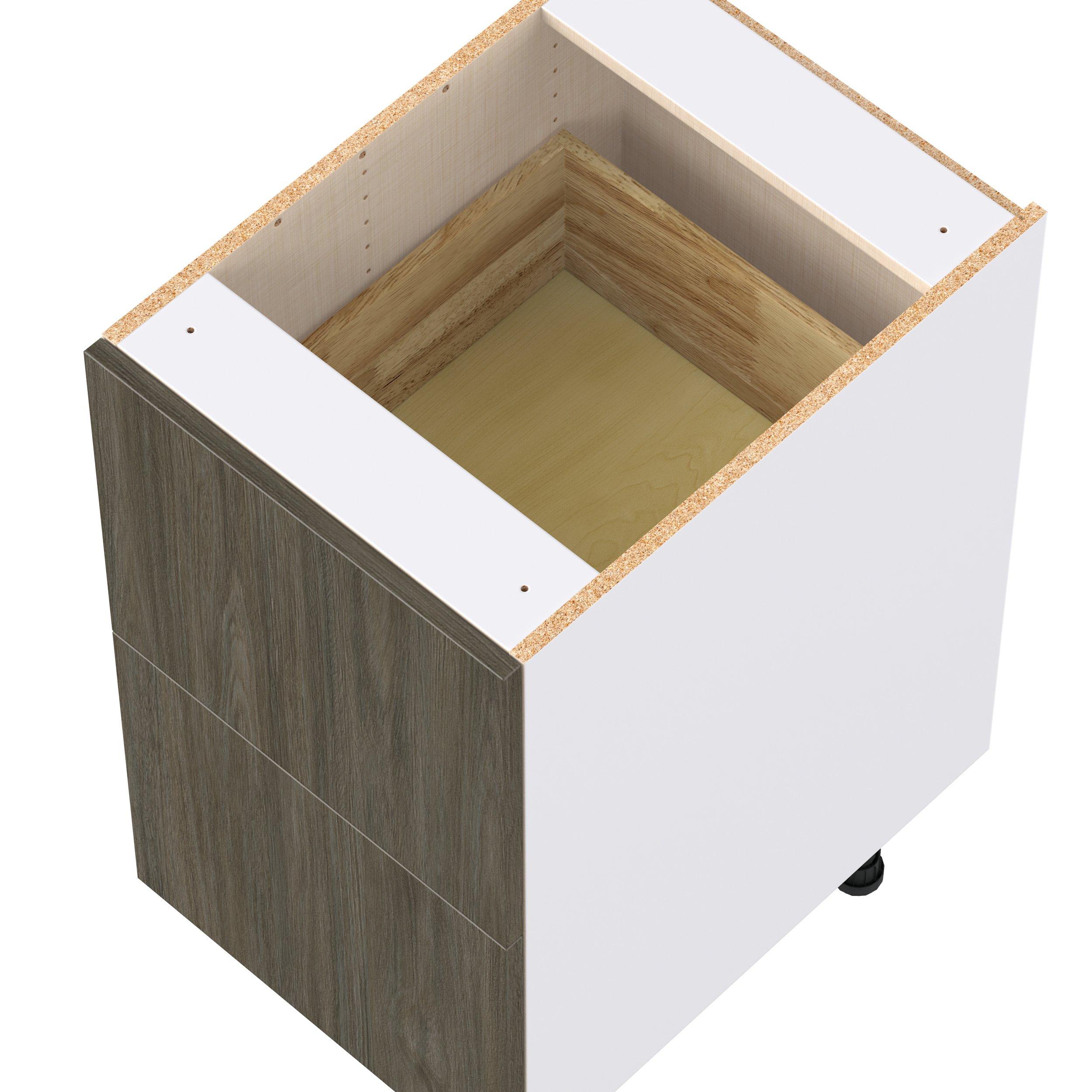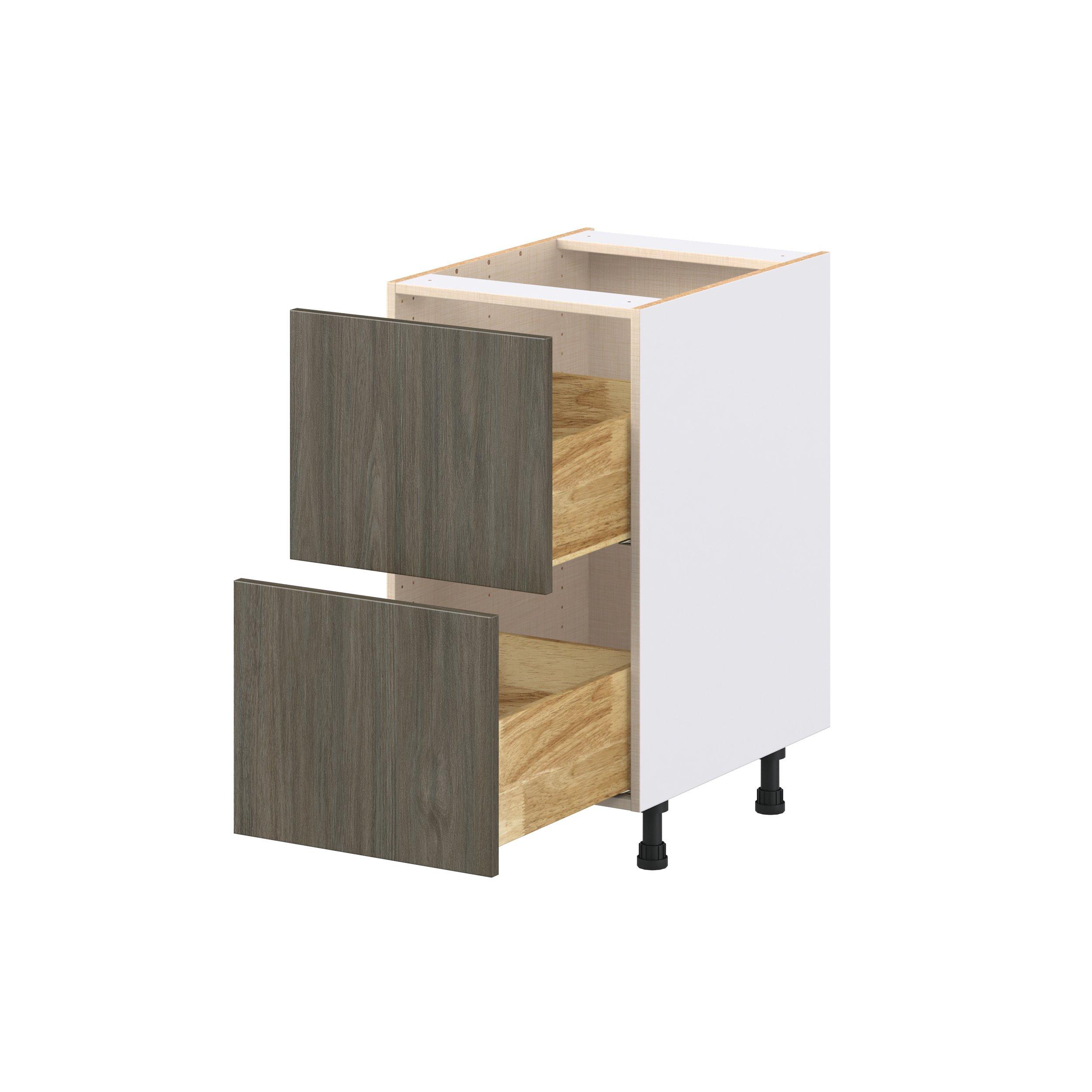 Elevate your project with the contemporary charm of Glenwood slab-style cabinets. Available in desert Mojavi oak and rich burnt walnut finishes, this collection captures the warmth and beauty of natural wood with the practicality of textured melamine. Crafted from one-piece MDF Studio Design Collection Glenwood 18 in. Burnt Walnut Drawer Base Cabinet is designed to resist hairline cracks while the easy-to-clean finish stands up to stains and moisture. Featuring 5-piece doors and dovetail drawer joints, these cabinets offer durability and elegance. This collection combines style with everyday storage solutions.