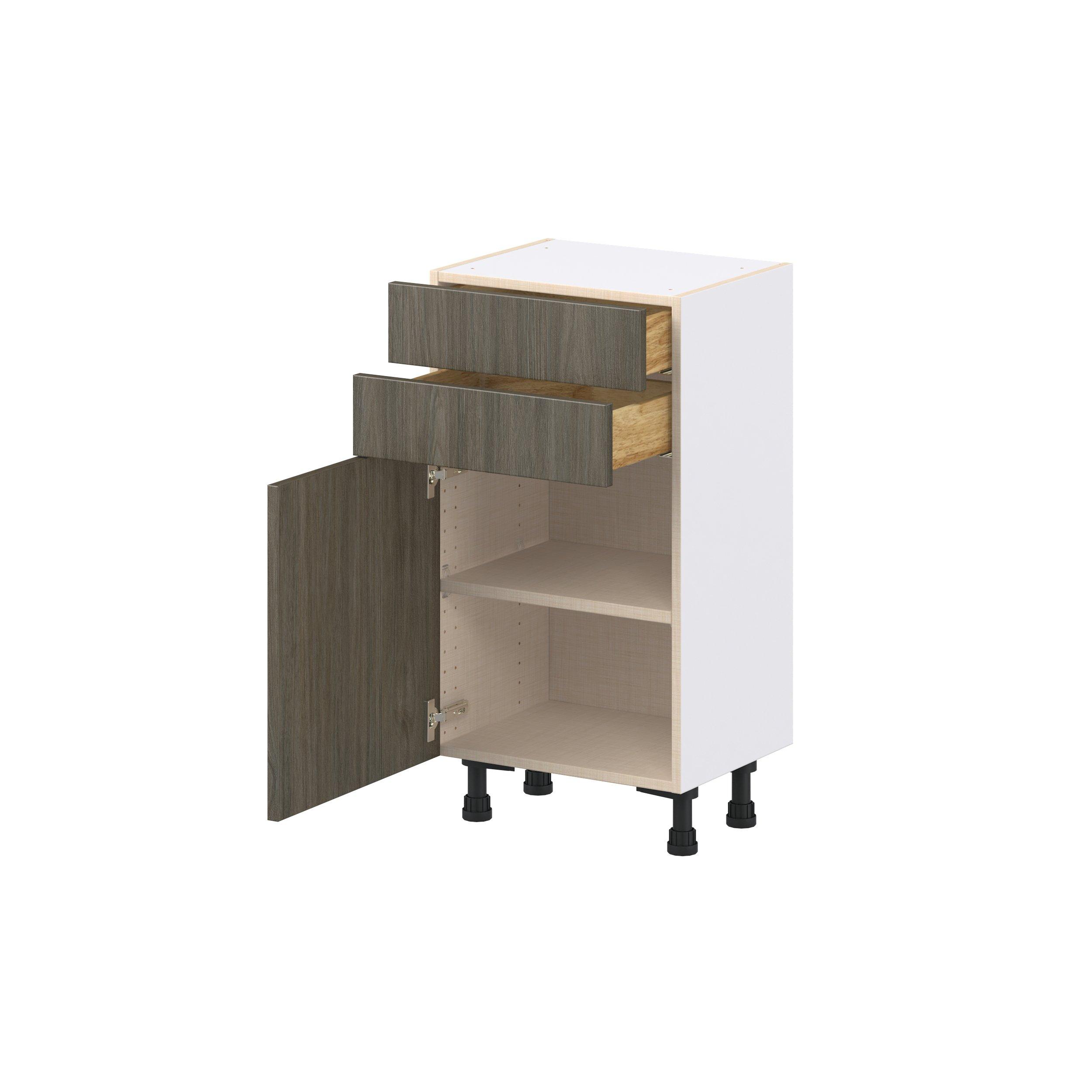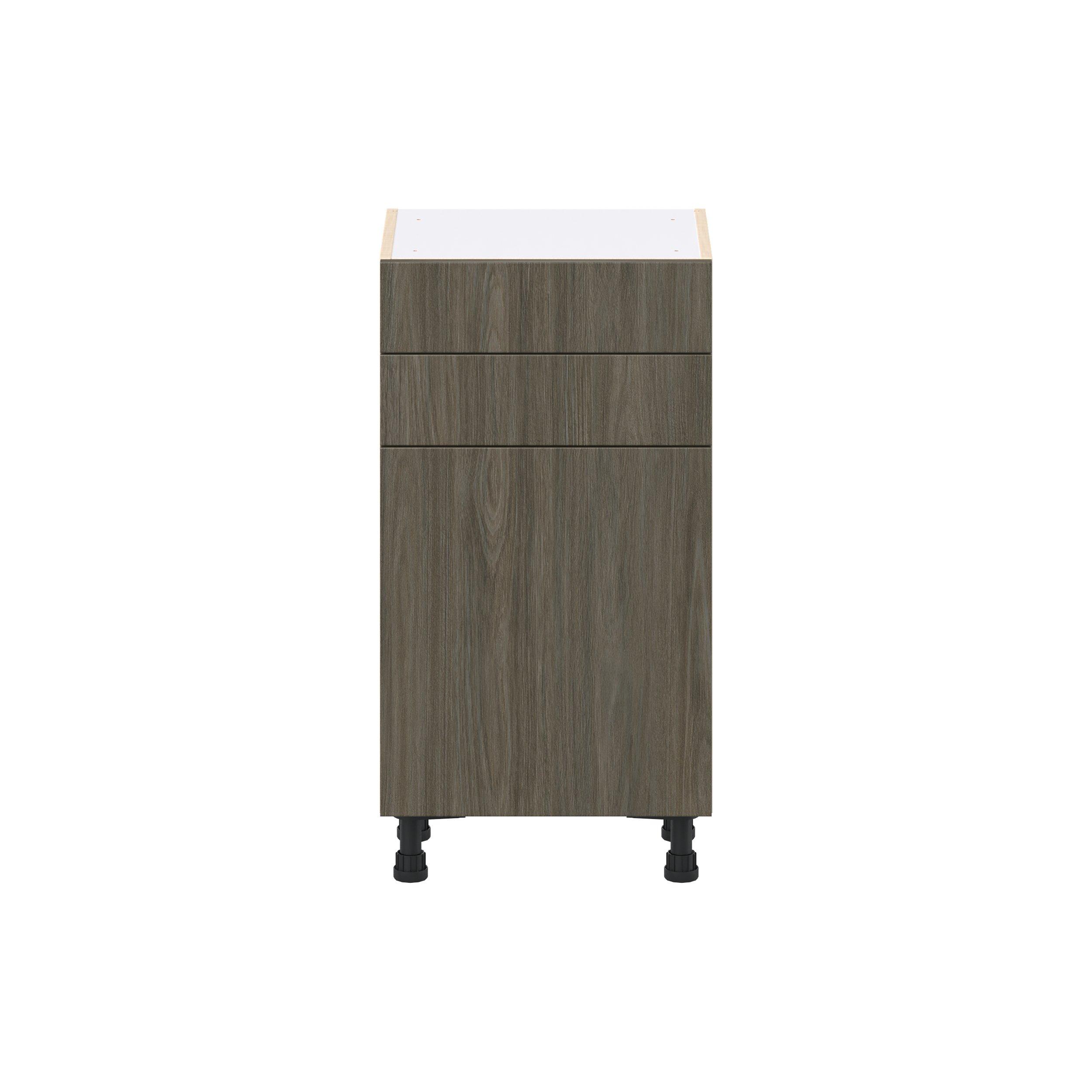 Elevate your project with the contemporary charm of Glenwood slab-style cabinets. Available in desert Mojavi oak and rich burnt walnut finishes, this collection captures the warmth and beauty of natural wood with the practicality of textured melamine. Crafted from one-piece MDF Studio Design Collection Glenwood 18 in. Burnt Walnut Shallow Base Cabinet is designed to resist hairline cracks while the easy-to-clean finish stands up to stains and moisture. Featuring 5-piece doors and dovetail drawer joints, these cabinets offer durability and elegance. This collection combines style with everyday storage solutions.