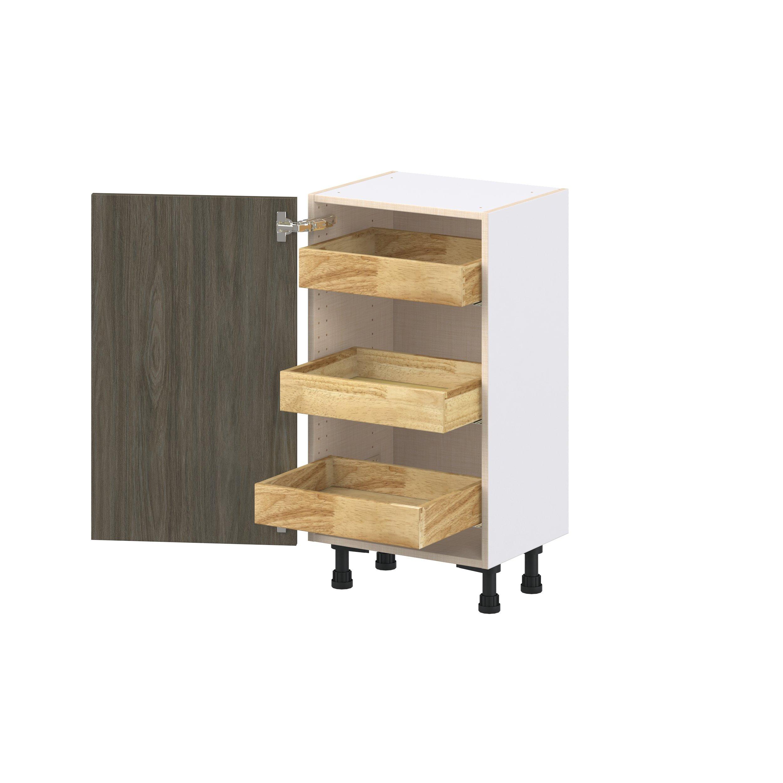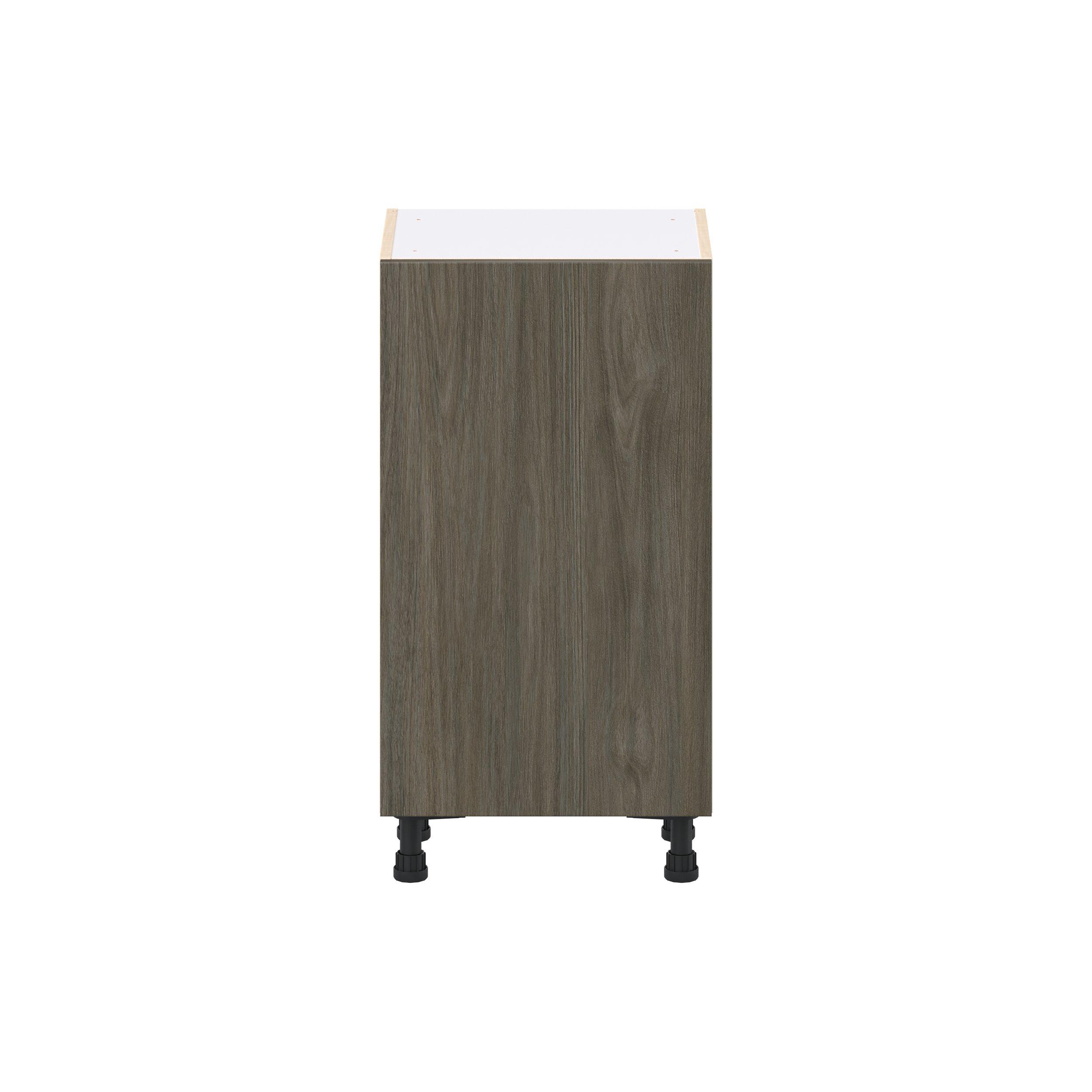 Elevate your project with the contemporary charm of Glenwood slab-style cabinets. Available in desert Mojavi oak and rich burnt walnut finishes, this collection captures the warmth and beauty of natural wood with the practicality of textured melamine. Crafted from one-piece MDF Studio Design Collection Glenwood 18 in. Burnt Walnut Shallow Base Cabinet with Inner Pull-Out Drawer is designed to resist hairline cracks while the easy-to-clean finish stands up to stains and moisture. Featuring 5-piece doors and dovetail drawer joints, these cabinets offer durability and elegance. This collection combines style with everyday storage solutions.