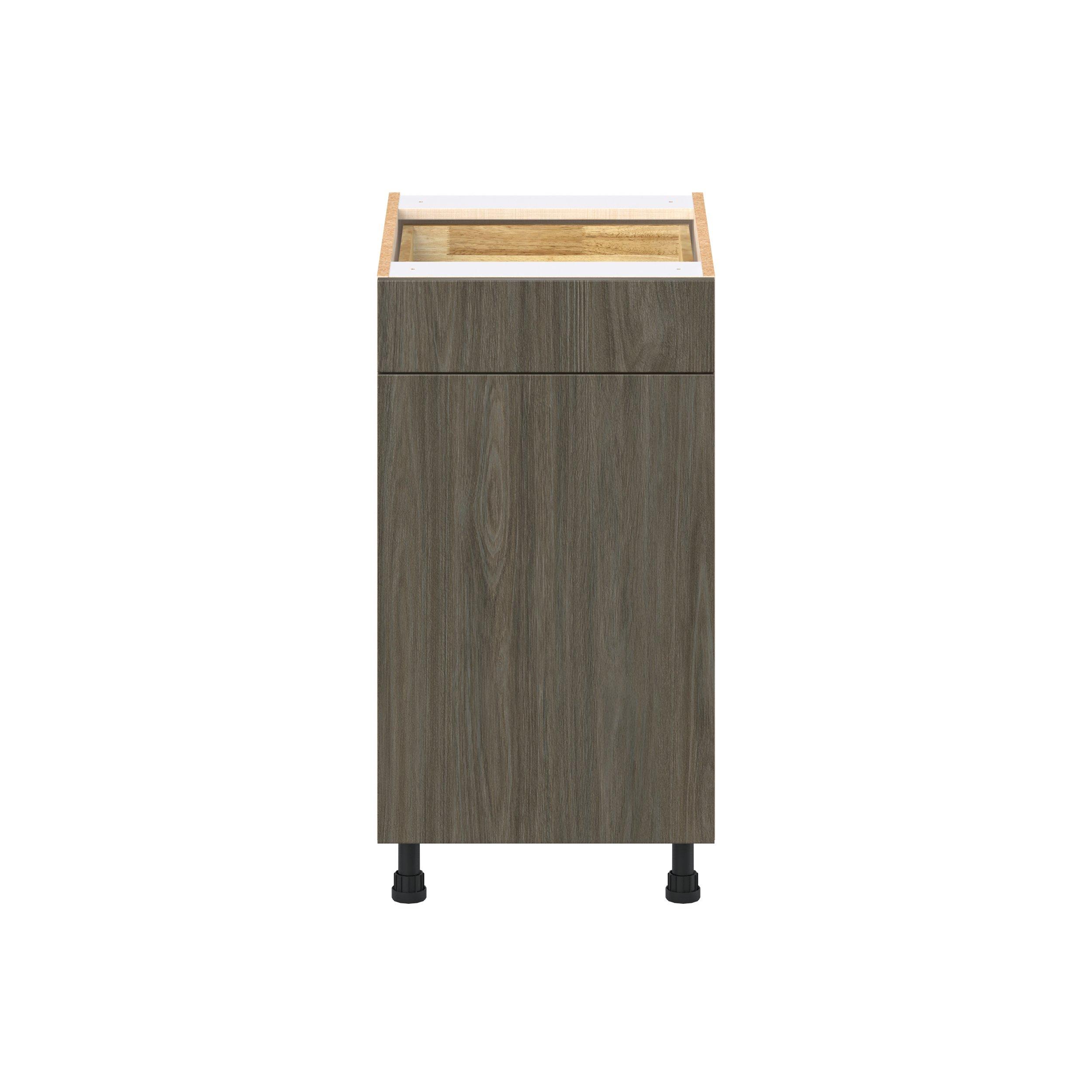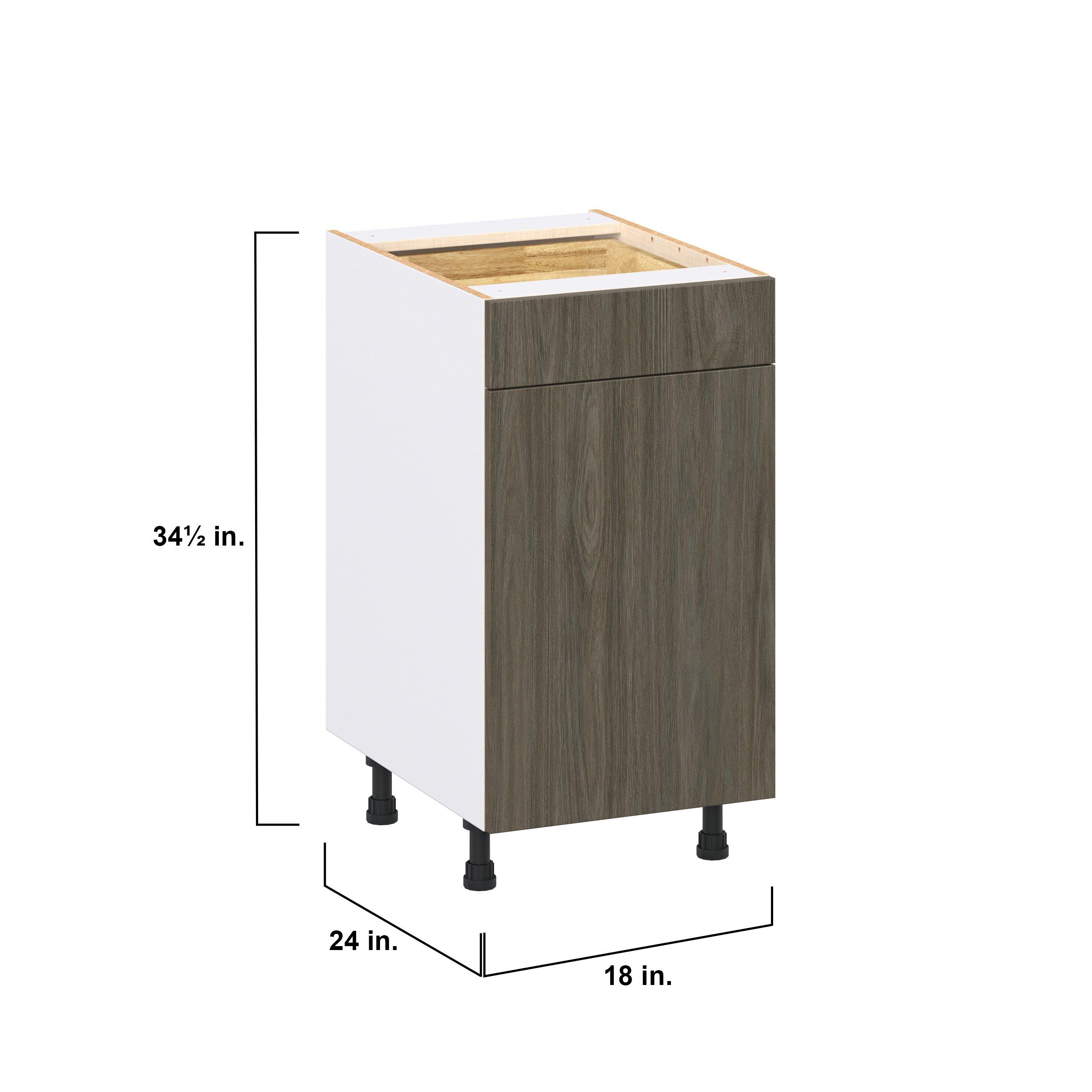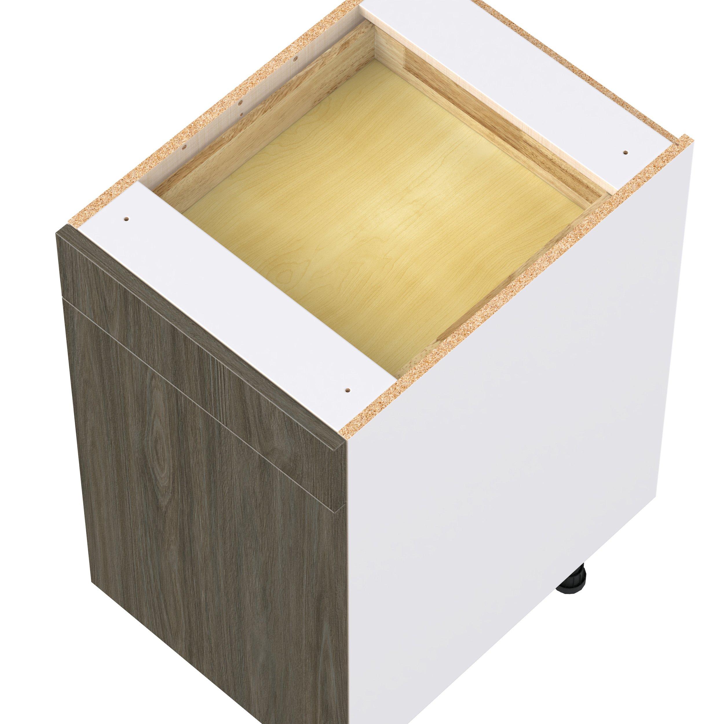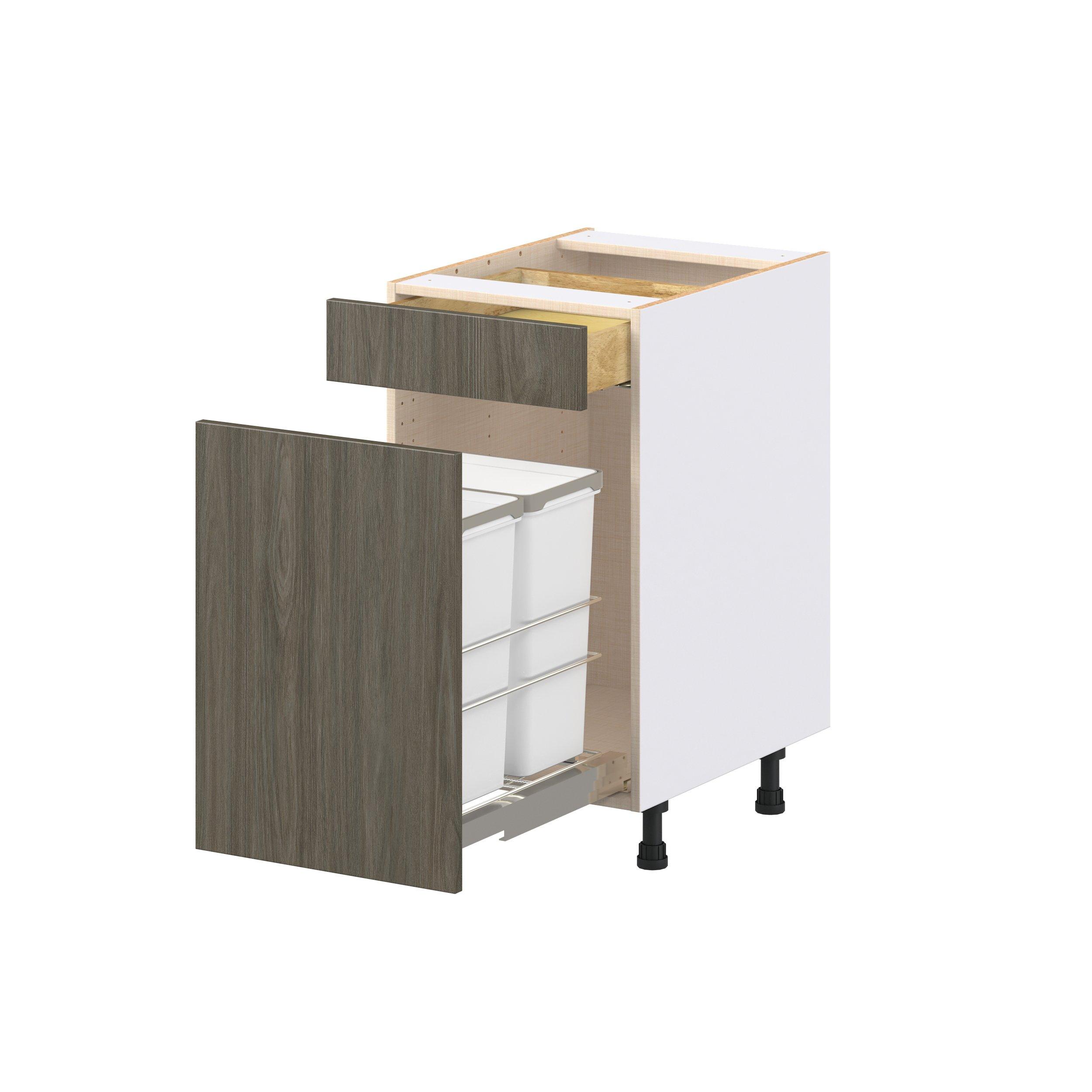 Elevate your project with the contemporary charm of Glenwood slab-style cabinets. Available in desert Mojavi oak and rich burnt walnut finishes, this collection captures the warmth and beauty of natural wood with the practicality of textured melamine. Crafted from one-piece MDF Studio Design Collection Glenwood 18 in. Burnt Walnut Trash Can Pull-Out Base Cabinet is designed to resist hairline cracks while the easy-to-clean finish stands up to stains and moisture. Featuring 5-piece doors and dovetail drawer joints, these cabinets offer durability and elegance. This collection combines style with everyday storage solutions.