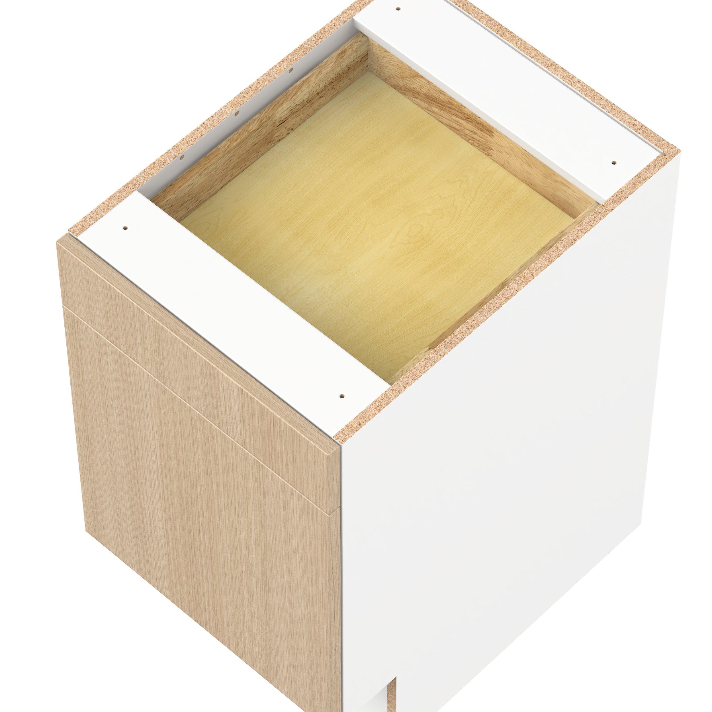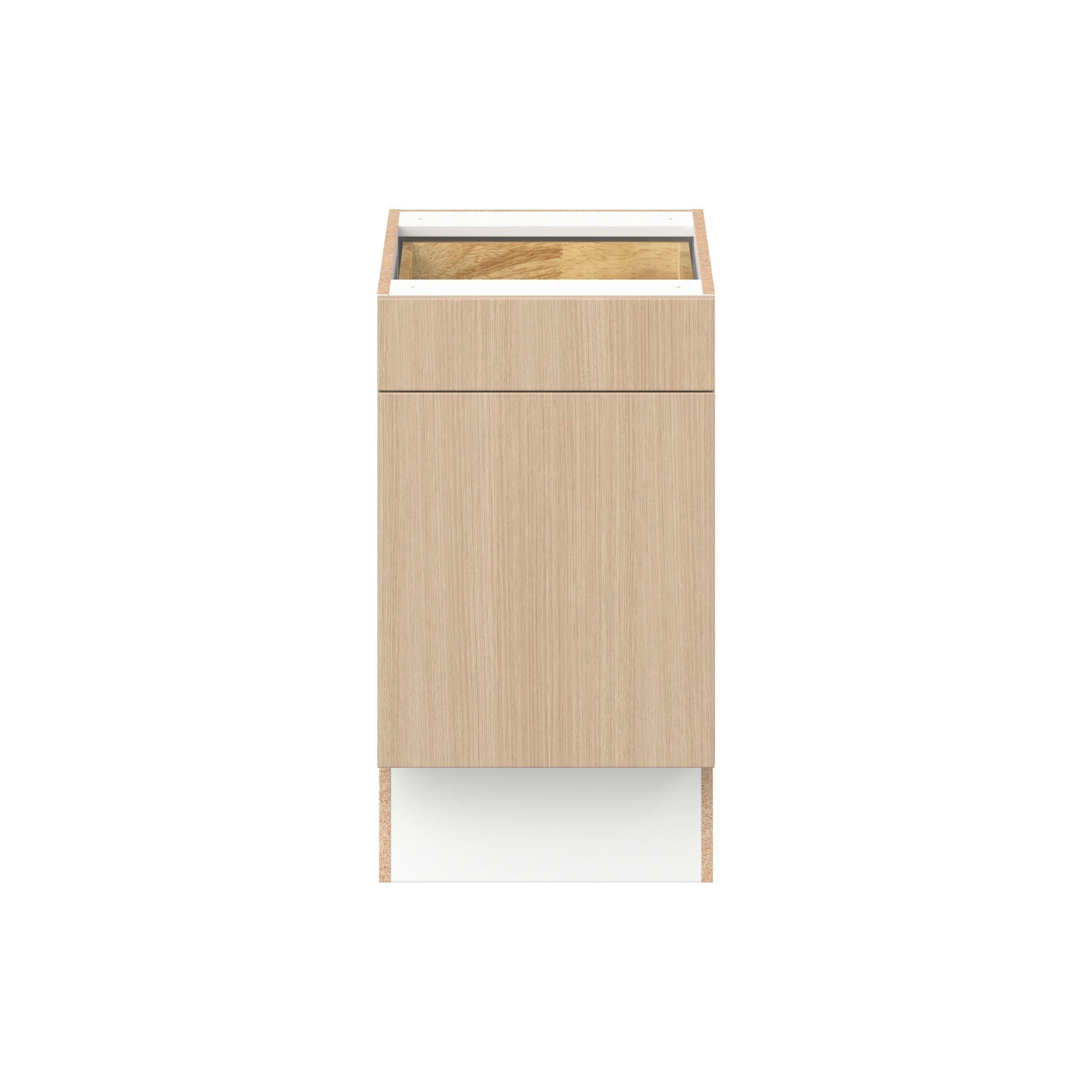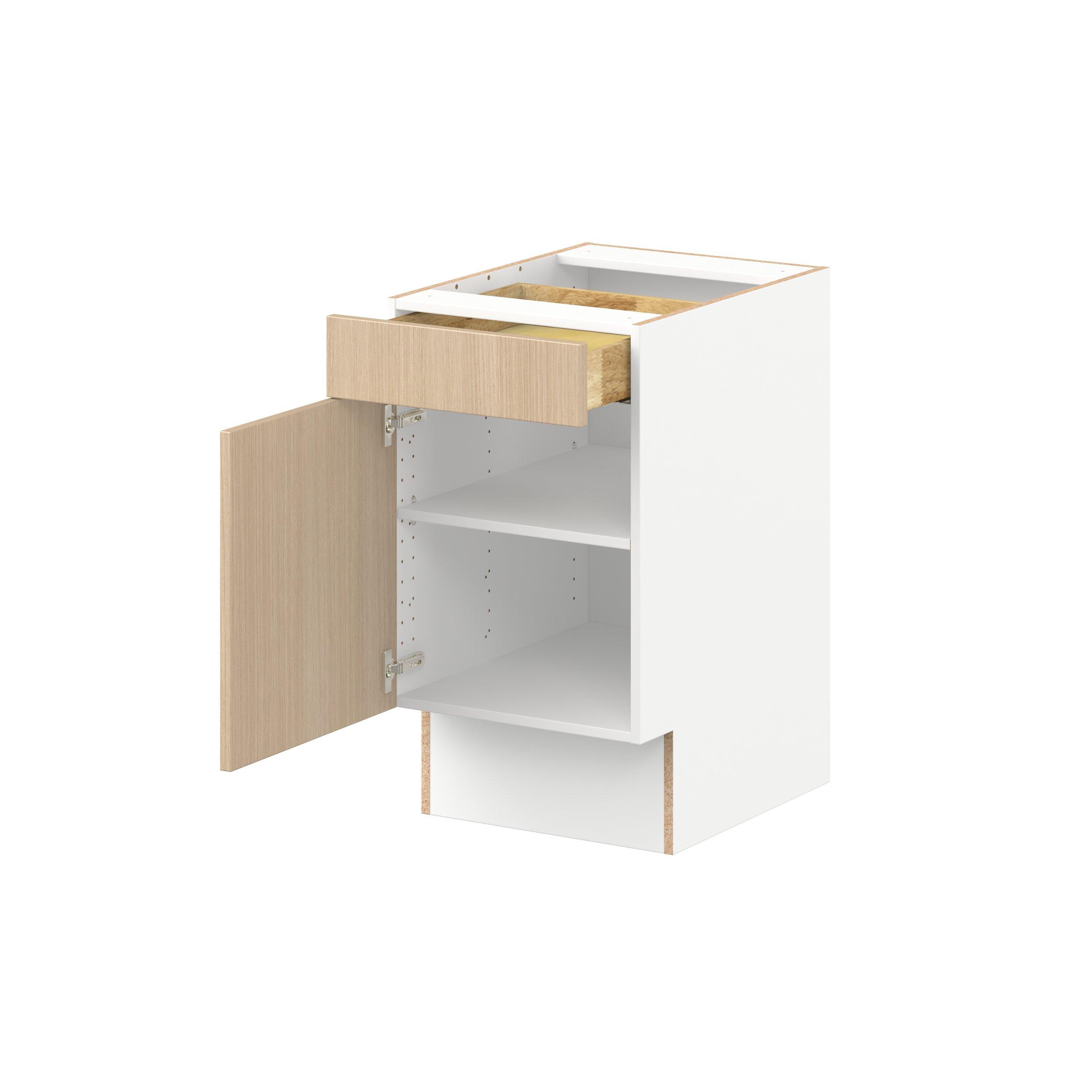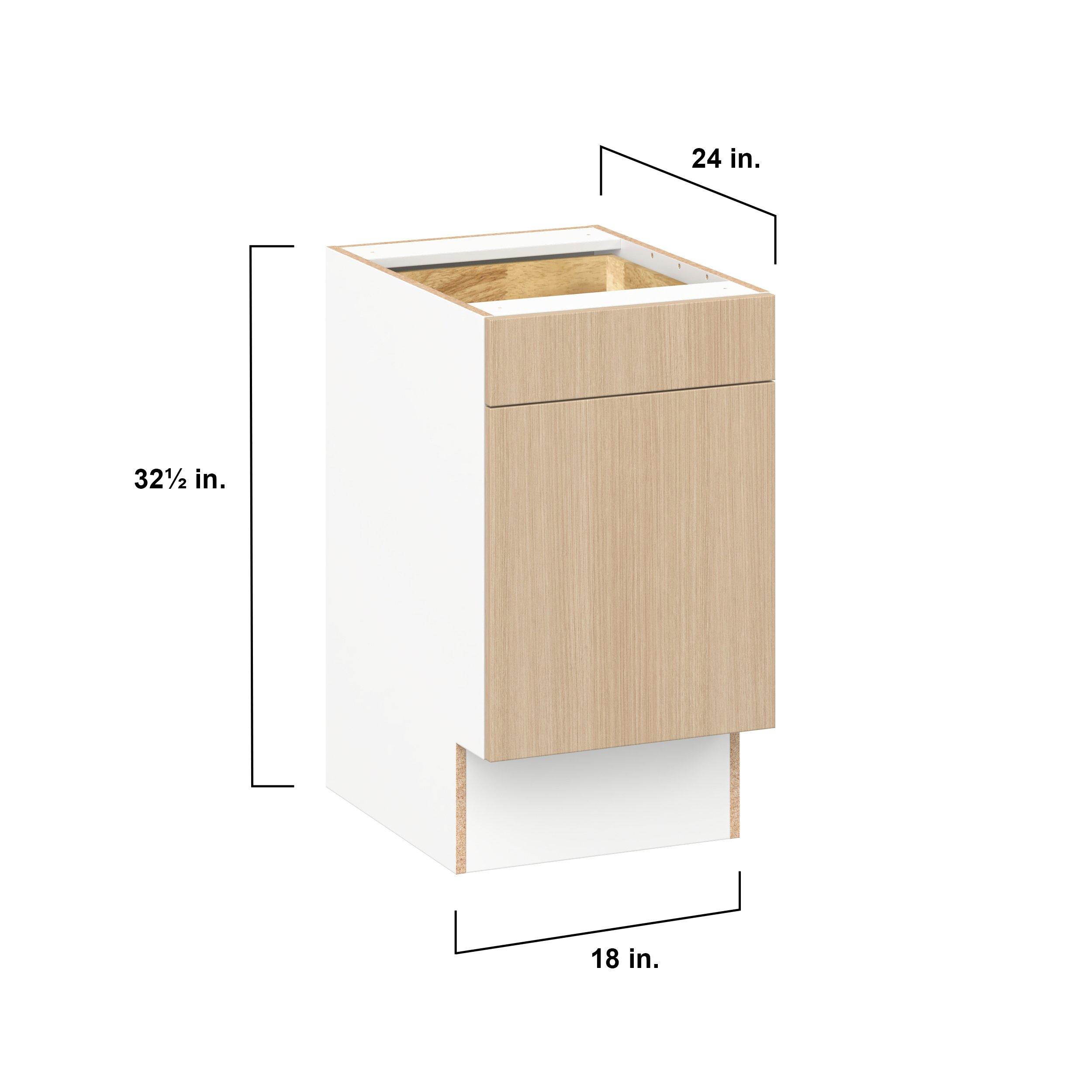 Elevate your project with the contemporary charm of Glenwood slab-style cabinets. Available in desert Mojavi oak and rich burnt walnut finishes, this collection captures the warmth and beauty of natural wood with the practicality of textured melamine. Crafted from one-piece MDF Studio Design Collection Glenwood 18 in. Mojavi Oak Door and Drawer Base Cabinet - ADA is designed to resist hairline cracks while the easy-to-clean finish stands up to stains and moisture. Featuring 5-piece doors and dovetail drawer joints, these cabinets offer durability and elegance. This collection combines style with everyday storage solutions.