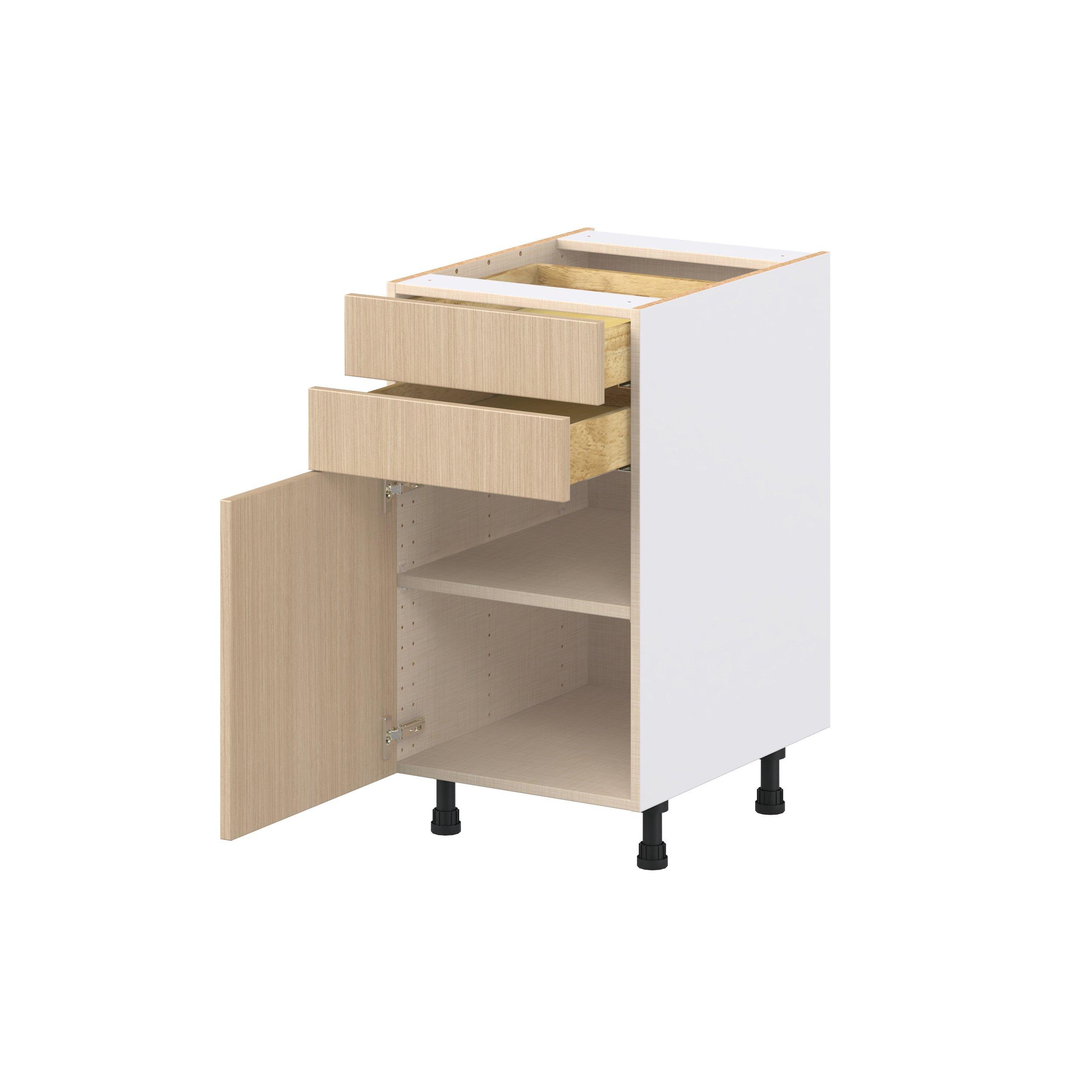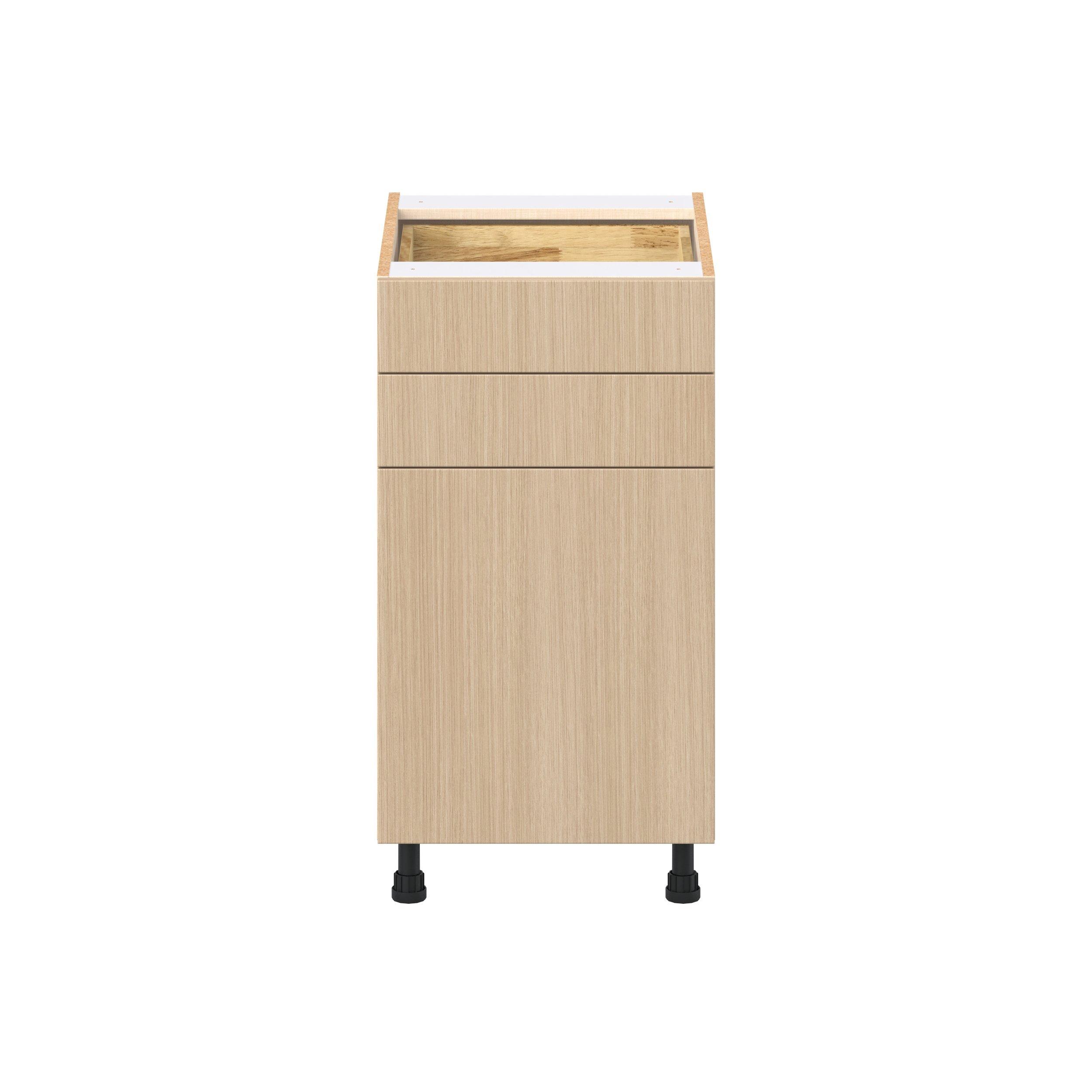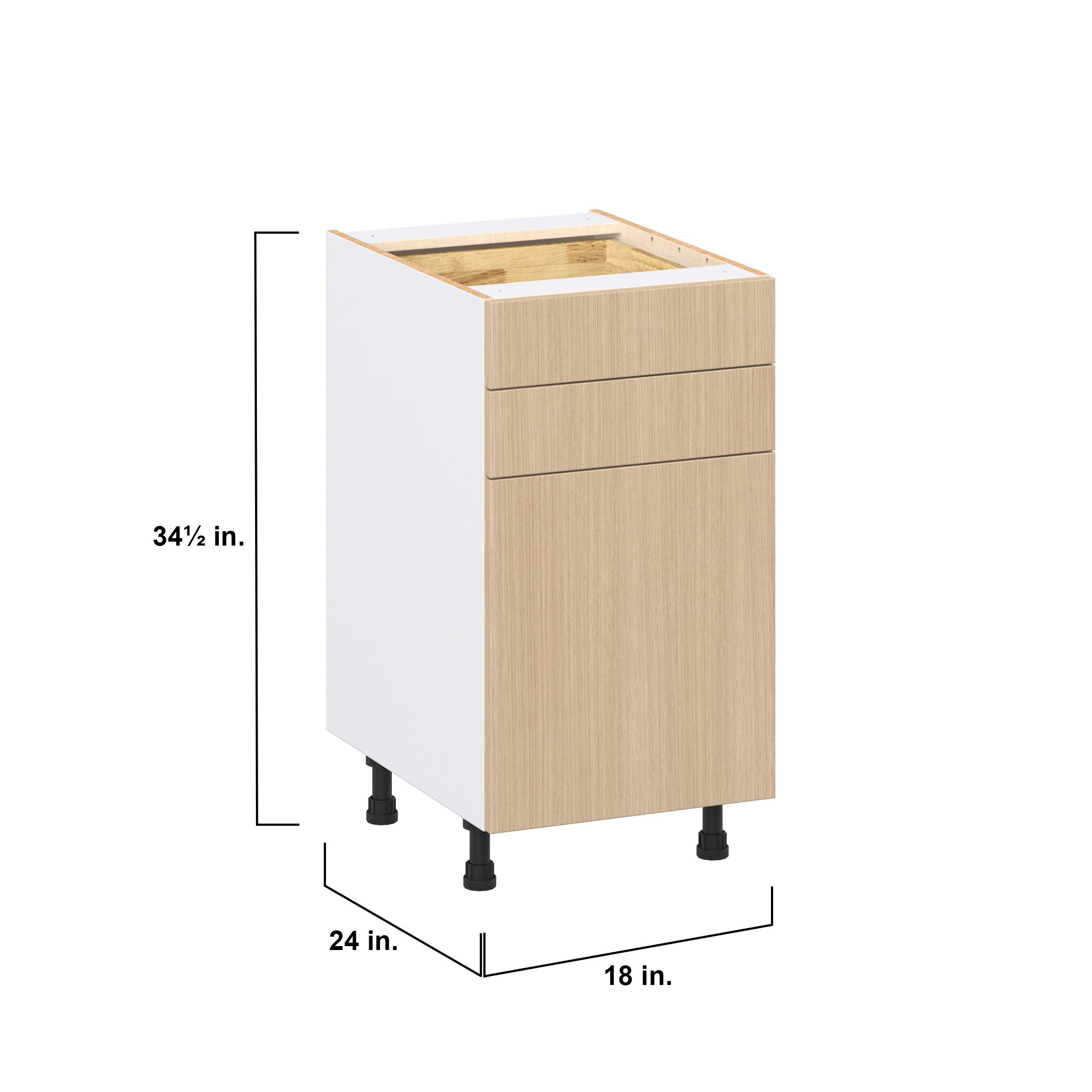 Elevate your project with the contemporary charm of Glenwood slab-style cabinets. Available in desert Mojavi oak and rich burnt walnut finishes, this collection captures the warmth and beauty of natural wood with the practicality of textured melamine. Crafted from one-piece MDF Studio Design Collection Glenwood 18 in. Mojavi Oak Door and Drawer Base Cabinet is designed to resist hairline cracks while the easy-to-clean finish stands up to stains and moisture. Featuring 5-piece doors and dovetail drawer joints, these cabinets offer durability and elegance. This collection combines style with everyday storage solutions.