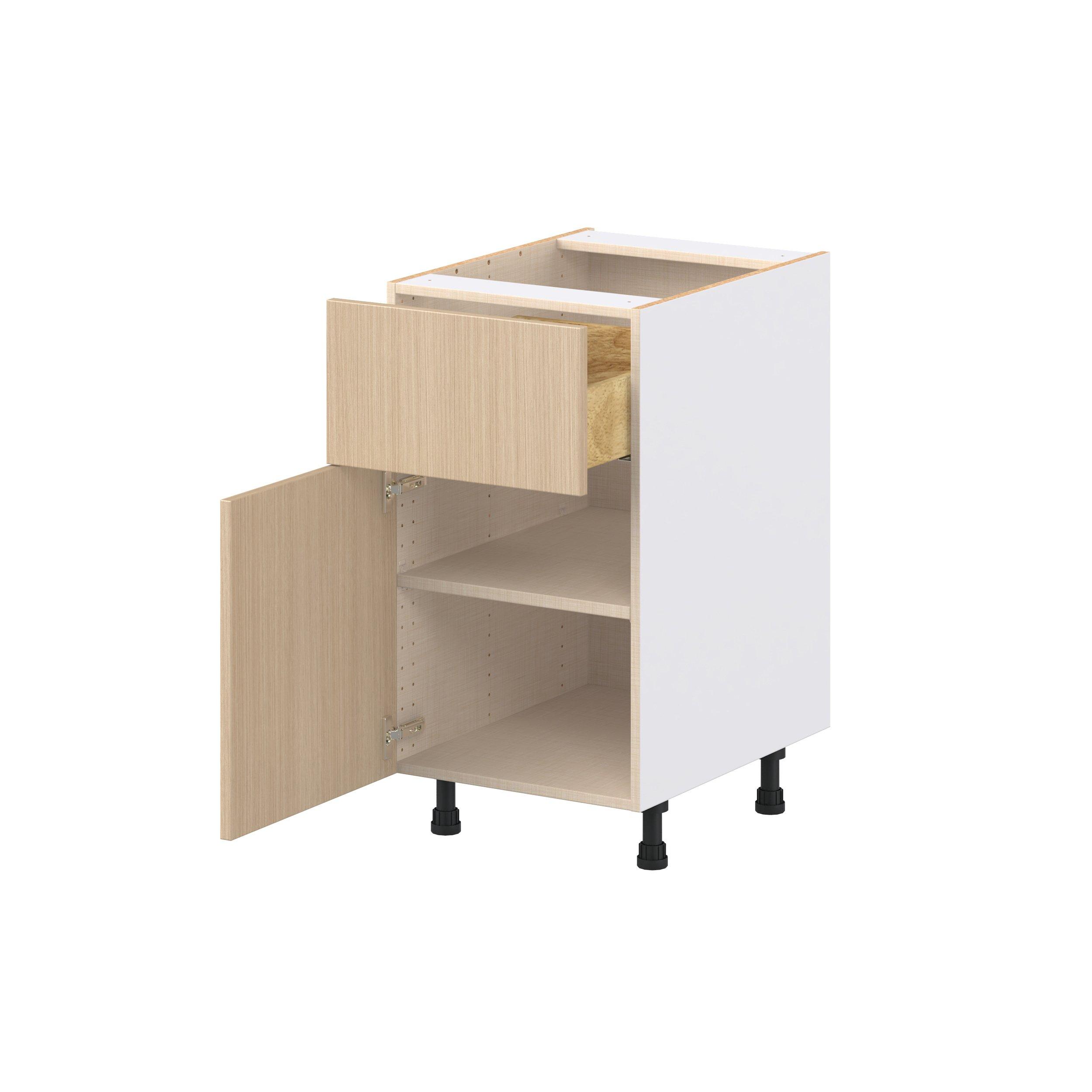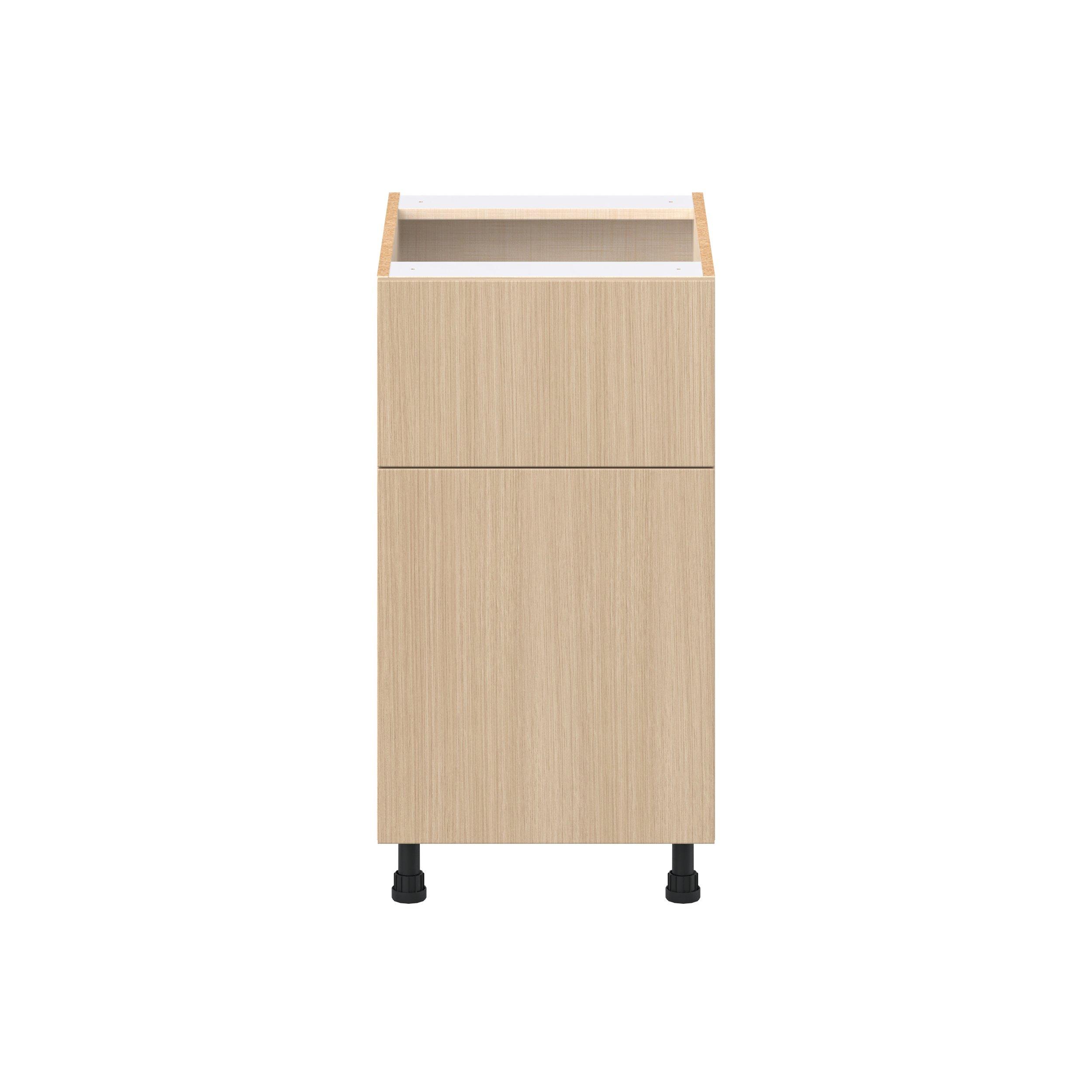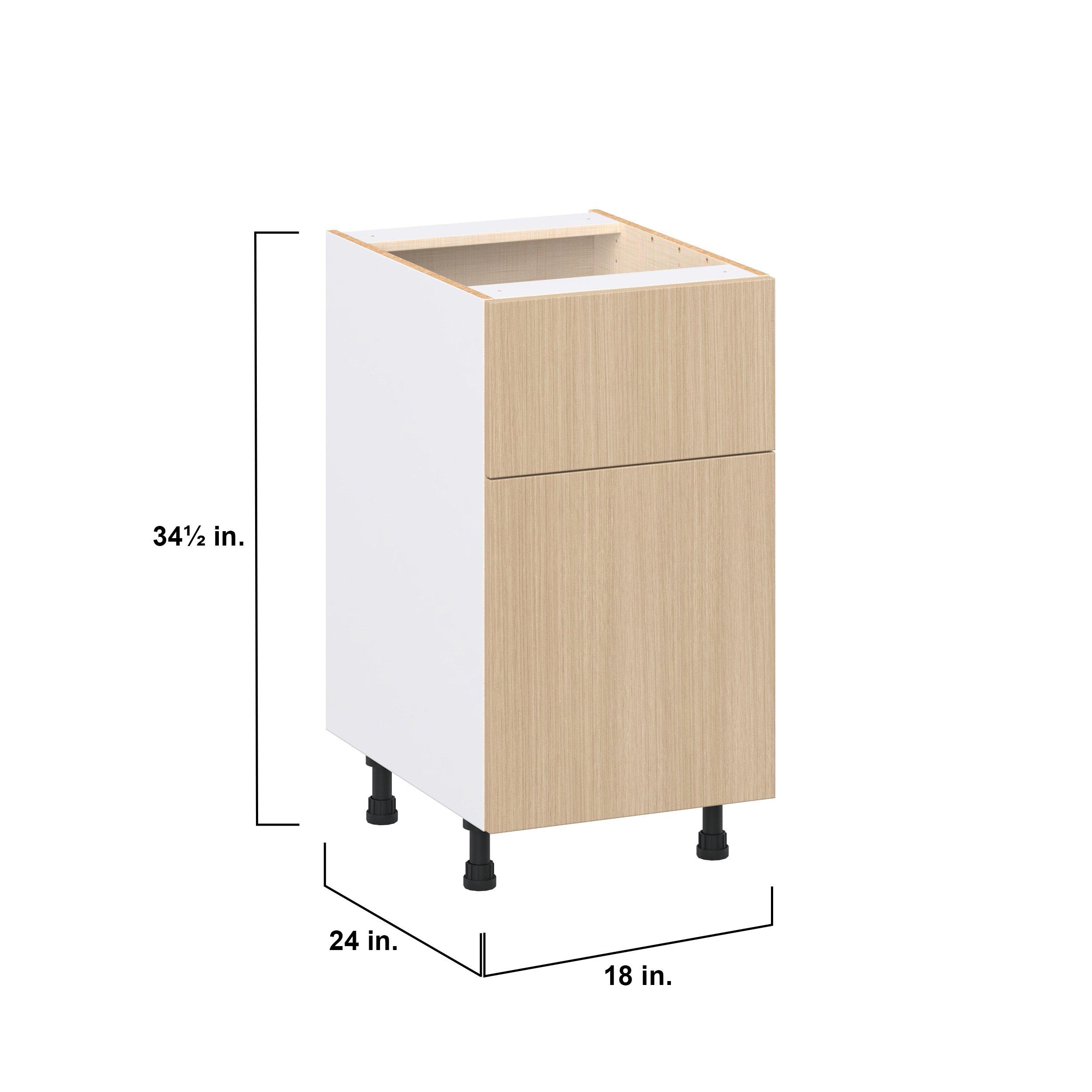 Elevate your project with the contemporary charm of Glenwood slab-style cabinets. Available in desert Mojavi oak and rich burnt walnut finishes, this collection captures the warmth and beauty of natural wood with the practicality of textured melamine. Crafted from one-piece MDF Studio Design Collection Glenwood 18 in. Mojavi Oak Door and Drawer Base Cabinet is designed to resist hairline cracks while the easy-to-clean finish stands up to stains and moisture. Featuring 5-piece doors and dovetail drawer joints, these cabinets offer durability and elegance. This collection combines style with everyday storage solutions.