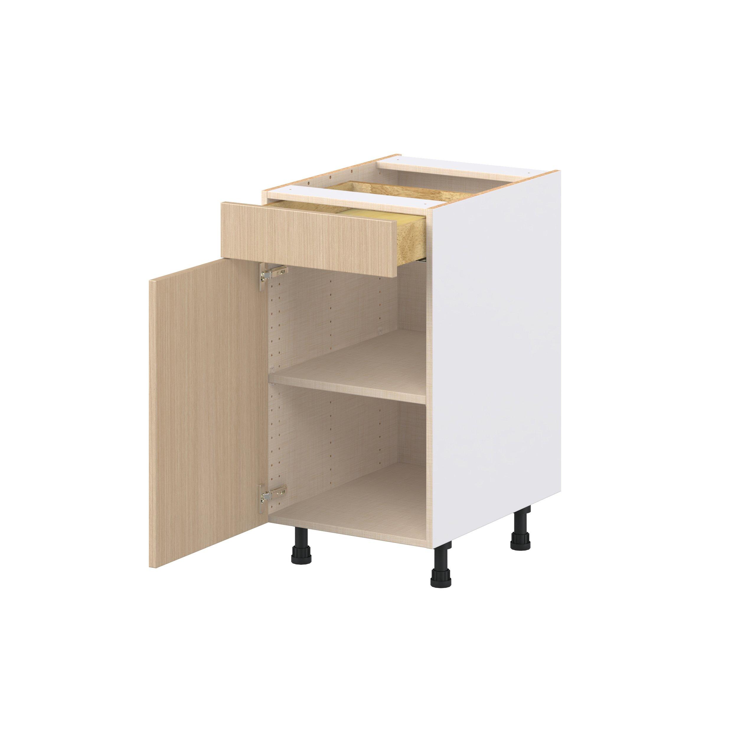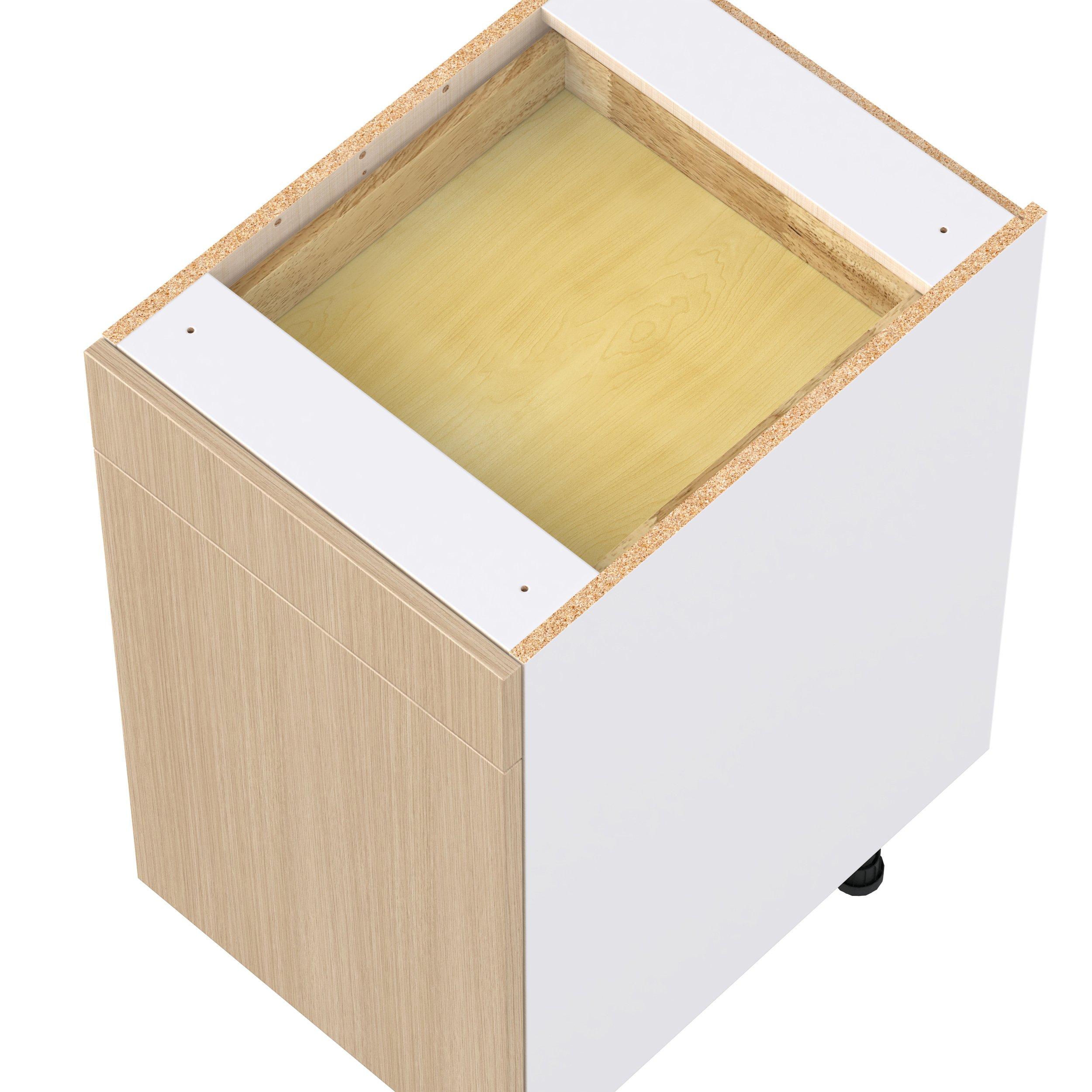 Elevate your project with the contemporary charm of Glenwood slab-style cabinets. Available in desert Mojavi oak and rich burnt walnut finishes, this collection captures the warmth and beauty of natural wood with the practicality of textured melamine. Crafted from one-piece MDF Studio Design Collection Glenwood 18 in. Mojavi Oak Door and Drawer Base Cabinet is designed to resist hairline cracks while the easy-to-clean finish stands up to stains and moisture. Featuring 5-piece doors and dovetail drawer joints, these cabinets offer durability and elegance. This collection combines style with everyday storage solutions.
