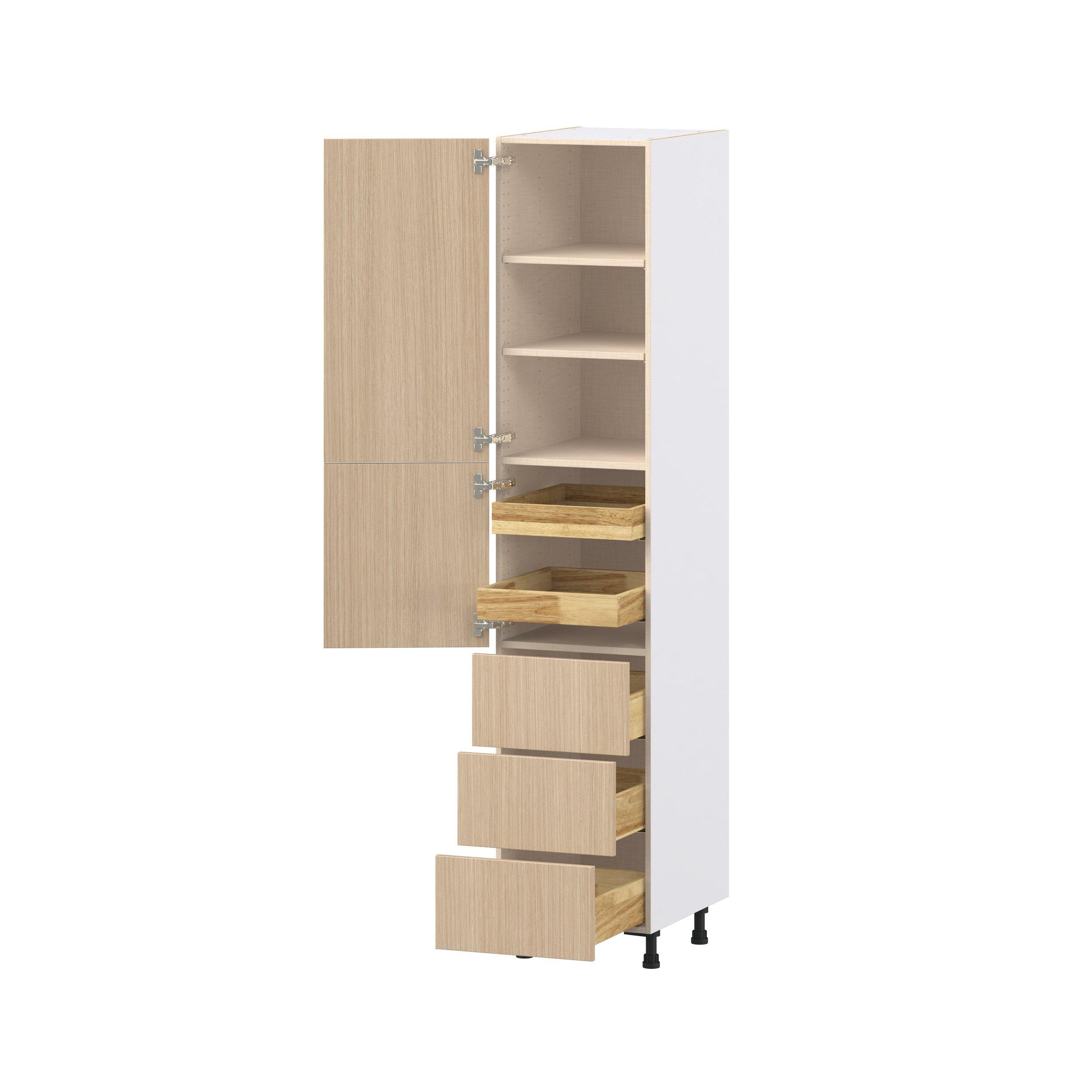 Elevate your project with the contemporary charm of Glenwood slab-style cabinets. Available in desert Mojavi oak and rich burnt walnut finishes, this collection captures the warmth and beauty of natural wood with the practicality of textured melamine. Crafted from one-piece MDF Studio Design Collection Glenwood 18 in. Mojavi Oak Door and Drawer Pantry Cabinet with Inner Pull-Out is designed to resist hairline cracks while the easy-to-clean finish stands up to stains and moisture. Featuring 5-piece doors and dovetail drawer joints, these cabinets offer durability and elegance. This collection combines style with everyday storage solutions.