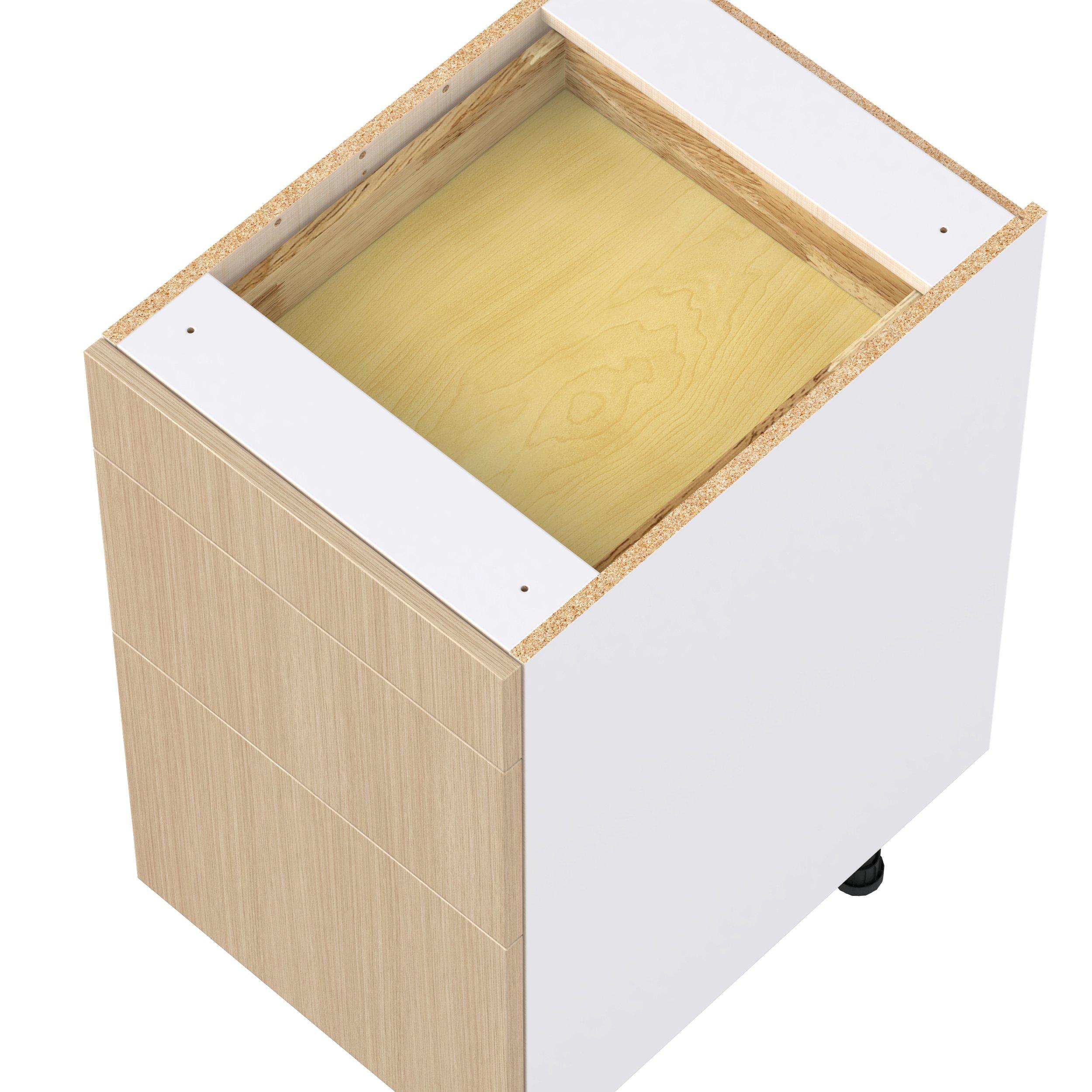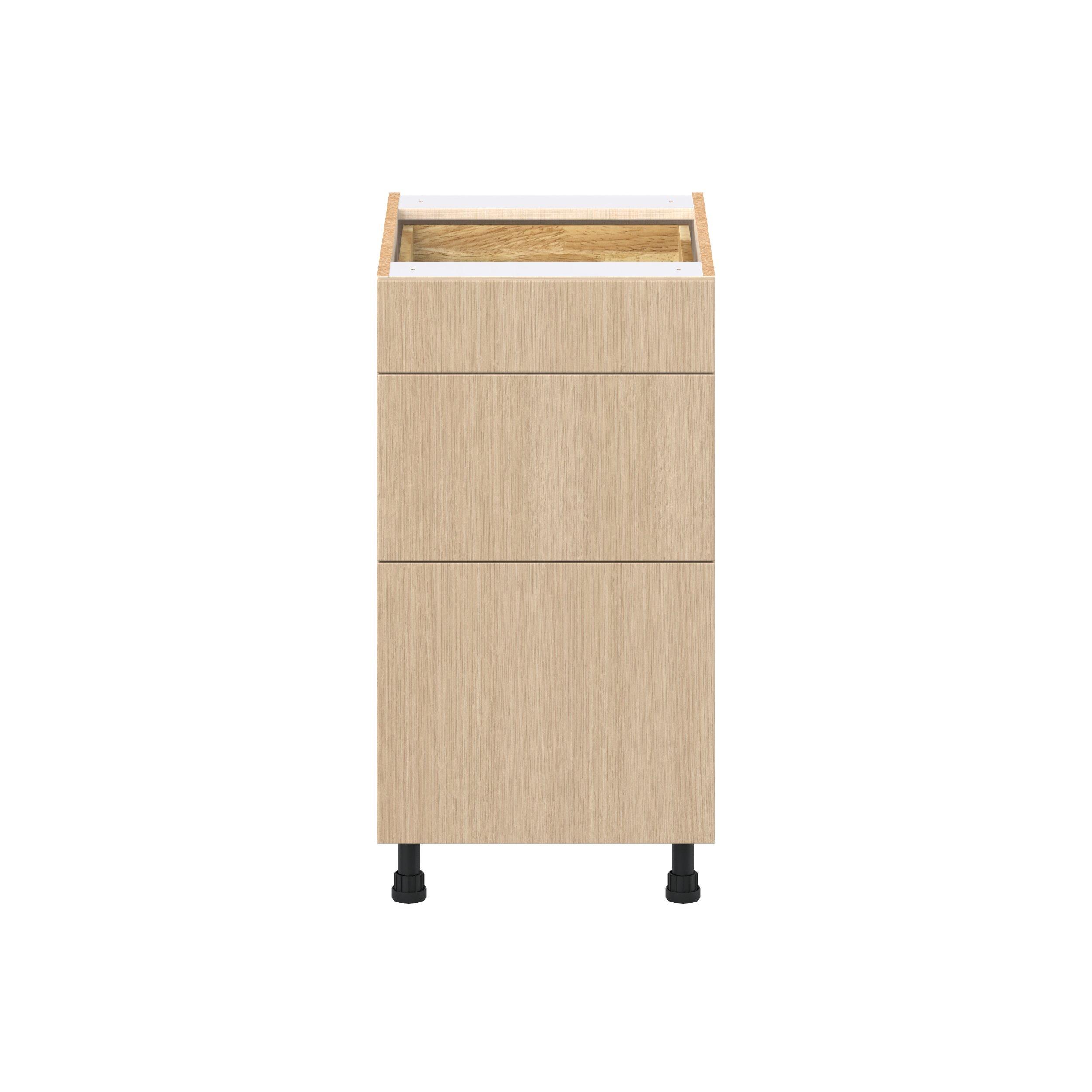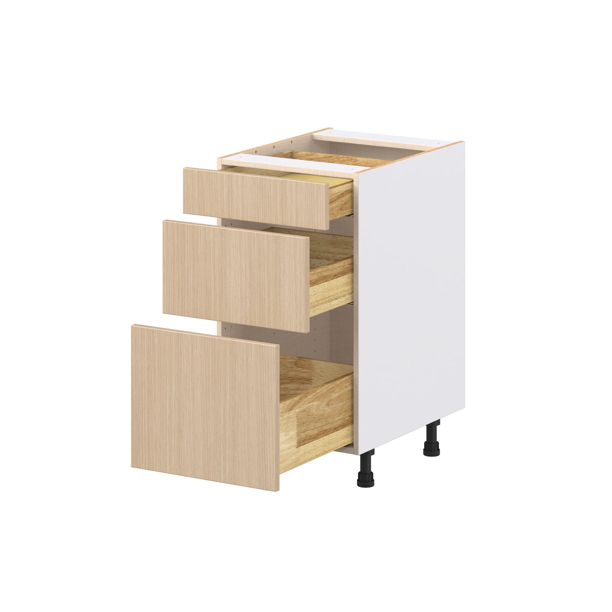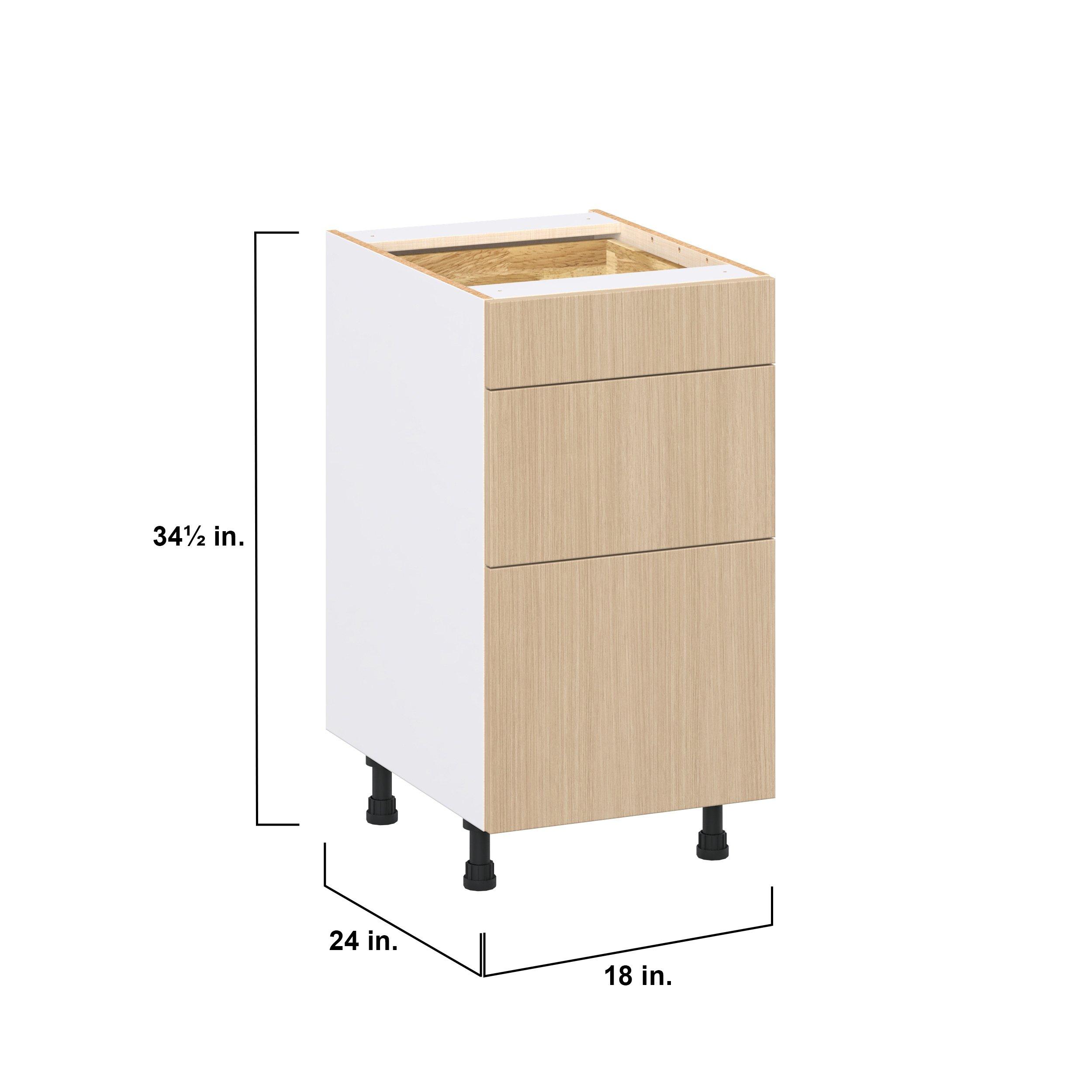 Elevate your project with the contemporary charm of Glenwood slab-style cabinets. Available in desert Mojavi oak and rich burnt walnut finishes, this collection captures the warmth and beauty of natural wood with the practicality of textured melamine. Crafted from one-piece MDF Studio Design Collection Glenwood 18 in. Mojavi Oak Drawer Base Cabinet is designed to resist hairline cracks while the easy-to-clean finish stands up to stains and moisture. Featuring 5-piece doors and dovetail drawer joints, these cabinets offer durability and elegance. This collection combines style with everyday storage solutions.