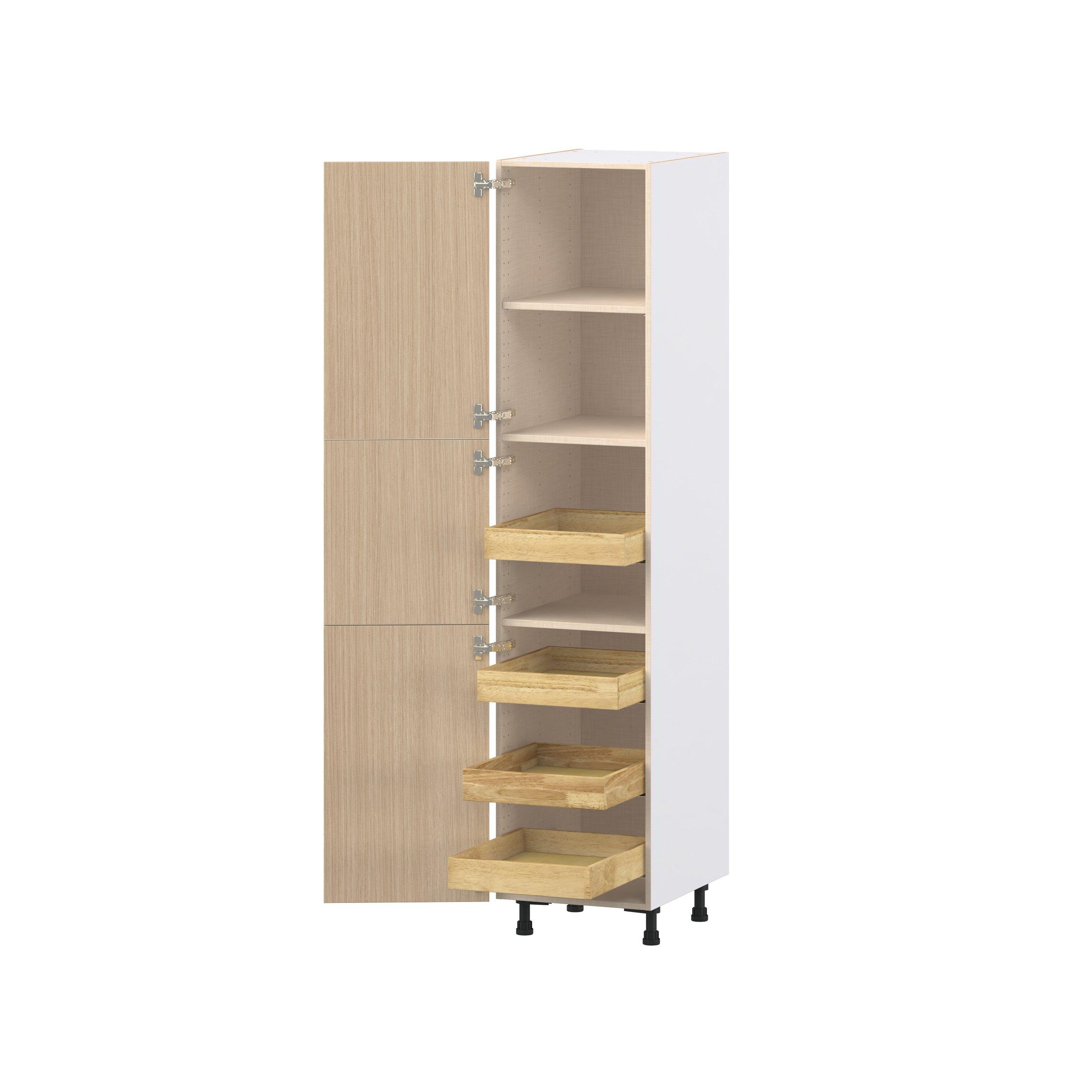 Elevate your project with the contemporary charm of Glenwood slab-style cabinets. Available in desert Mojavi oak and rich burnt walnut finishes, this collection captures the warmth and beauty of natural wood with the practicality of textured melamine. Crafted from one-piece MDF Studio Design Collection Glenwood 18 in. Mojavi Oak Pantry Cabinet with Inner Pull-Out Drawer is designed to resist hairline cracks while the easy-to-clean finish stands up to stains and moisture. Featuring 5-piece doors and dovetail drawer joints, these cabinets offer durability and elegance. This collection combines style with everyday storage solutions.