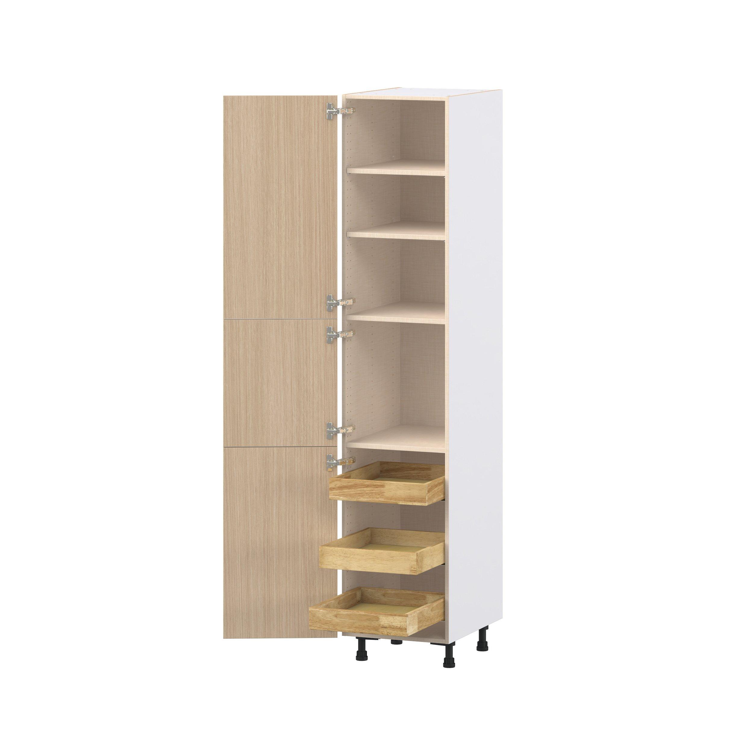Elevate your project with the contemporary charm of Glenwood slab-style cabinets. Available in desert Mojavi oak and rich burnt walnut finishes, this collection captures the warmth and beauty of natural wood with the practicality of textured melamine. Crafted from one-piece MDF Studio Design Collection Glenwood 18 in. Mojavi Oak Pantry Cabinet with Inner Pull-Out Drawer is designed to resist hairline cracks while the easy-to-clean finish stands up to stains and moisture. Featuring 5-piece doors and dovetail drawer joints, these cabinets offer durability and elegance. This collection combines style with everyday storage solutions.