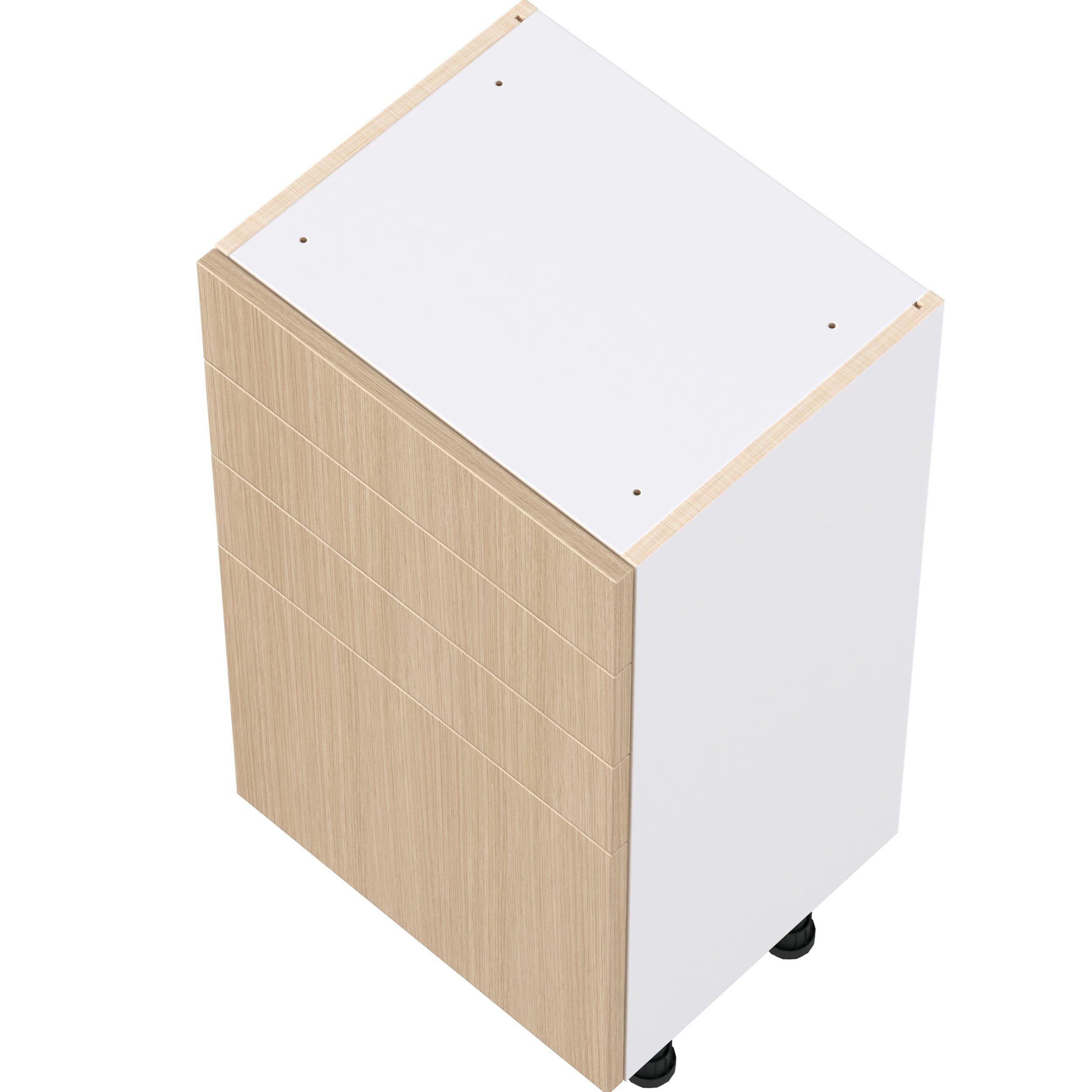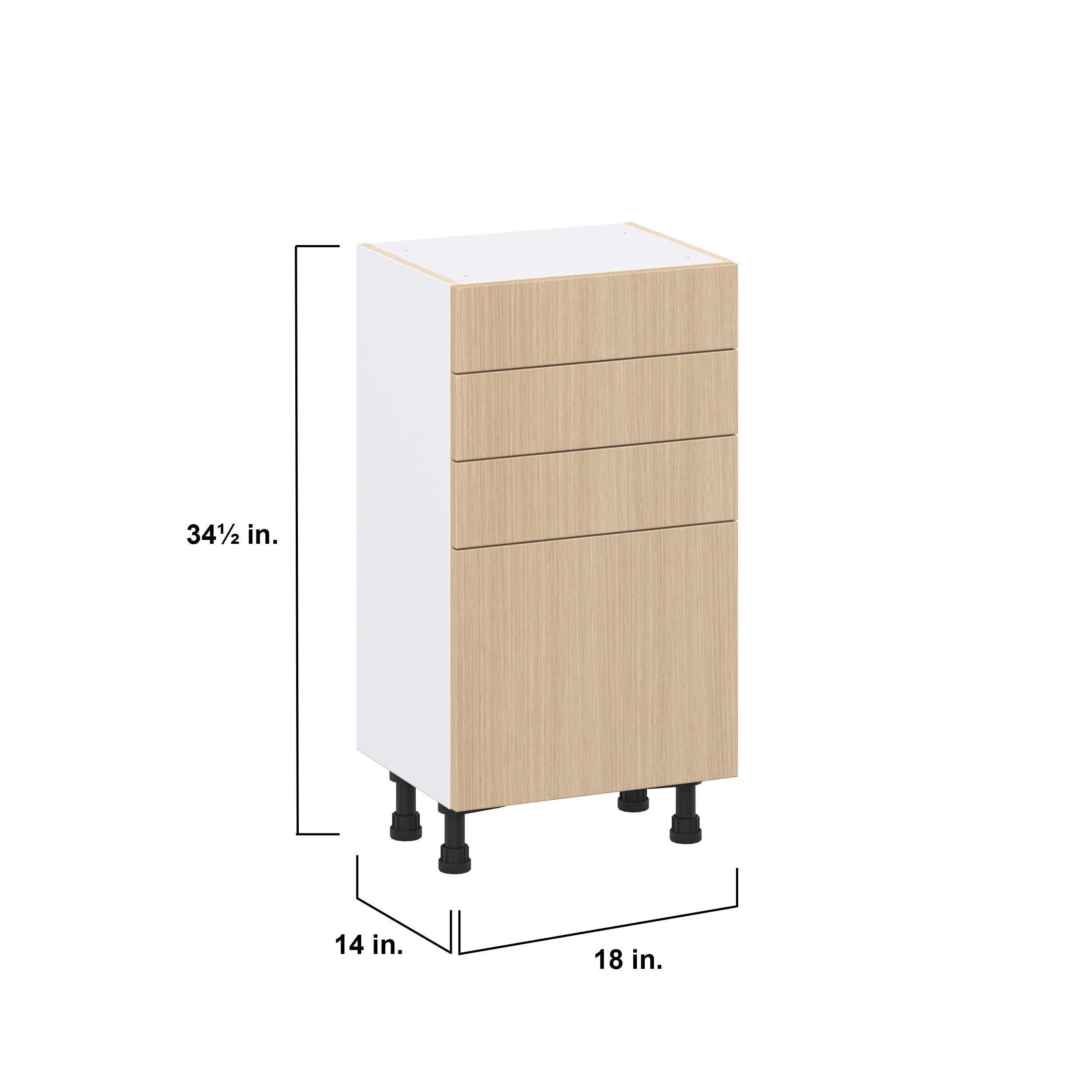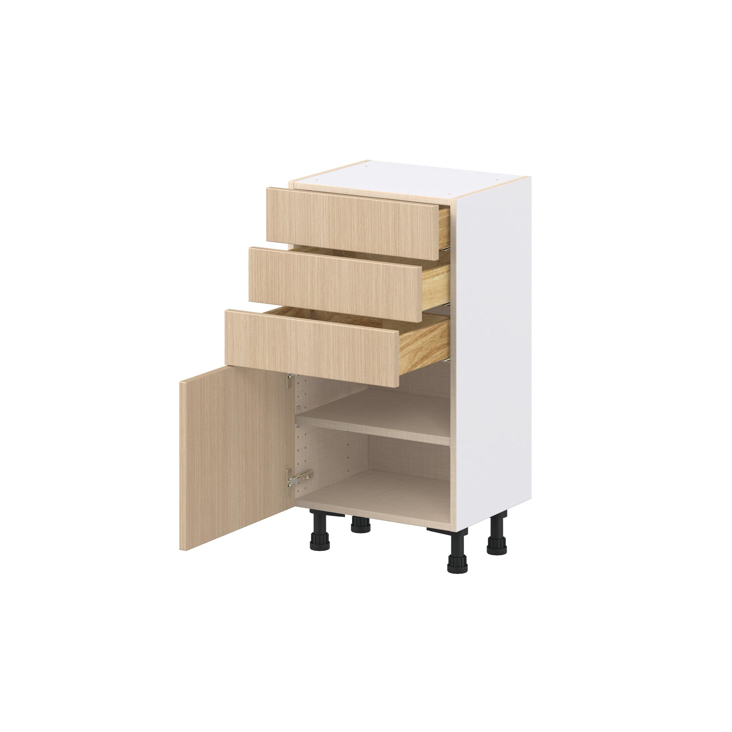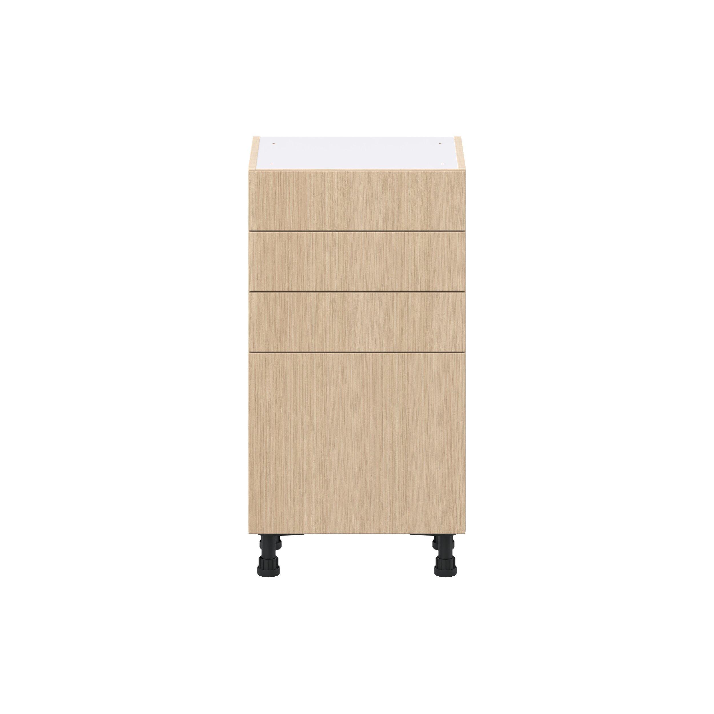 Elevate your project with the contemporary charm of Glenwood slab-style cabinets. Available in desert Mojavi oak and rich burnt walnut finishes, this collection captures the warmth and beauty of natural wood with the practicality of textured melamine. Crafted from one-piece MDF Studio Design Collection Glenwood 18 in. Mojavi Oak Shallow Base Cabinet is designed to resist hairline cracks while the easy-to-clean finish stands up to stains and moisture. Featuring 5-piece doors and dovetail drawer joints, these cabinets offer durability and elegance. This collection combines style with everyday storage solutions.