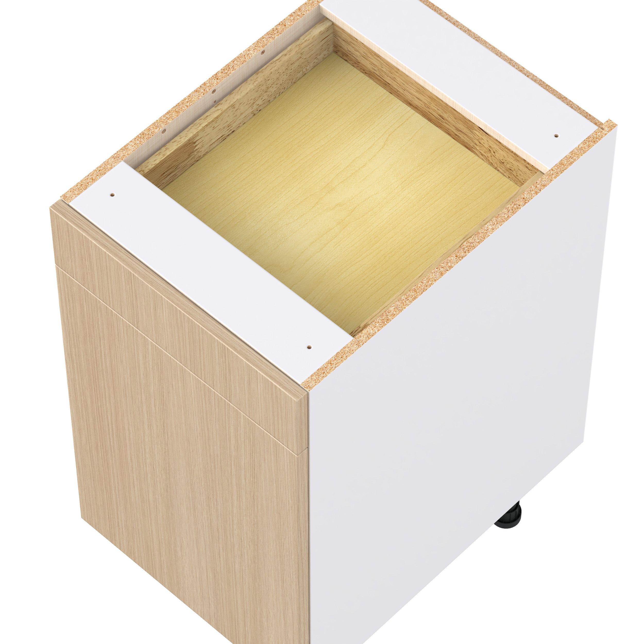 Elevate your project with the contemporary charm of Glenwood slab-style cabinets. Available in desert Mojavi oak and rich burnt walnut finishes, this collection captures the warmth and beauty of natural wood with the practicality of textured melamine. Crafted from one-piece MDF Studio Design Collection Glenwood 18 in. Mojavi Oak Trash Can Pull-Out Base Cabinet is designed to resist hairline cracks while the easy-to-clean finish stands up to stains and moisture. Featuring 5-piece doors and dovetail drawer joints, these cabinets offer durability and elegance. This collection combines style with everyday storage solutions.