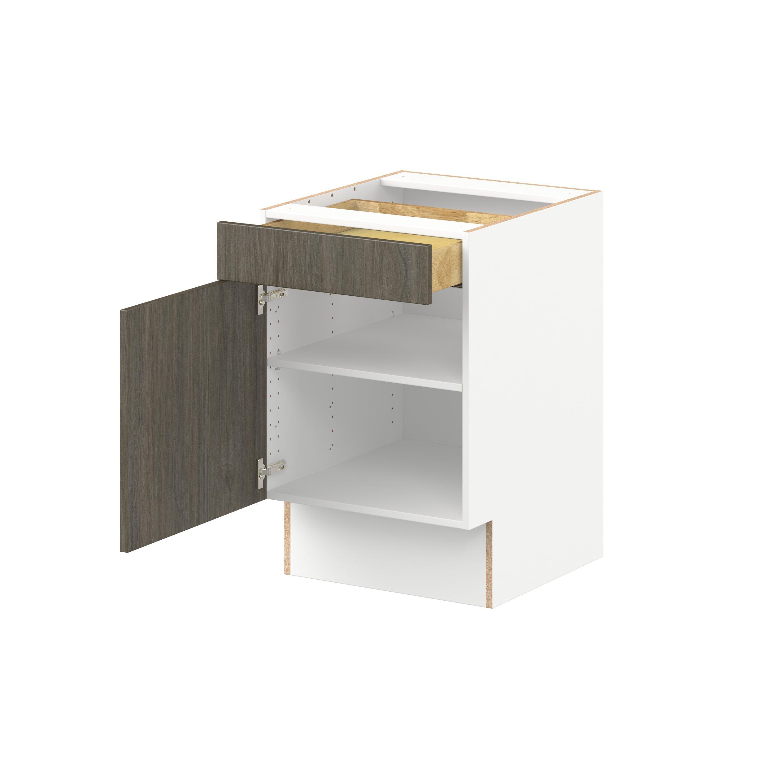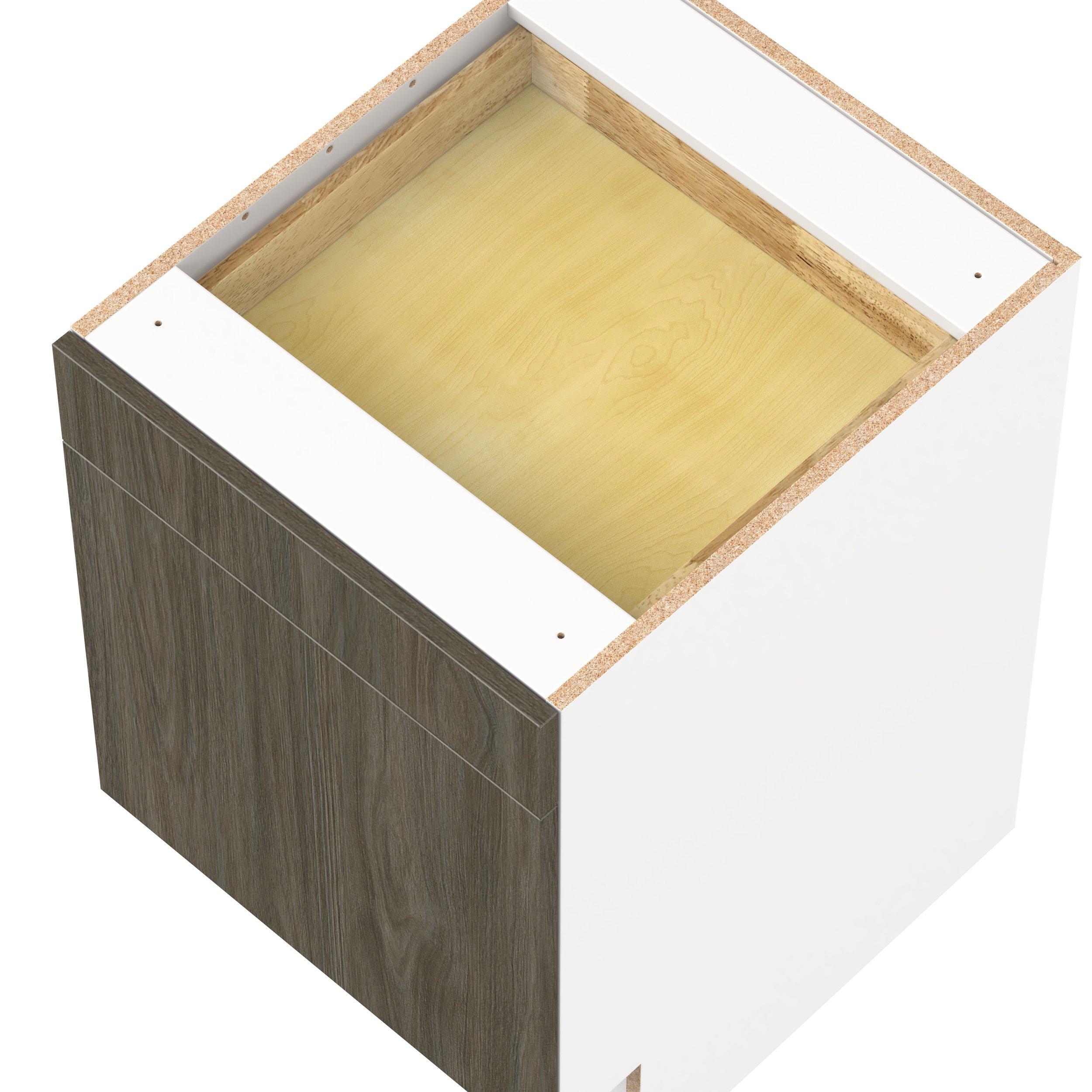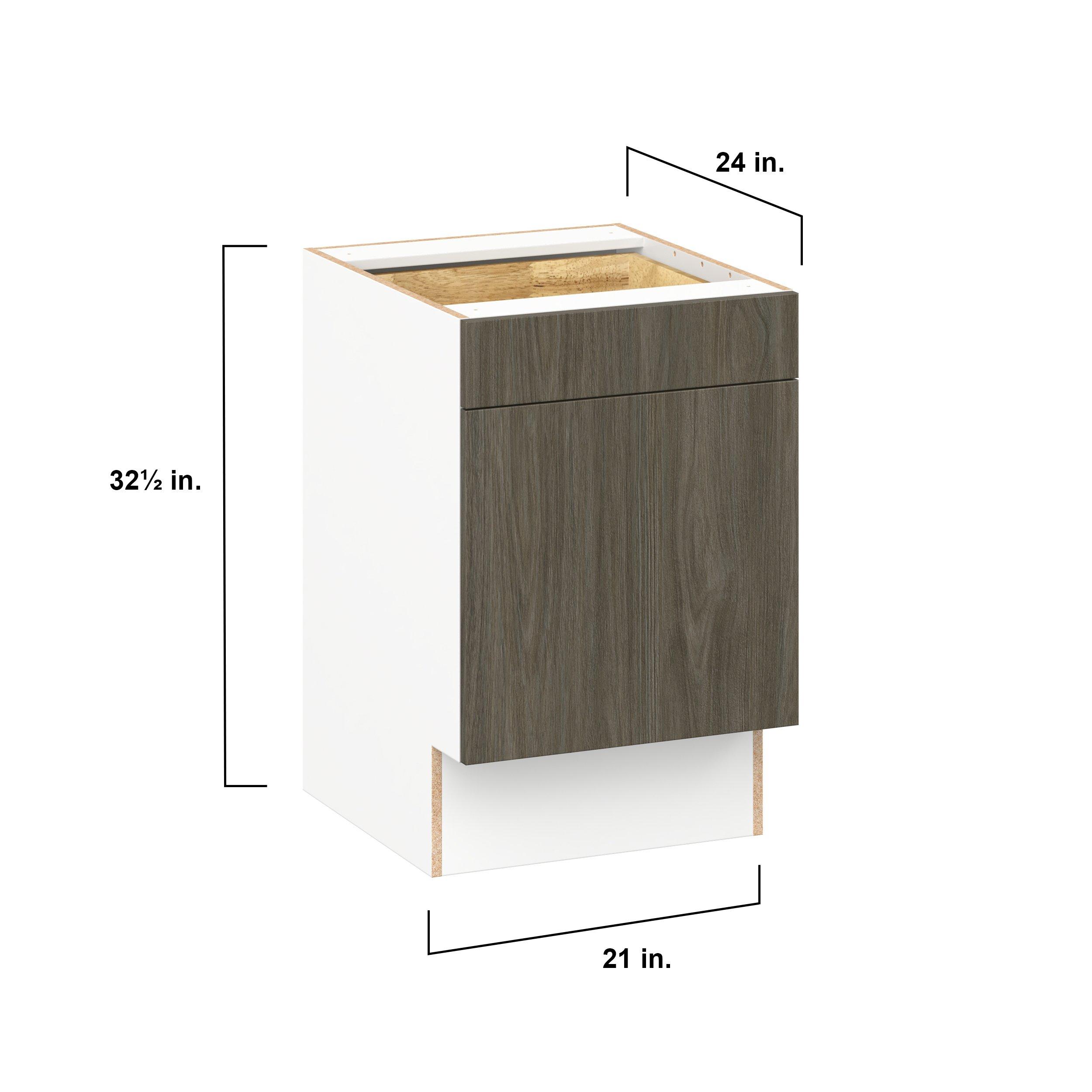 Elevate your project with the contemporary charm of Glenwood slab-style cabinets. Available in desert Mojavi oak and rich burnt walnut finishes, this collection captures the warmth and beauty of natural wood with the practicality of textured melamine. Crafted from one-piece MDF Studio Design Collection Glenwood 21 in. Burnt Walnut Door and Drawer Base Cabinet - ADA is designed to resist hairline cracks while the easy-to-clean finish stands up to stains and moisture. Featuring 5-piece doors and dovetail drawer joints, these cabinets offer durability and elegance. This collection combines style with everyday storage solutions.