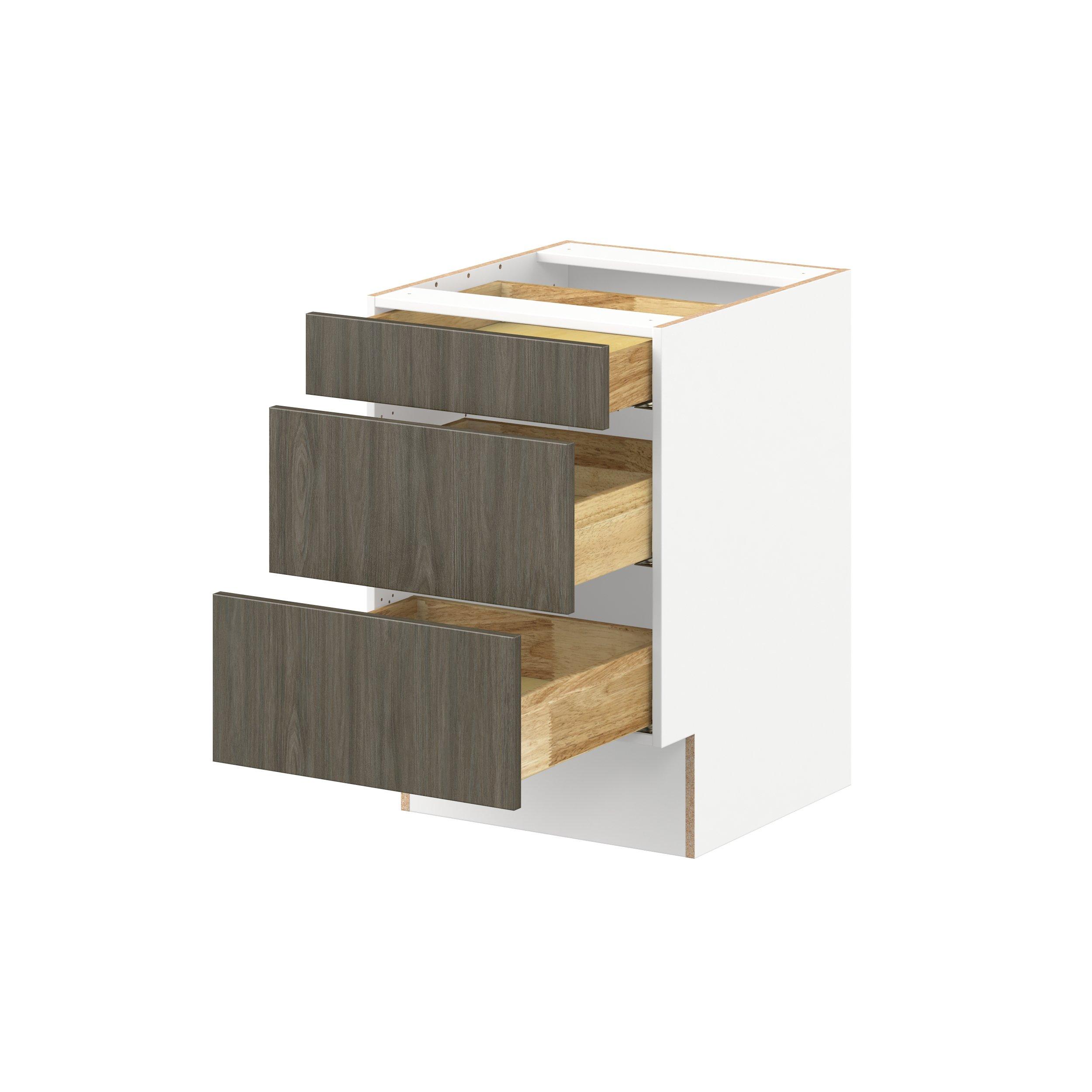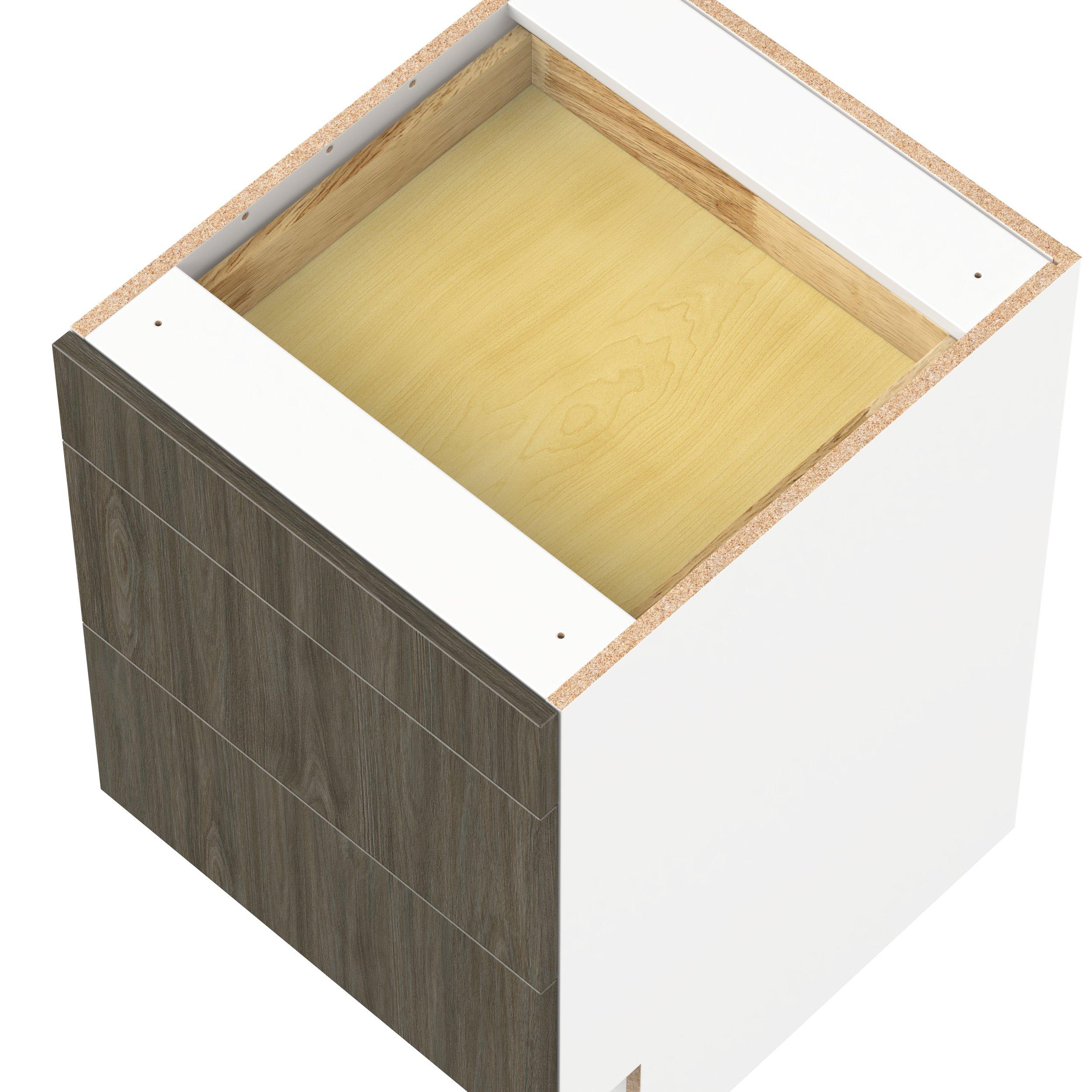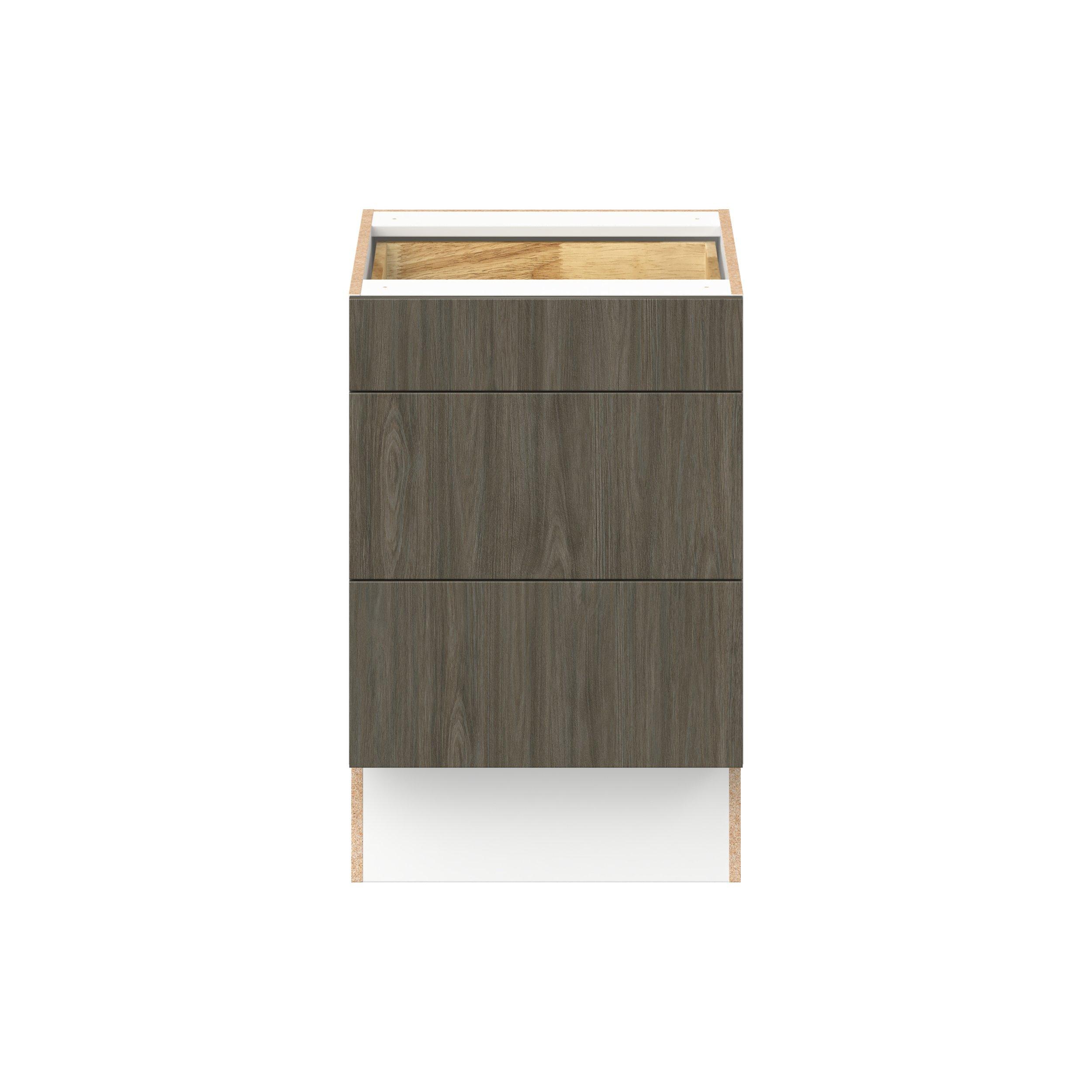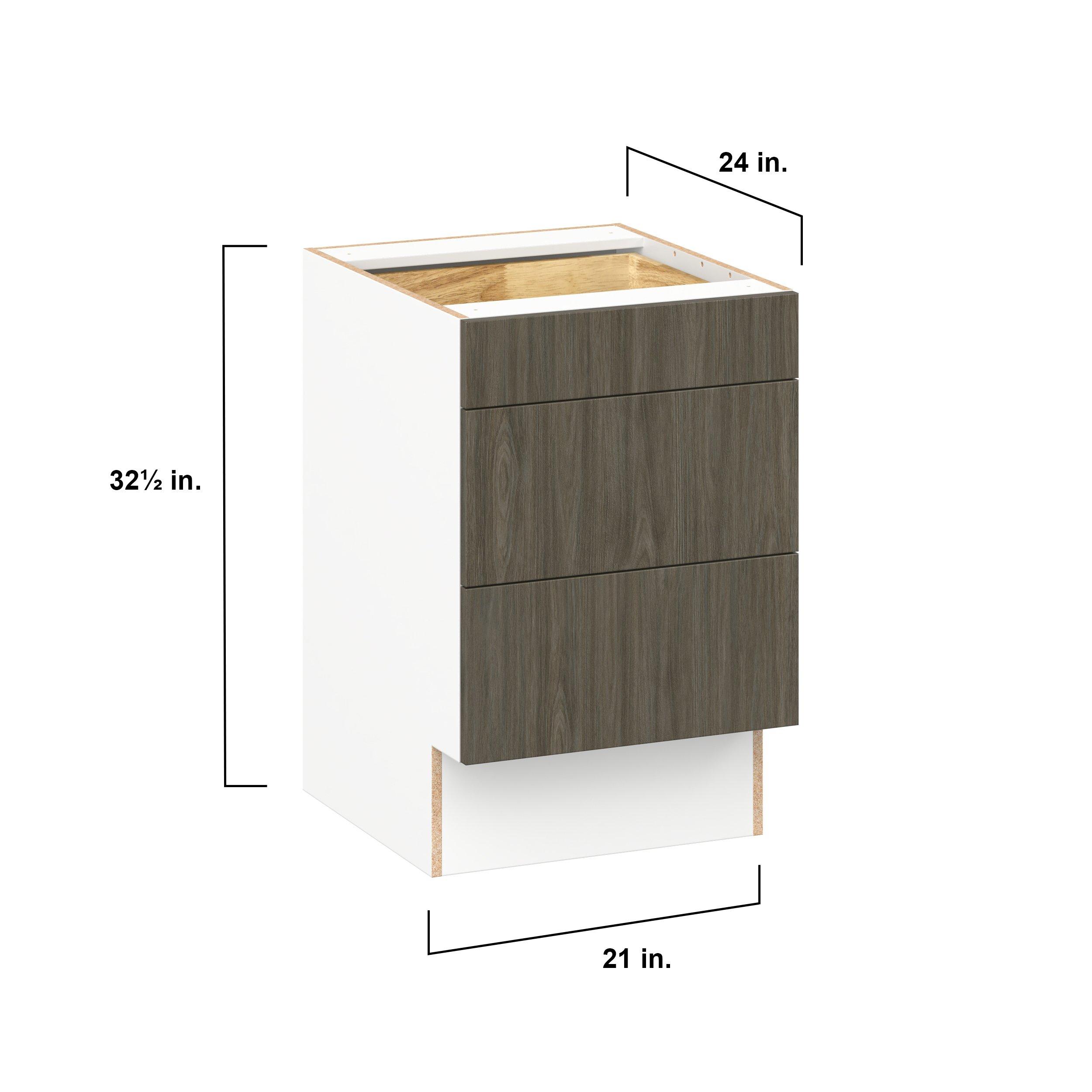 Elevate your project with the contemporary charm of Glenwood slab-style cabinets. Available in desert Mojavi oak and rich burnt walnut finishes, this collection captures the warmth and beauty of natural wood with the practicality of textured melamine. Crafted from one-piece MDF Studio Design Collection Glenwood 21 in. Burnt Walnut Drawer Base Cabinet - ADA is designed to resist hairline cracks while the easy-to-clean finish stands up to stains and moisture. Featuring 5-piece doors and dovetail drawer joints, these cabinets offer durability and elegance. This collection combines style with everyday storage solutions.