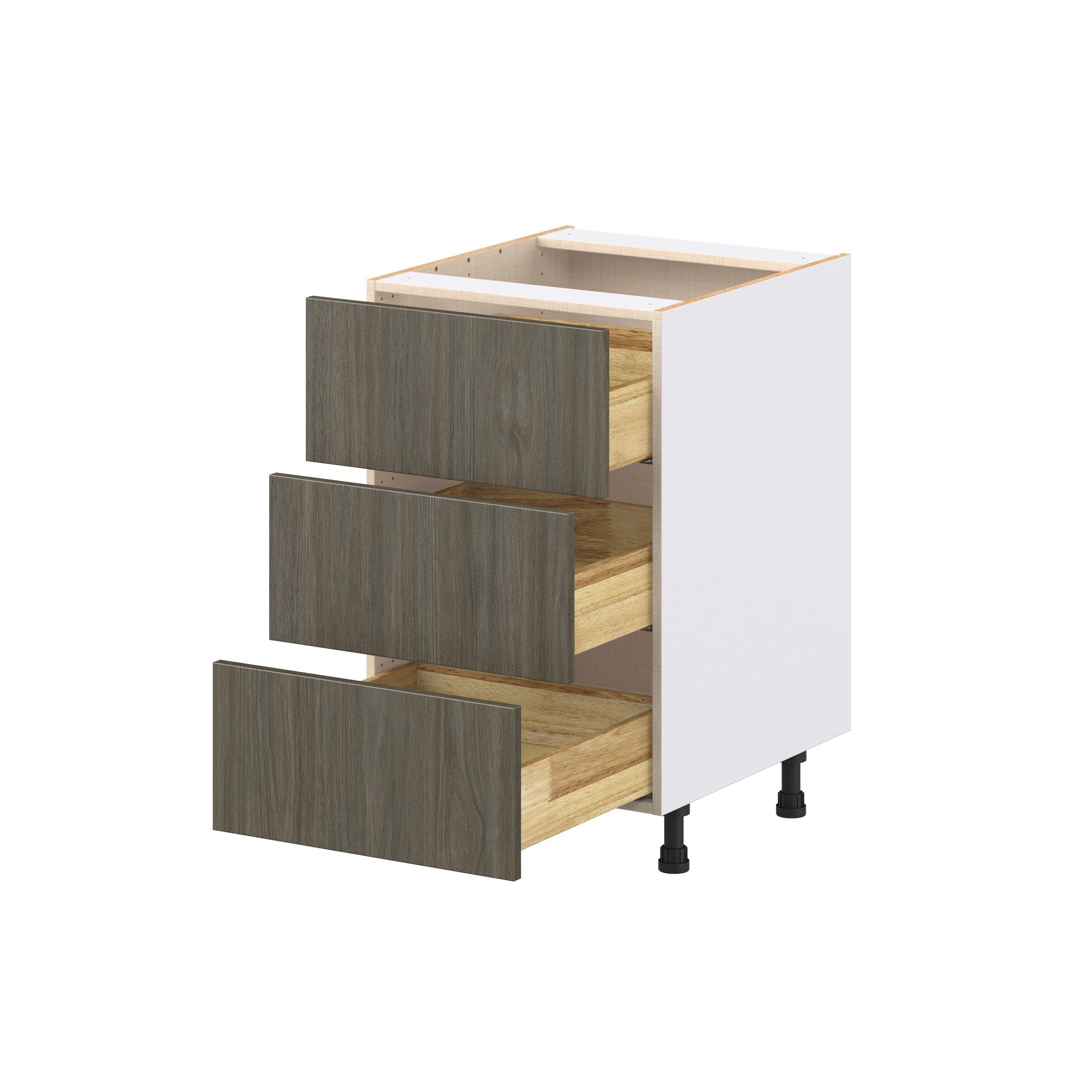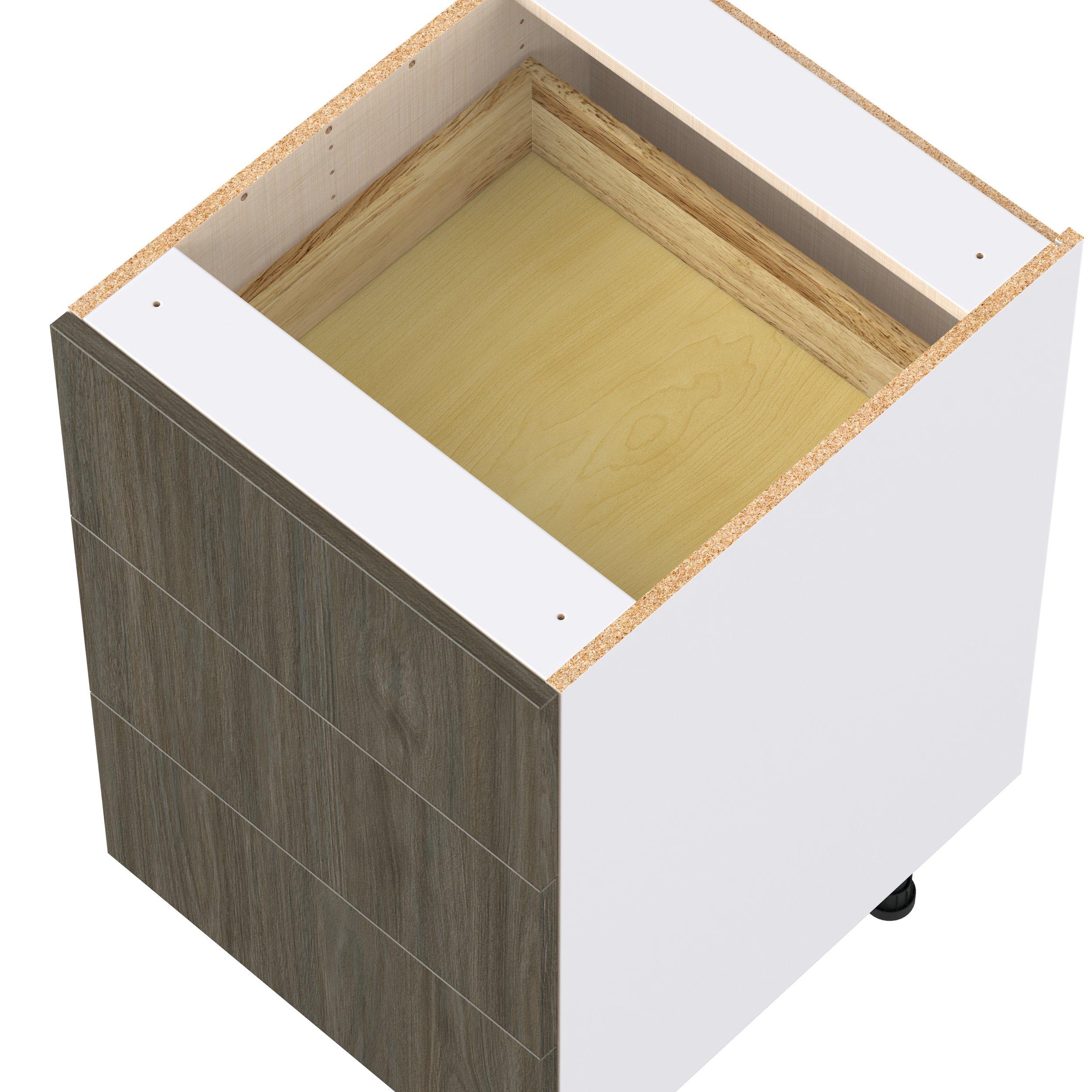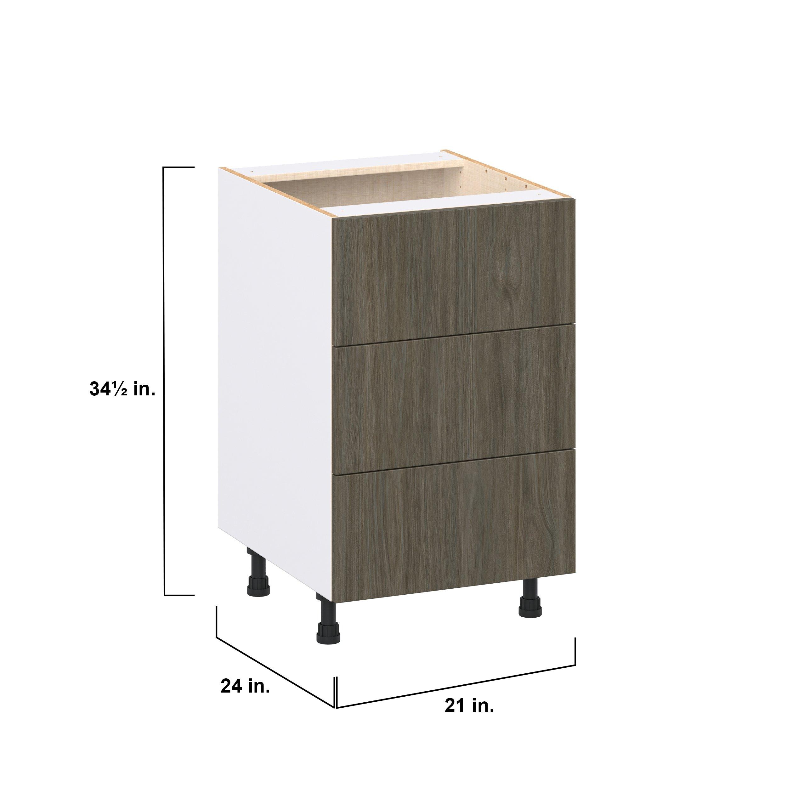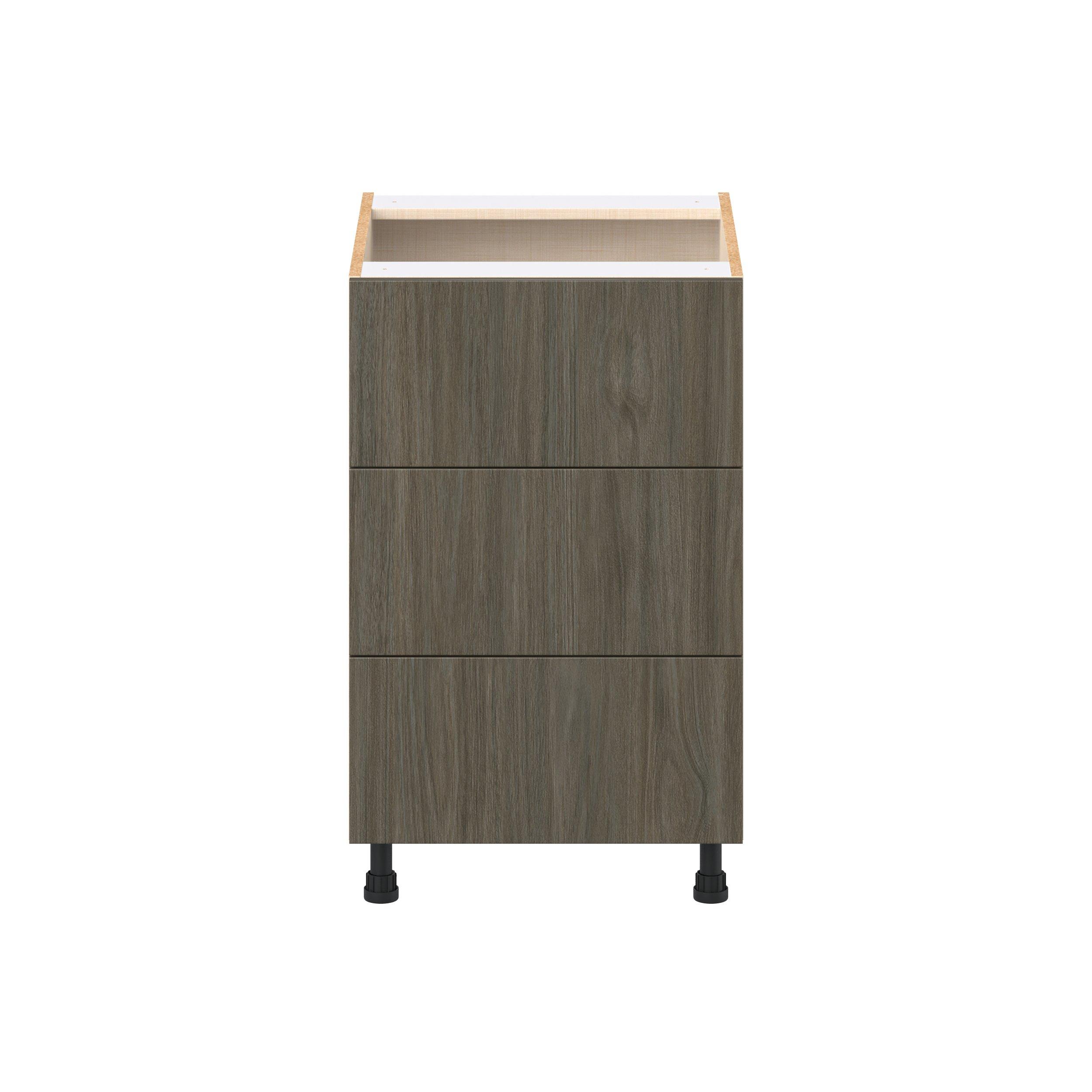 Elevate your project with the contemporary charm of Glenwood slab-style cabinets. Available in desert Mojavi oak and rich burnt walnut finishes, this collection captures the warmth and beauty of natural wood with the practicality of textured melamine. Crafted from one-piece MDF Studio Design Collection Glenwood 21 in. Burnt Walnut Drawer Base Cabinet is designed to resist hairline cracks while the easy-to-clean finish stands up to stains and moisture. Featuring 5-piece doors and dovetail drawer joints, these cabinets offer durability and elegance. This collection combines style with everyday storage solutions.