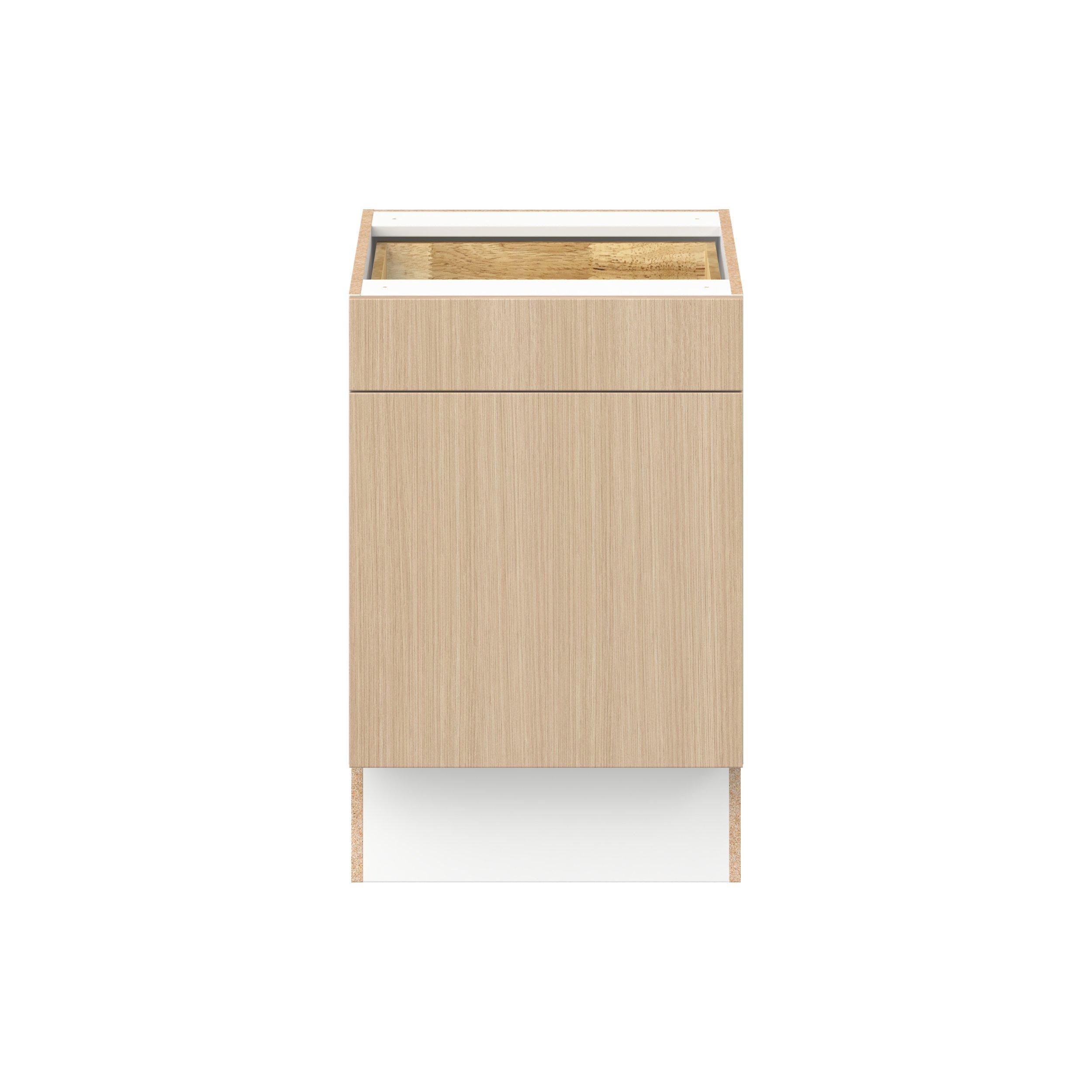 Elevate your project with the contemporary charm of Glenwood slab-style cabinets. Available in desert Mojavi oak and rich burnt walnut finishes, this collection captures the warmth and beauty of natural wood with the practicality of textured melamine. Crafted from one-piece MDF Studio Design Collection Glenwood 21 in. Mojavi Oak Door and Drawer Base Cabinet - ADA is designed to resist hairline cracks while the easy-to-clean finish stands up to stains and moisture. Featuring 5-piece doors and dovetail drawer joints, these cabinets offer durability and elegance. This collection combines style with everyday storage solutions.