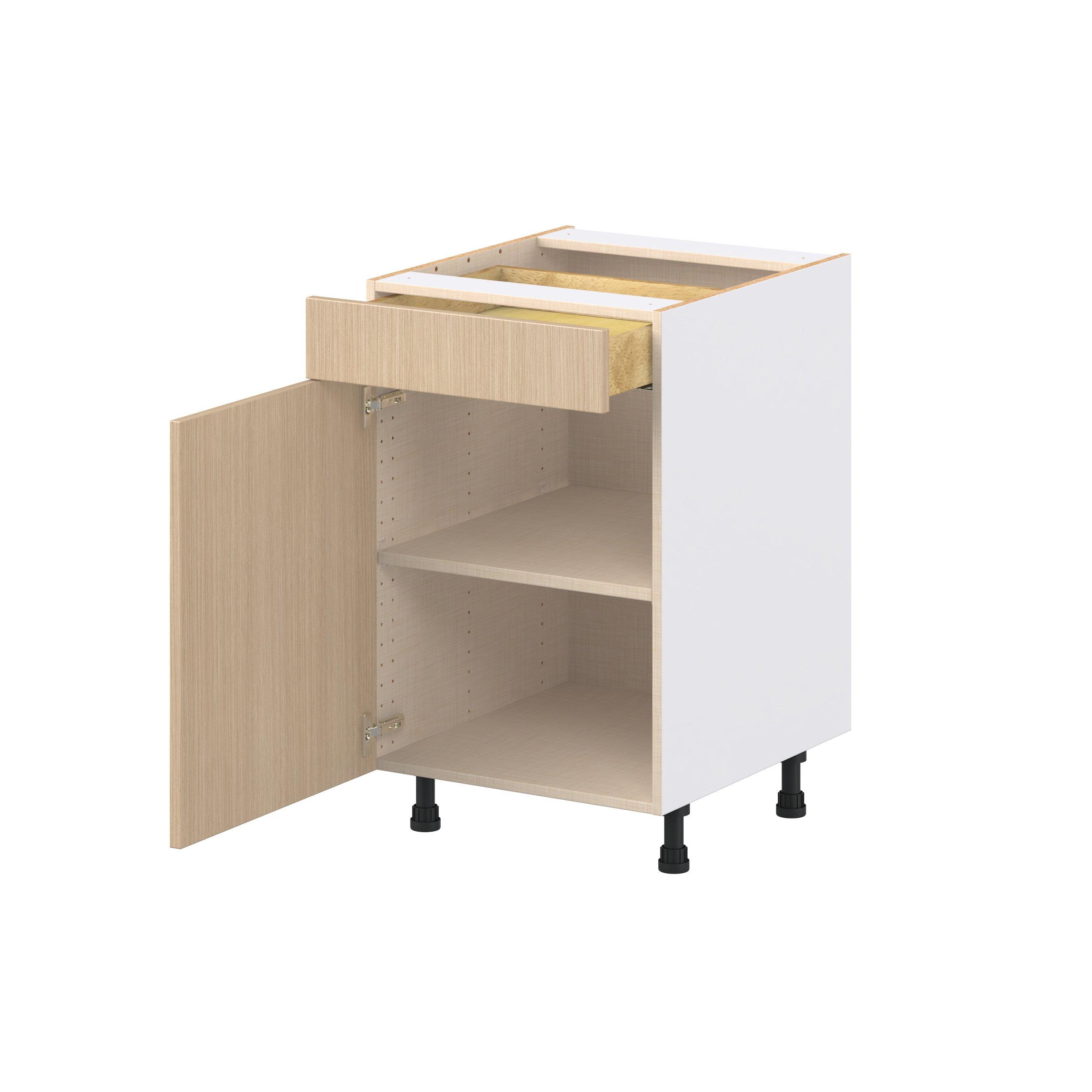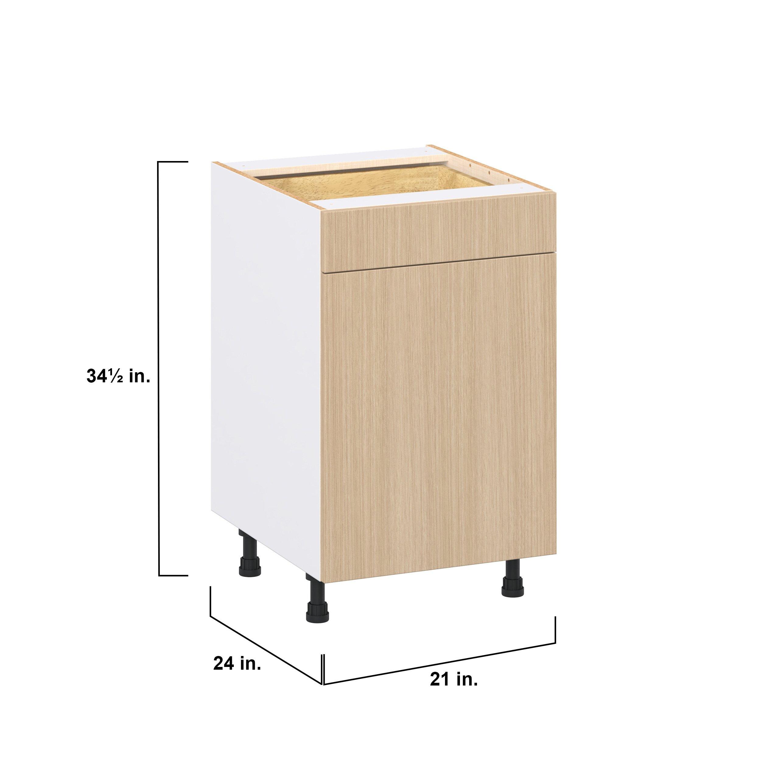 Elevate your project with the contemporary charm of Glenwood slab-style cabinets. Available in desert Mojavi oak and rich burnt walnut finishes, this collection captures the warmth and beauty of natural wood with the practicality of textured melamine. Crafted from one-piece MDF Studio Design Collection Glenwood 21 in. Mojavi Oak Door and Drawer Base Cabinet is designed to resist hairline cracks while the easy-to-clean finish stands up to stains and moisture. Featuring 5-piece doors and dovetail drawer joints, these cabinets offer durability and elegance. This collection combines style with everyday storage solutions.